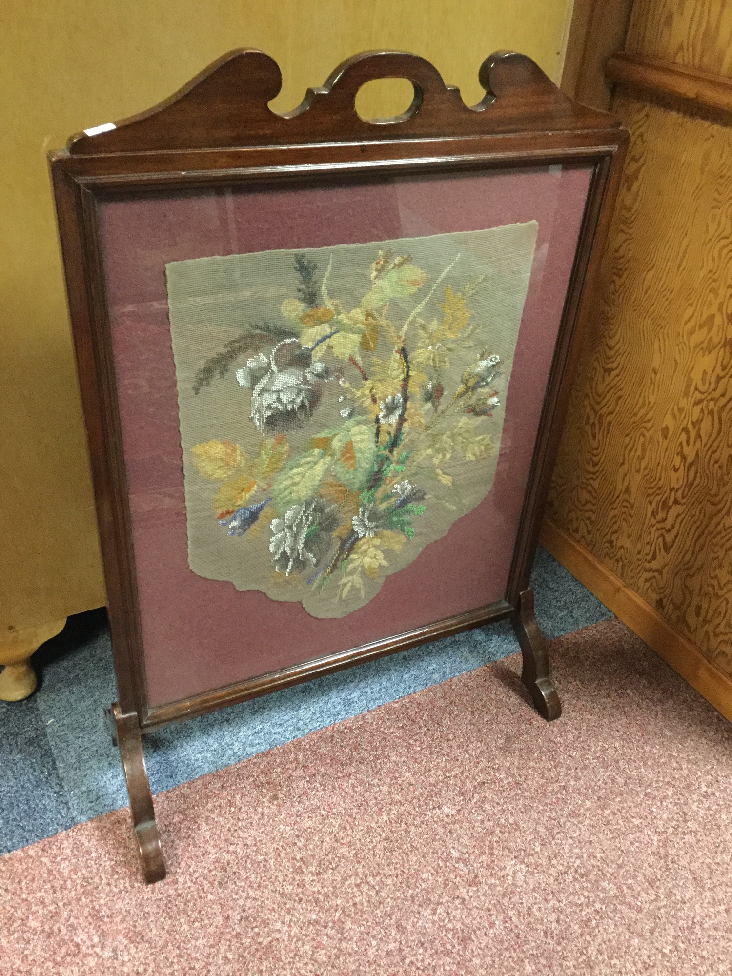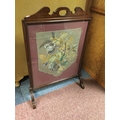 A mahogany framed firescreen, inset with needlework and beadwork panel -