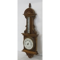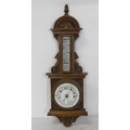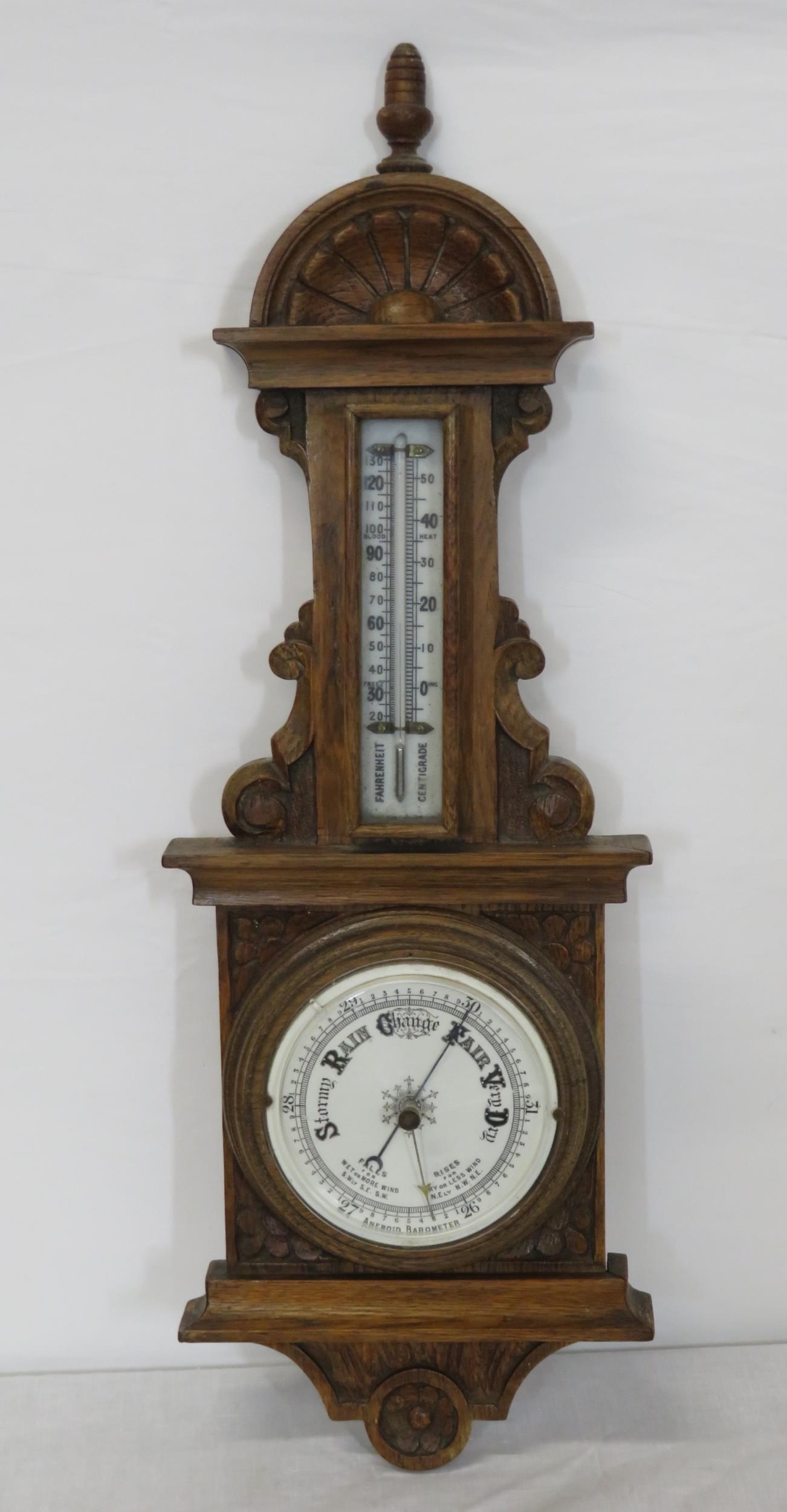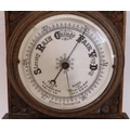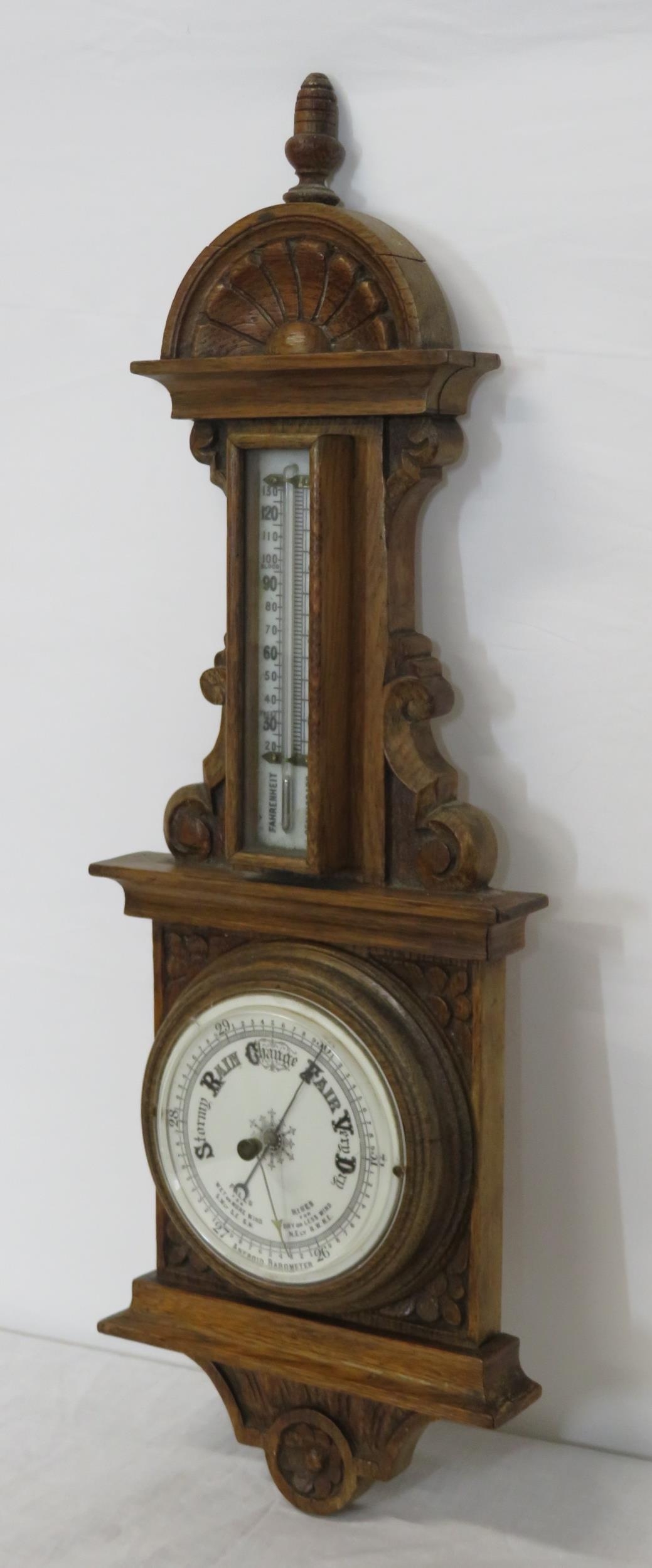 Edwardian oak cased aneroid barometer with thermometer, scroll carving