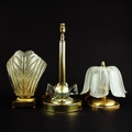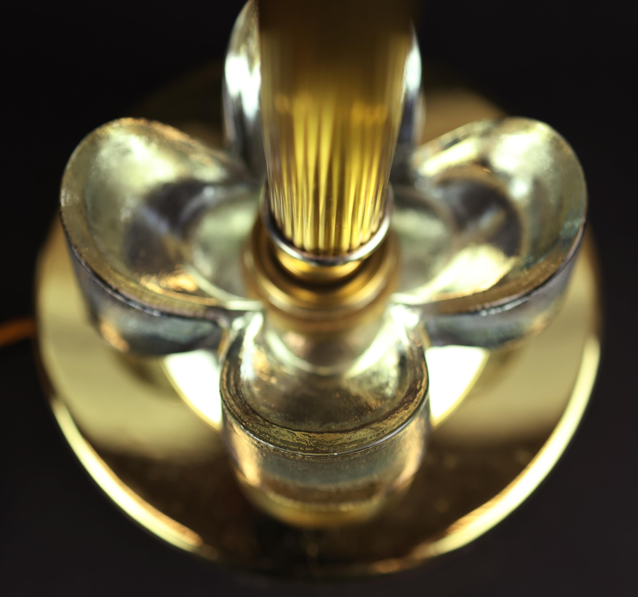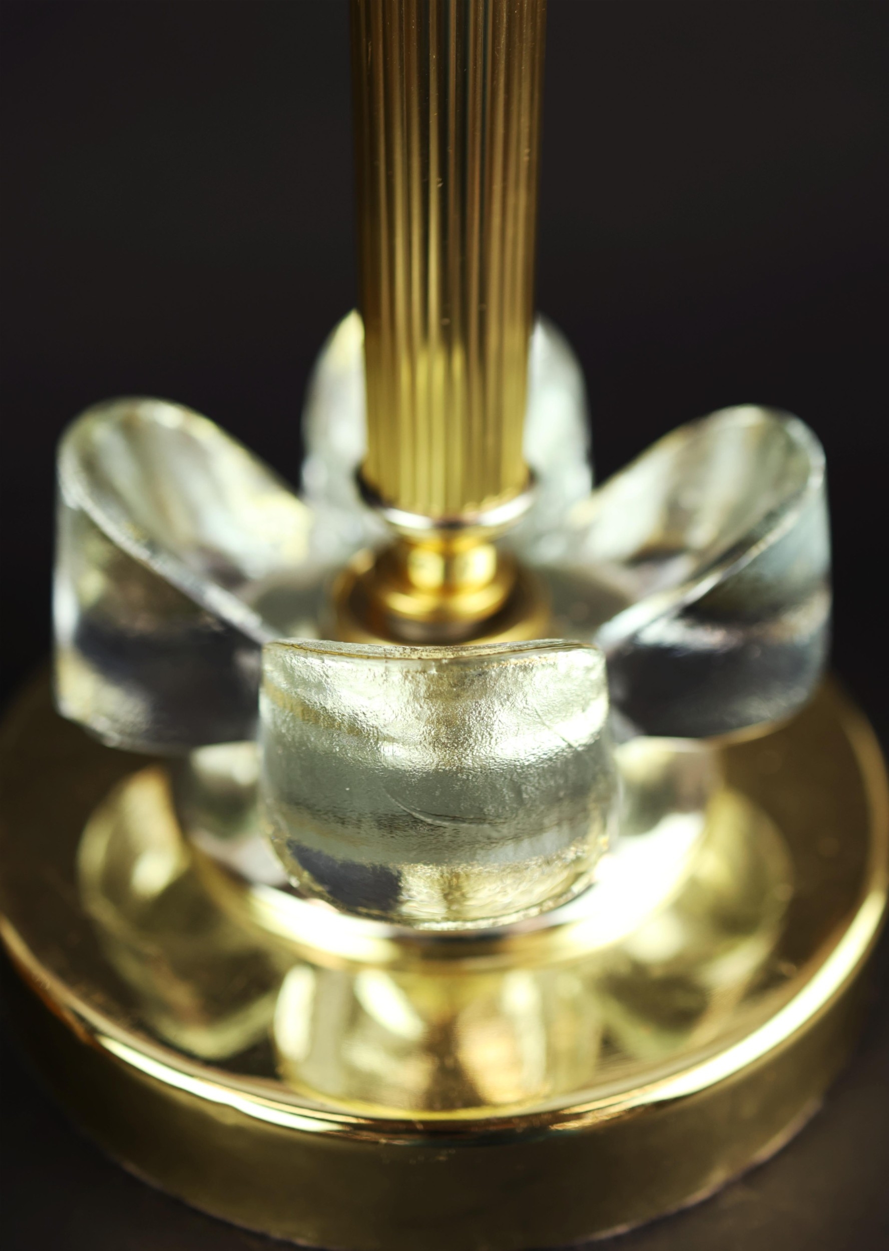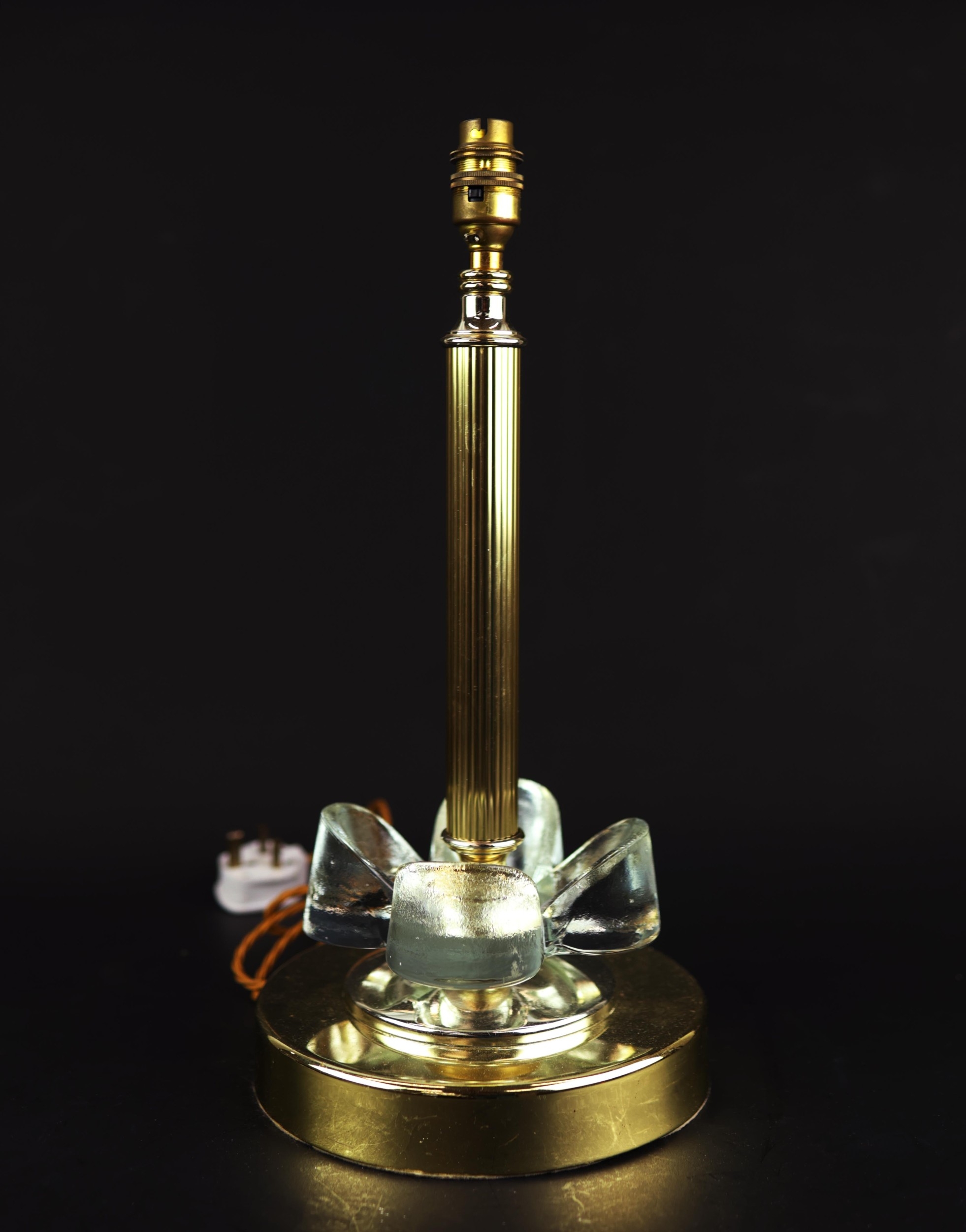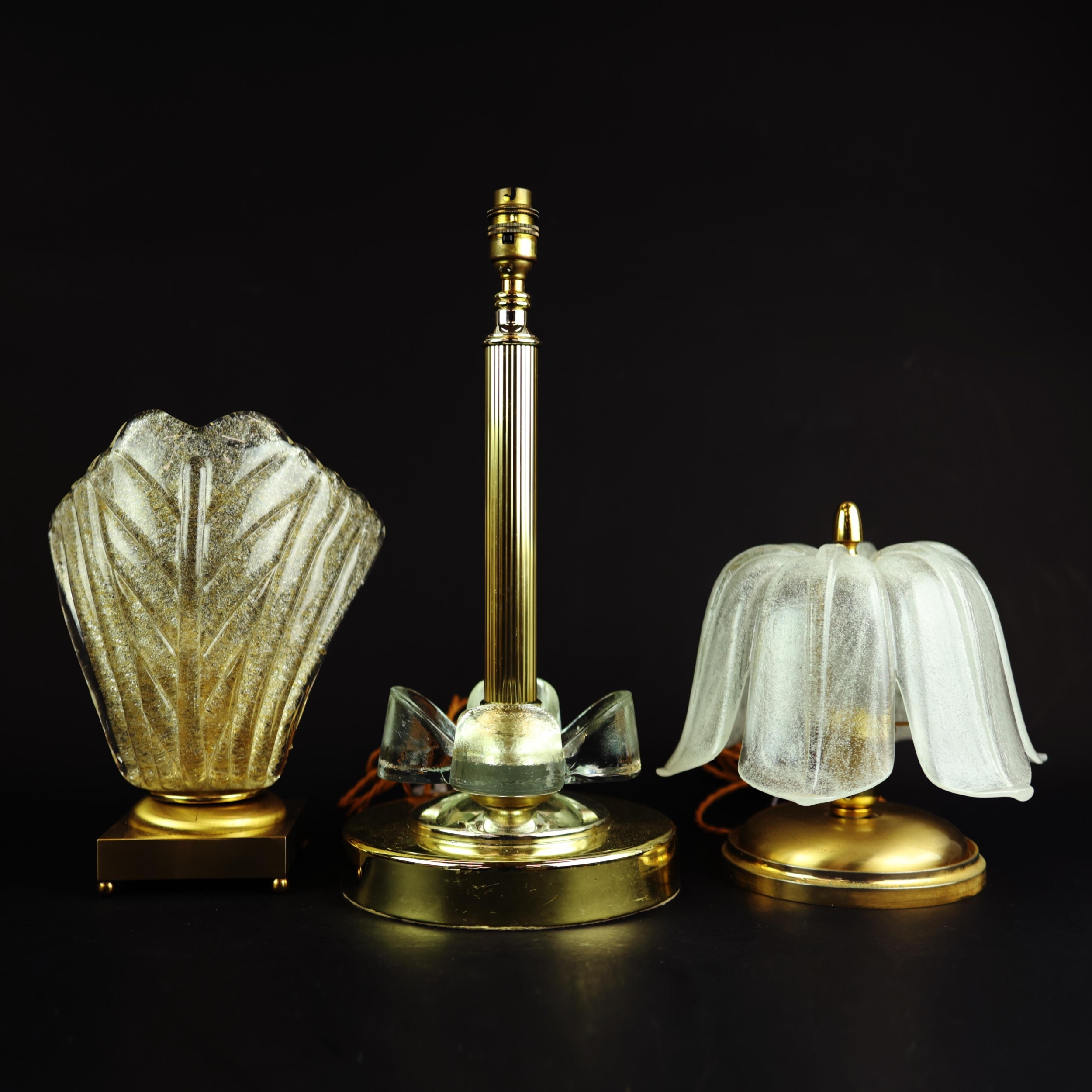 SET OF THREE MID CENTURY CONTINENTAL GLASS AND GILT METAL TABLE LAMPS. Largest 34cm H x 20cm W.
