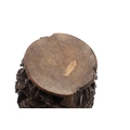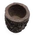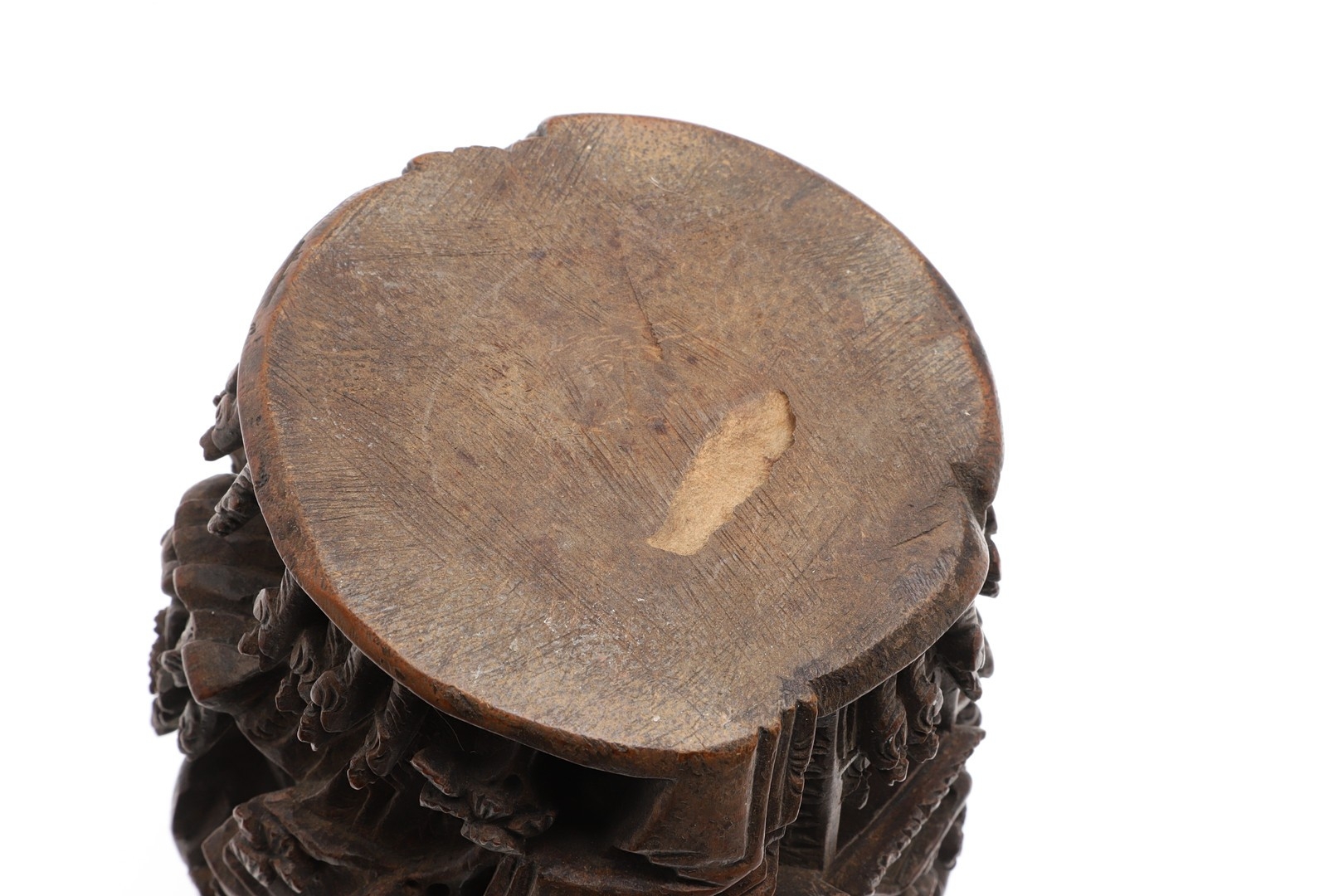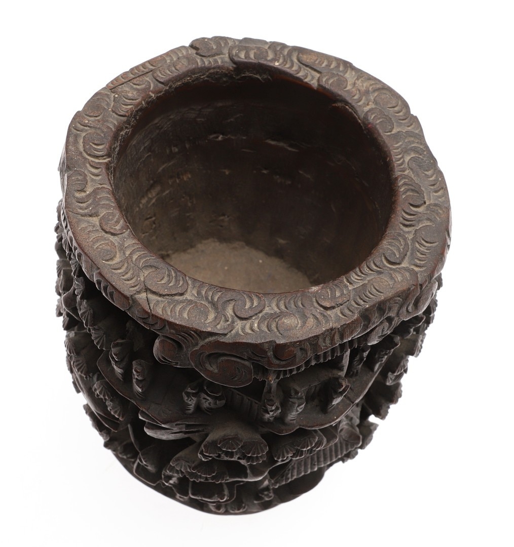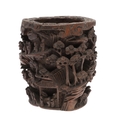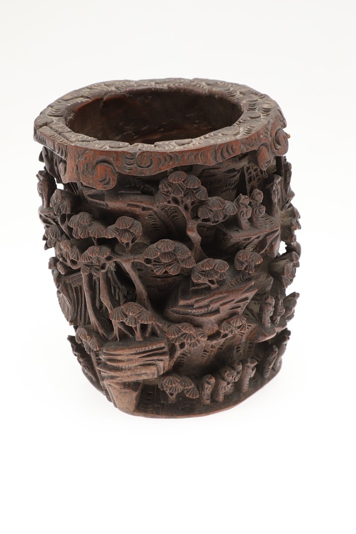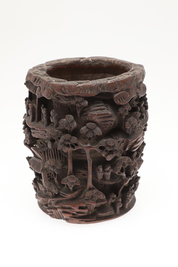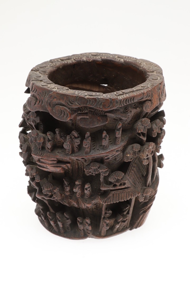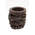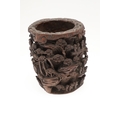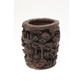 CHINESE BAMBOO BRUSH POT. 19thc, of circular form and carved with a variety of figures amongst trees and pavilions. 15cms high.