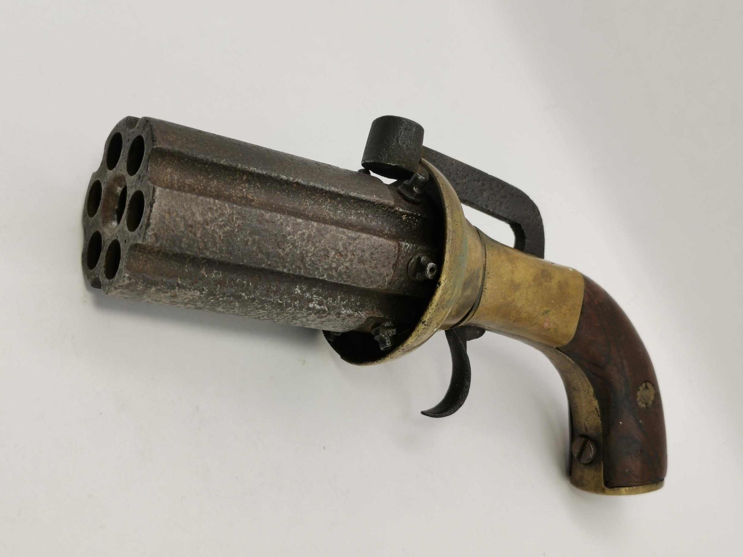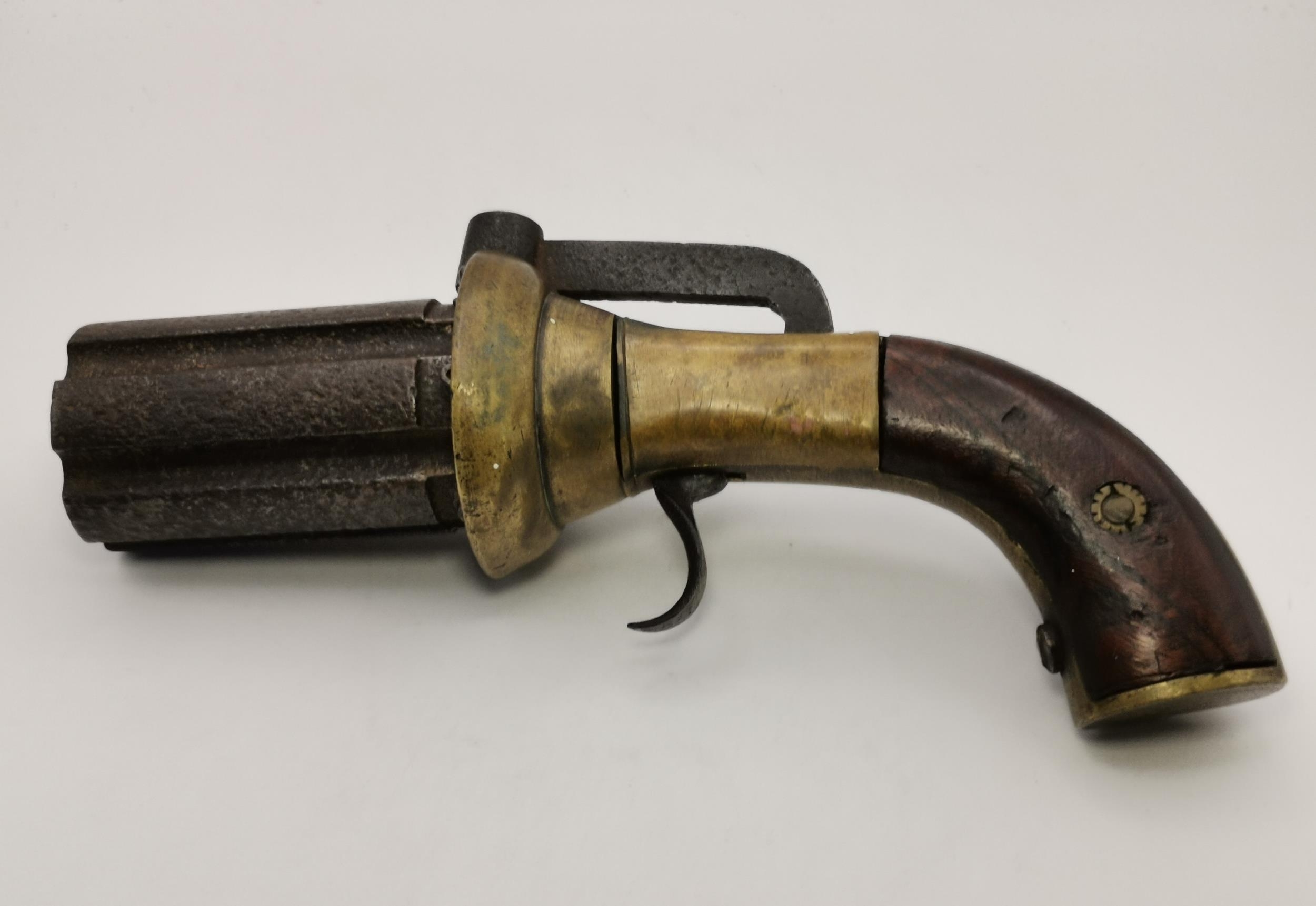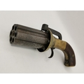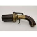 An antique pepperbox six-shot percussion revolving pistol, unmarked, with brass furniture, (a/f). 4.5cm cylinder, 22cm long overall