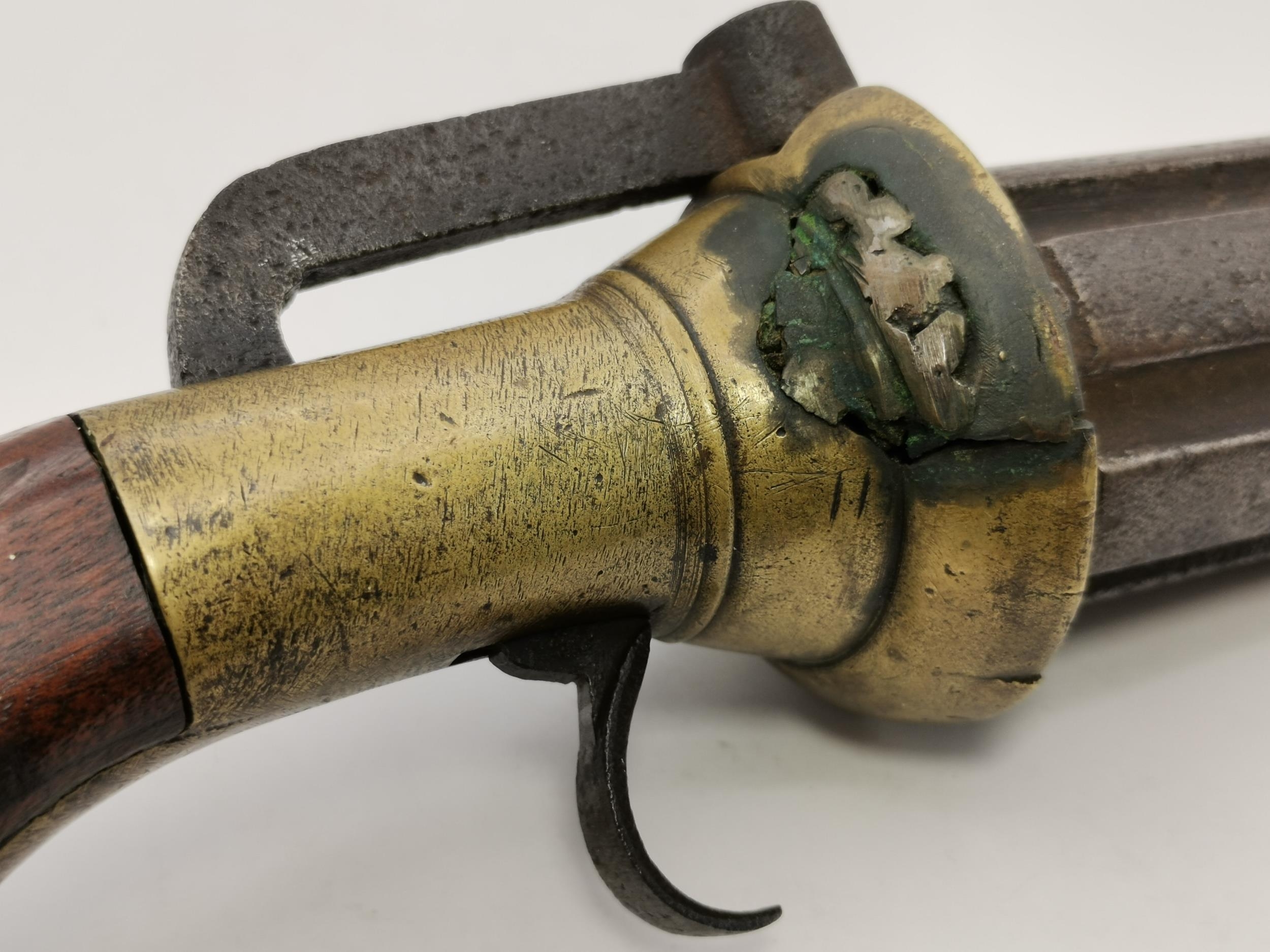 Fair: In fair condition, signs of wear/cracks/damage/restoration. Action appears to be in working order. End screw keeping barrels cylinder attached is deficient. Brass side panel not fixed, comes off readily. Soldered repair to right side of flared guard. This report is based solely on our own opinion and is for guidance only. No responsibility is accepted for its accuracy. Intending buyers are strongly encouraged to view prior to bidding.
