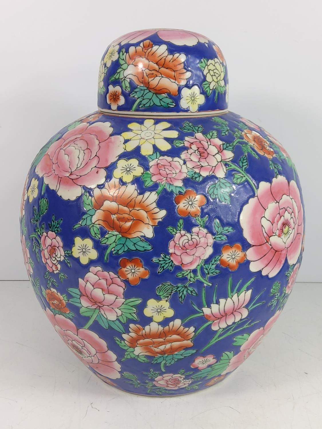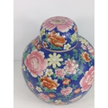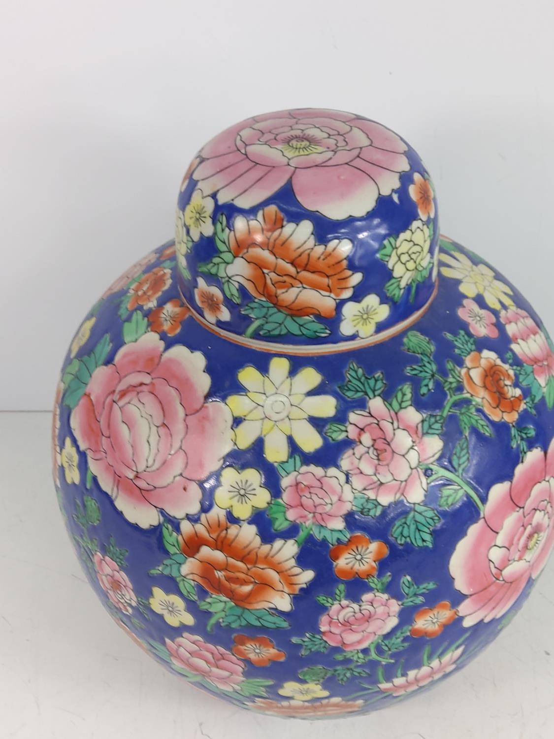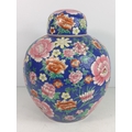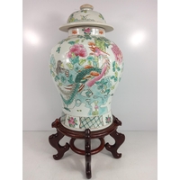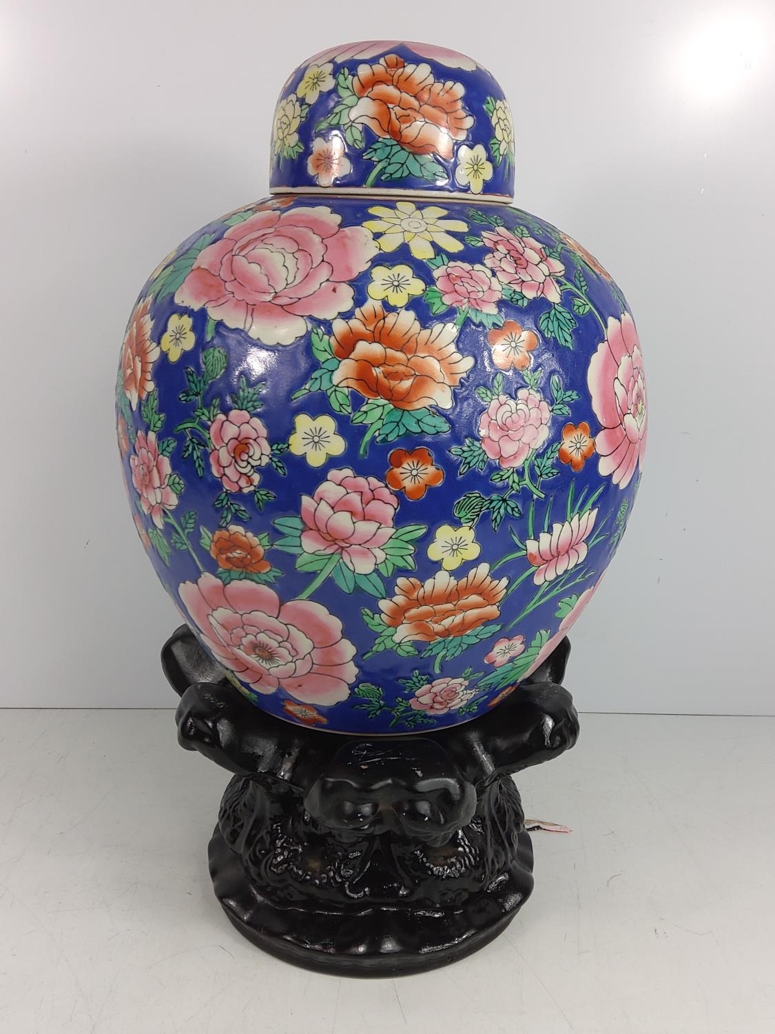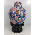 Oriental ginger jar with wooden base, approx 46cms on base, 32cms off base