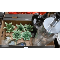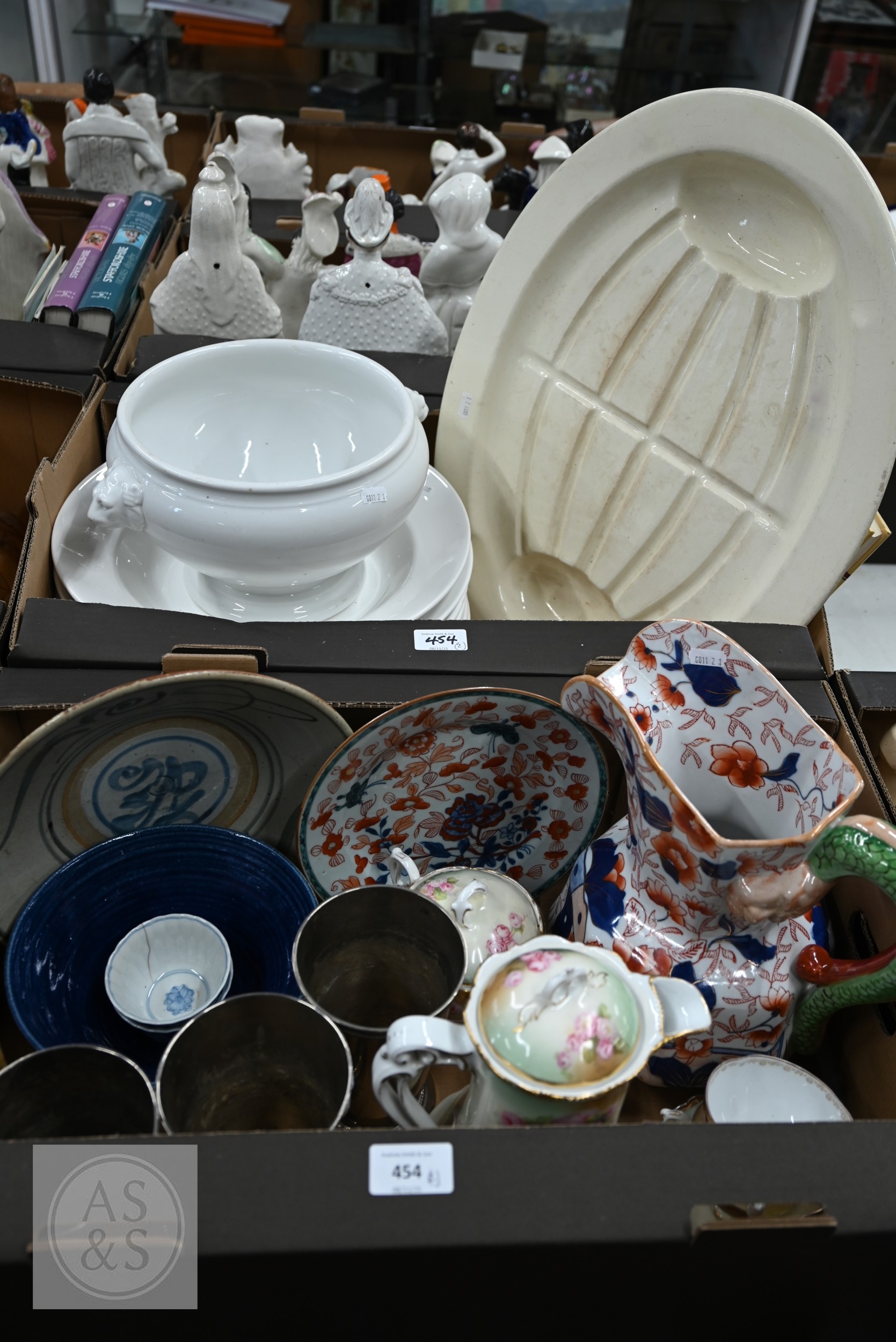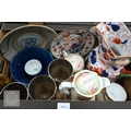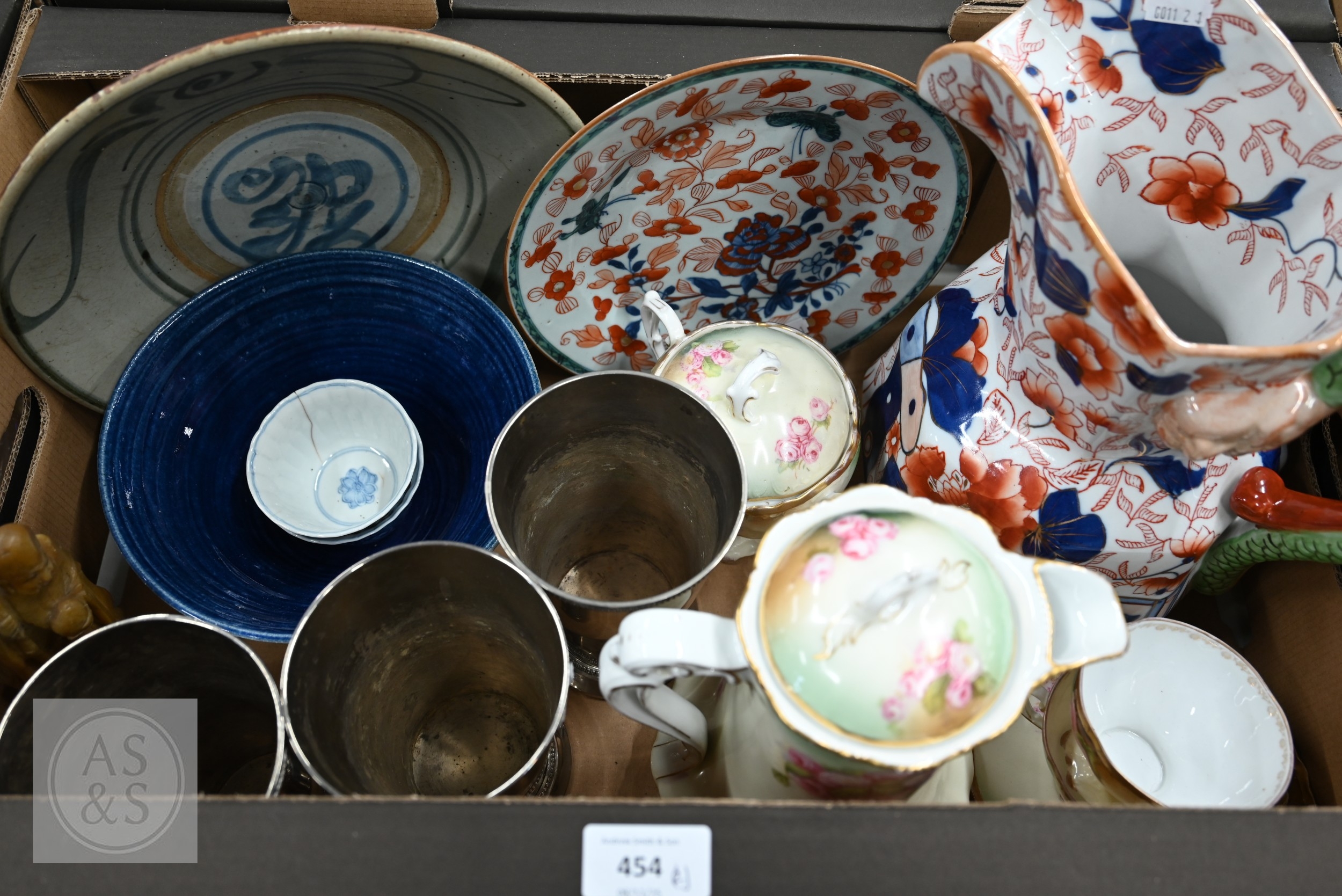 A large Masons-type ironstone jug for Ringtons Tea Merchants, Newcastle Upon Tyne, to/w a small selection of Asian ceramics, three electroplated tapering vases and various domestic ceramics, etc (2 boxes)