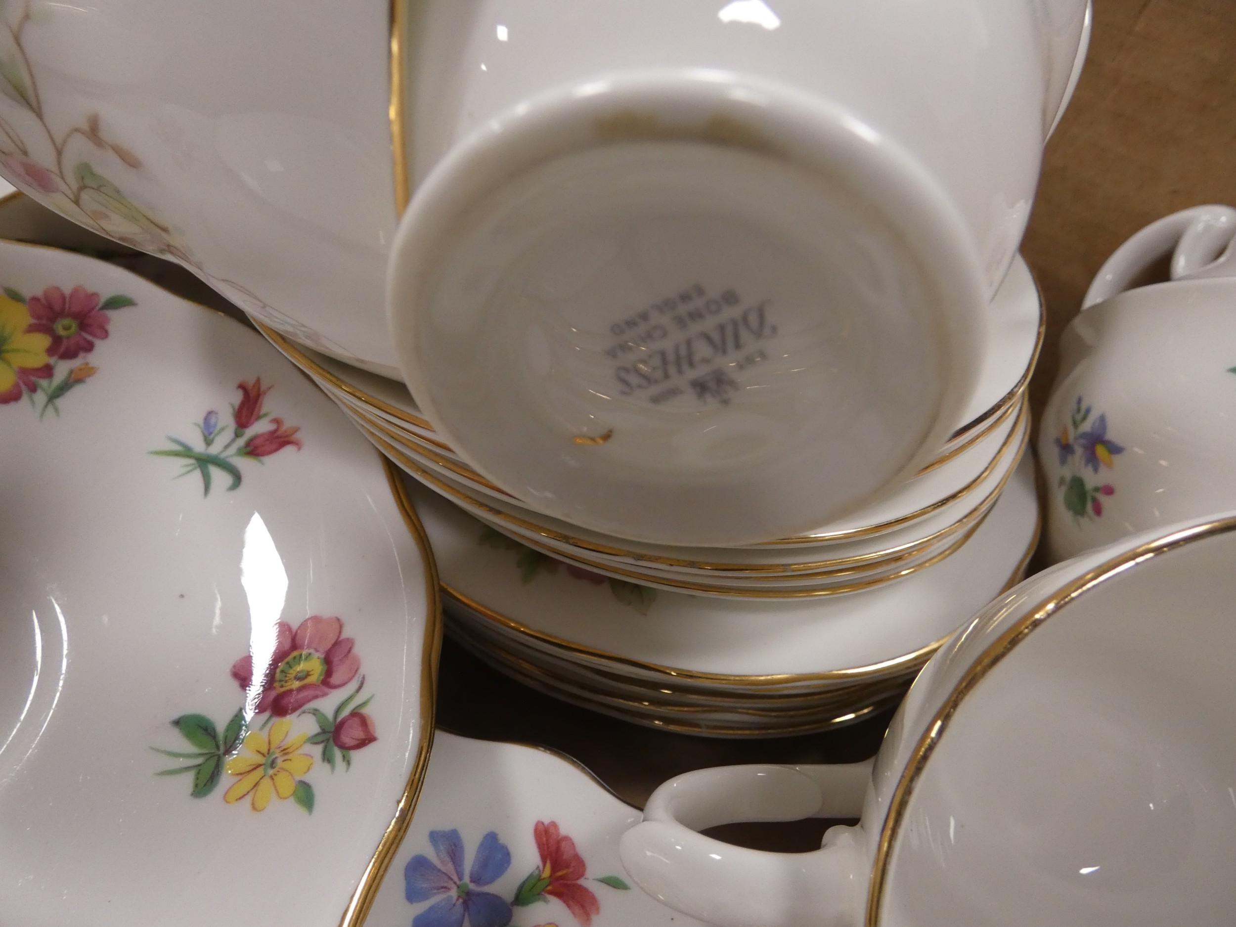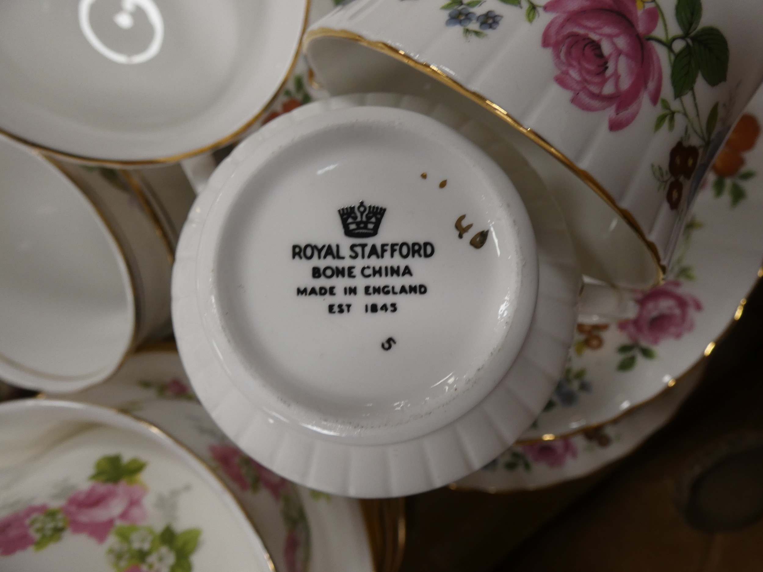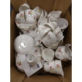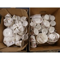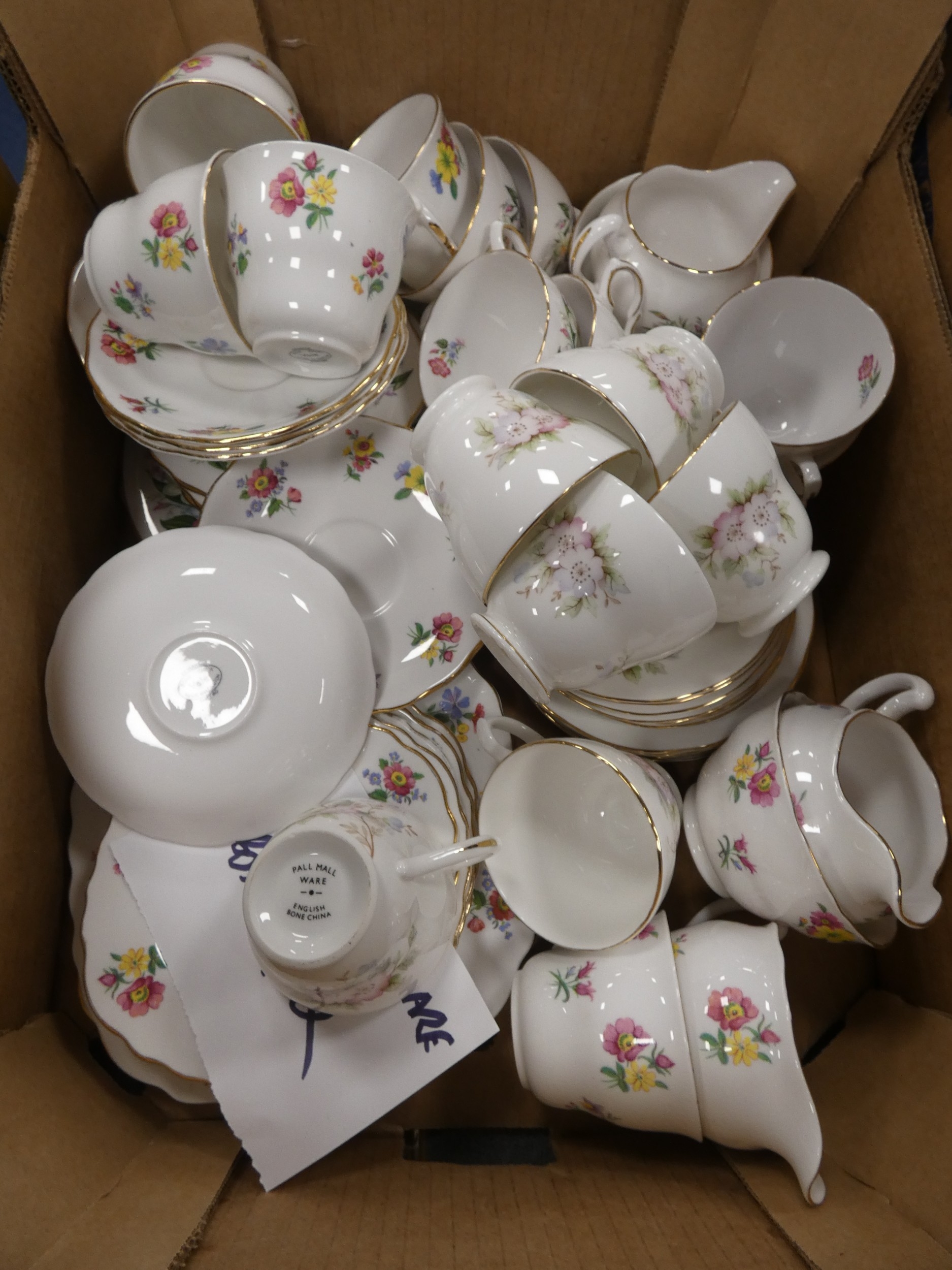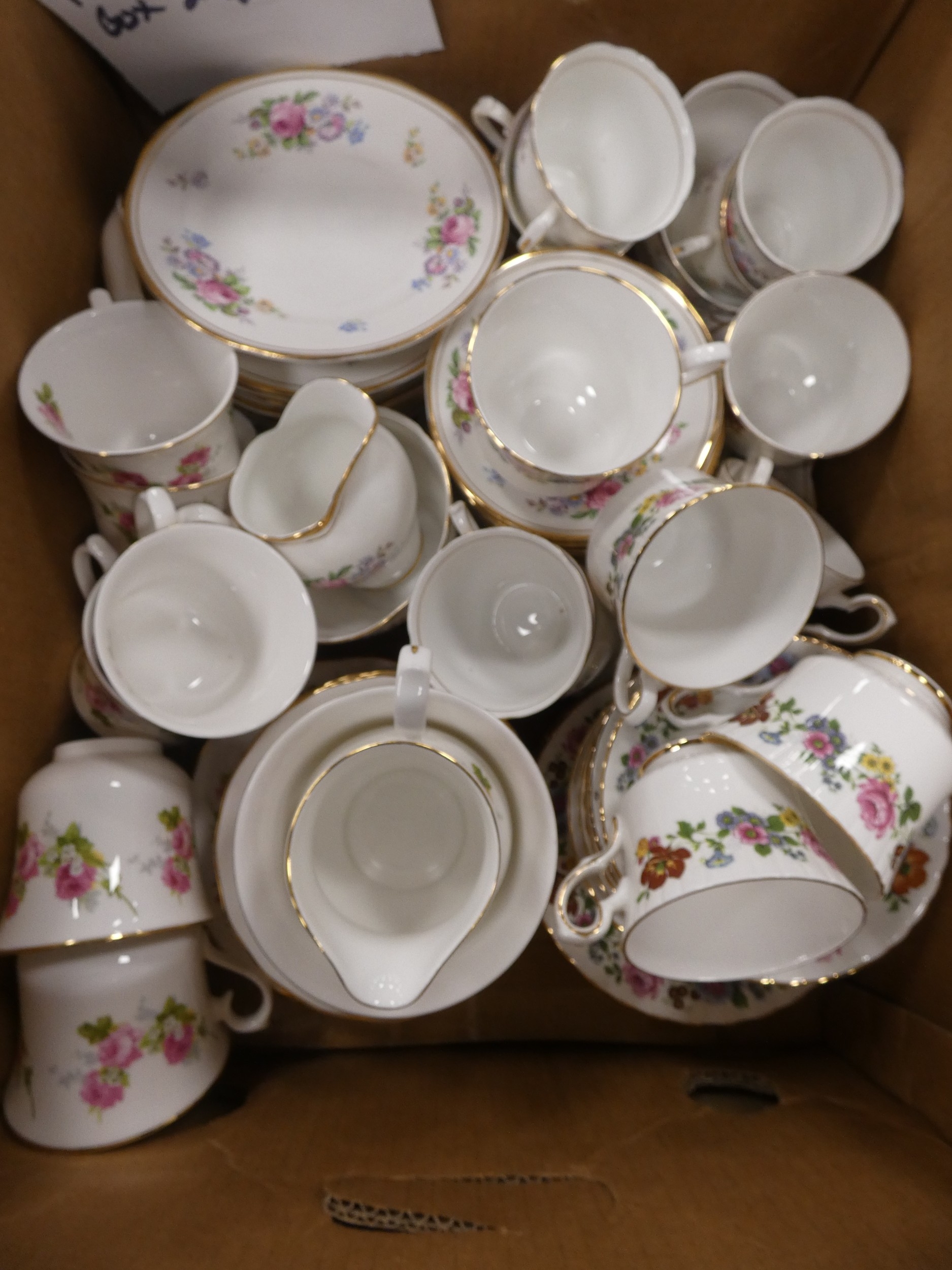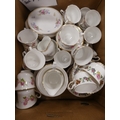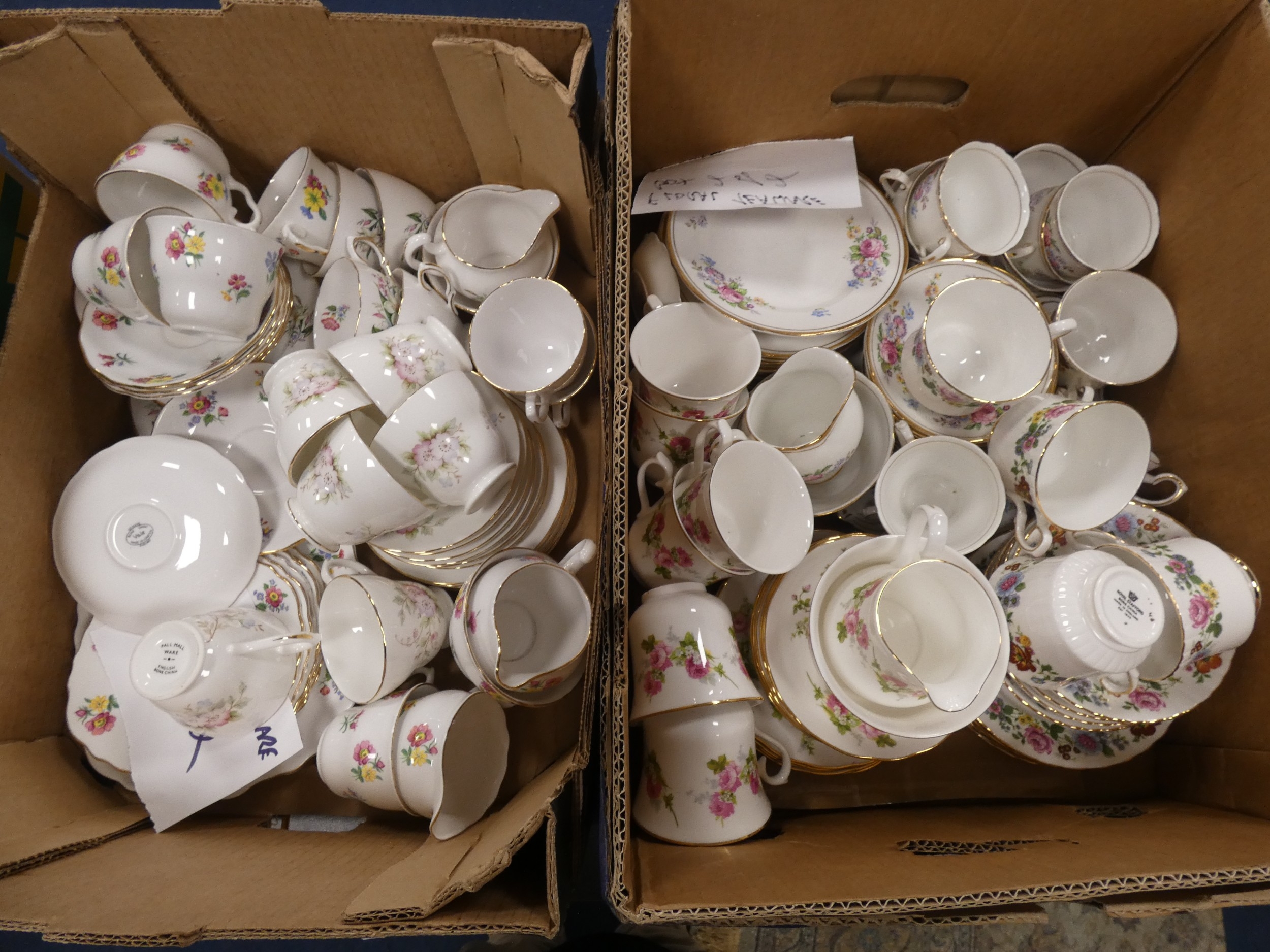 Two cartons containing assorted floral decorated china tea and dinnerwares to include Pall Mall, Vale, Royal Stafford etc.