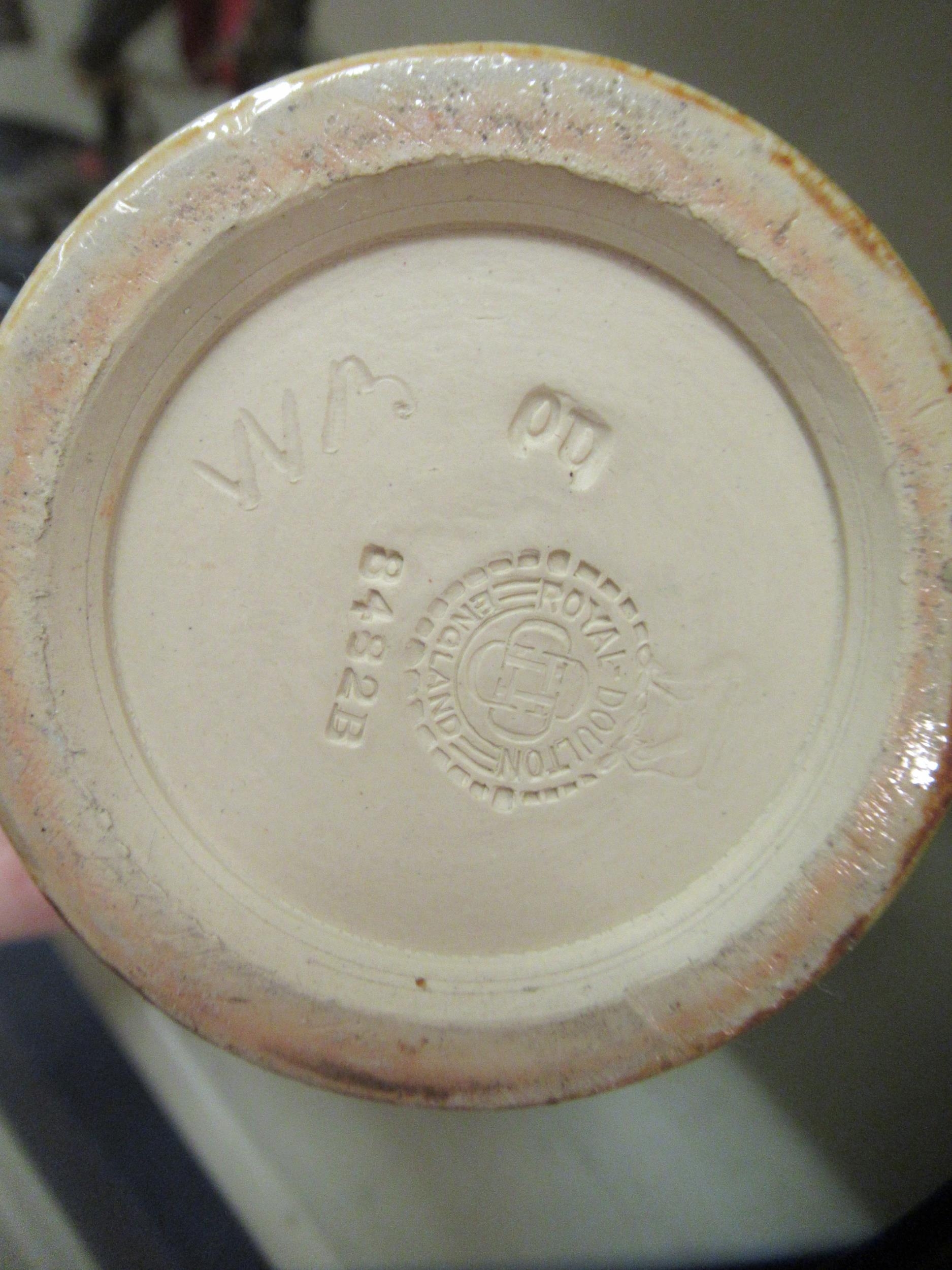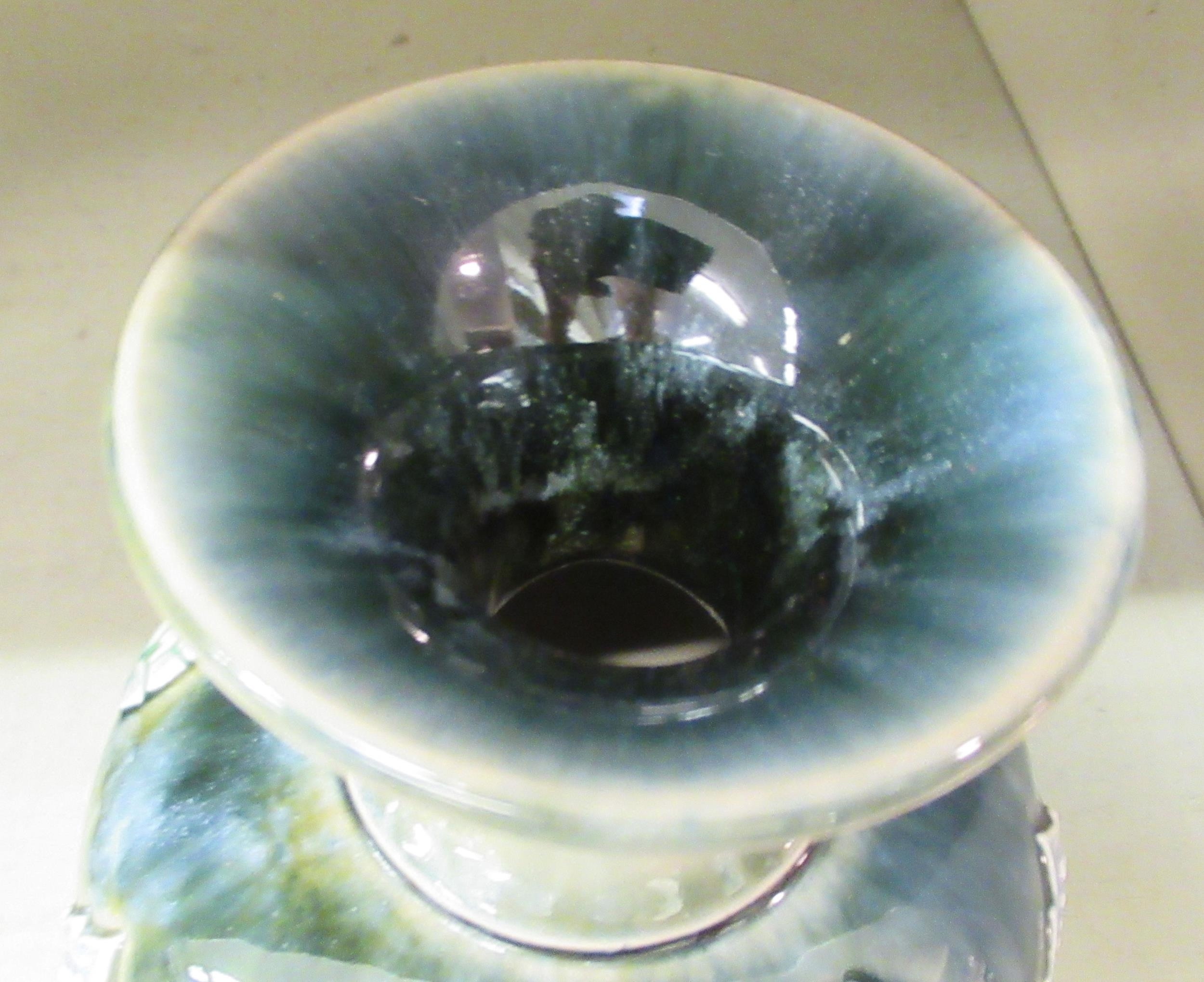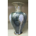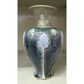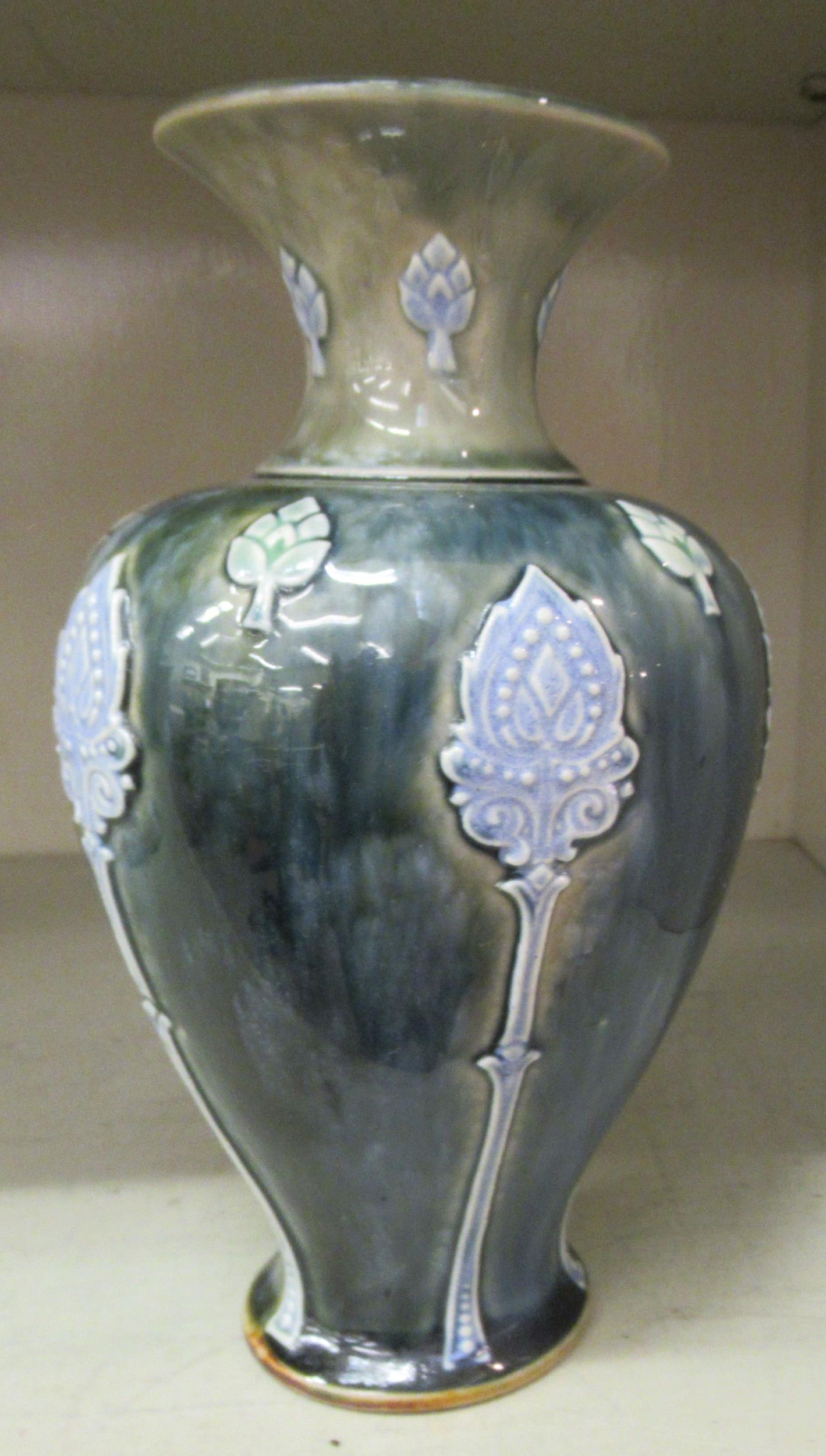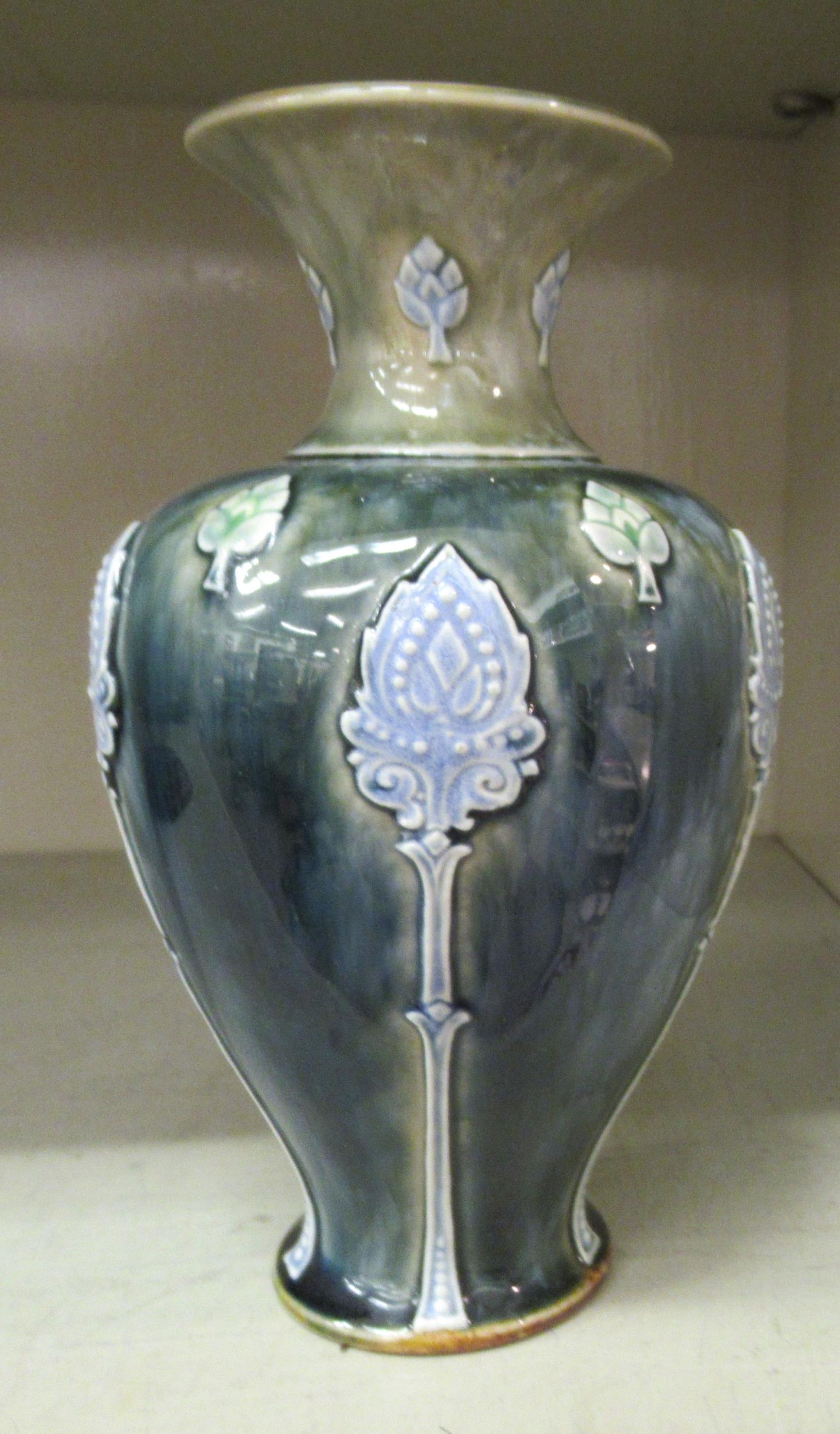 A Royal Doulton green and blue glazed stoneware vase of baluster form, decorated with moulded floral and foliate designs 8"h