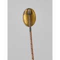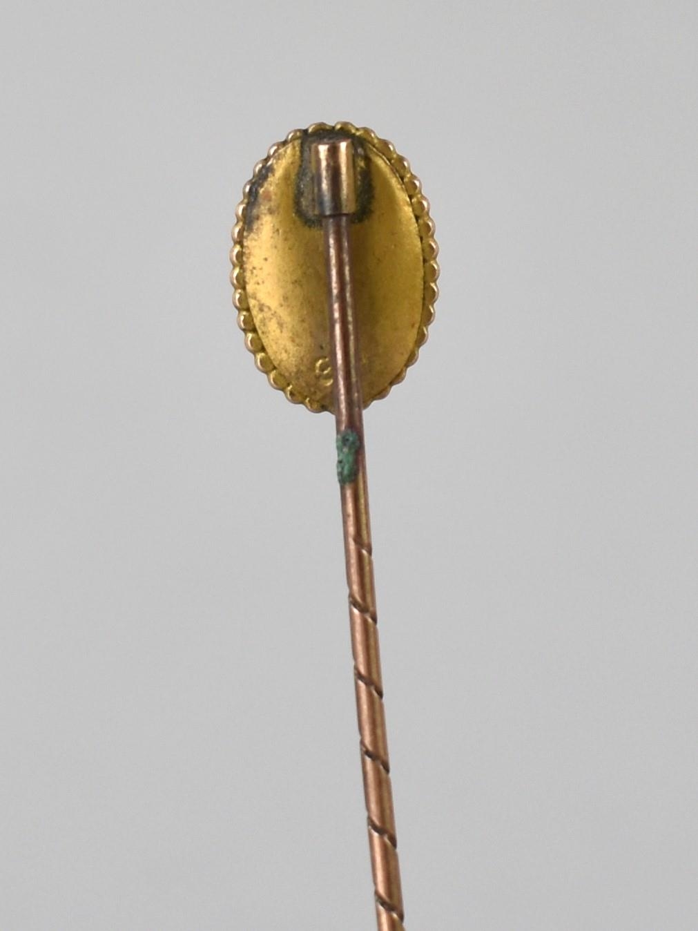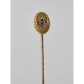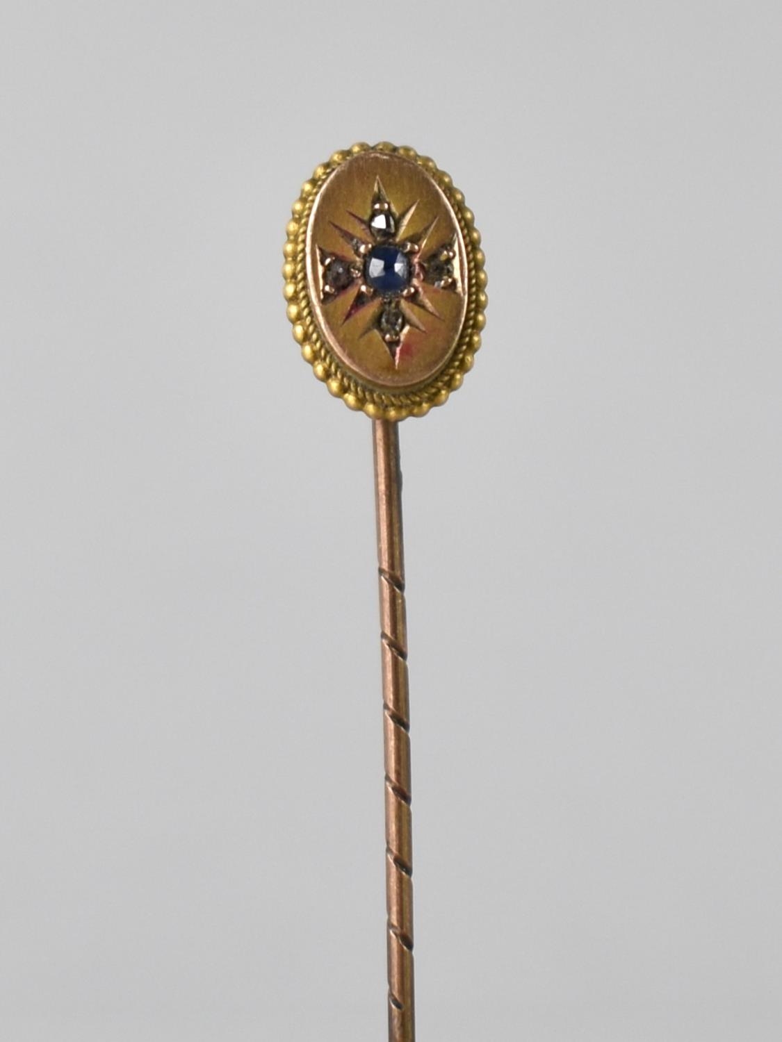 A Yellow Metal Stick Pin, Mounted with Old Round Cut Sapphire, 1.6mm Diameter, Milgrain Set with Four Small Rose Cut Diamonds in Cruciform Pattern, Mounted in Raised Oval Panel with Rope Edge Border Measuring 11mm by 8mm, Stamped 9ct Verso
