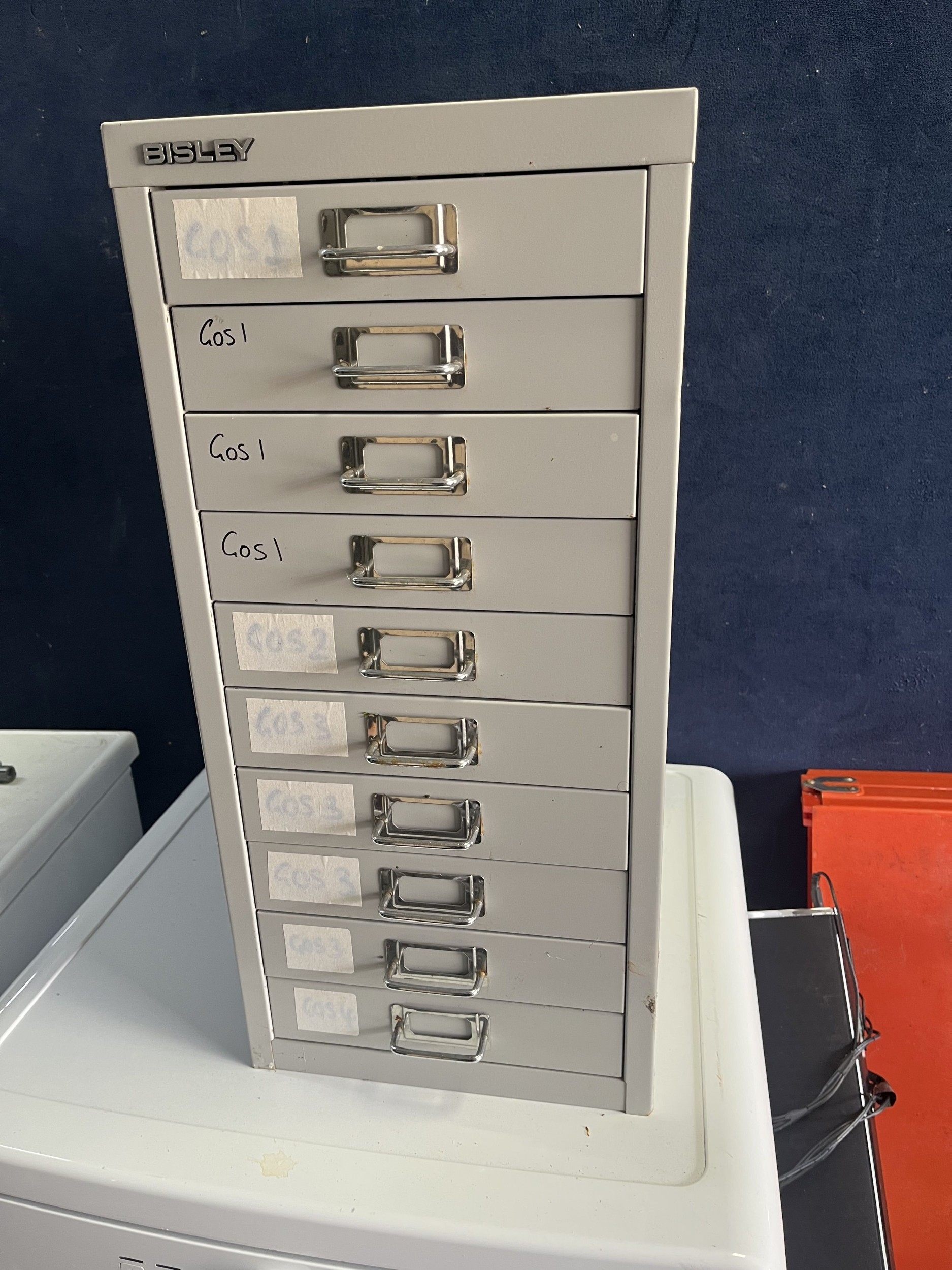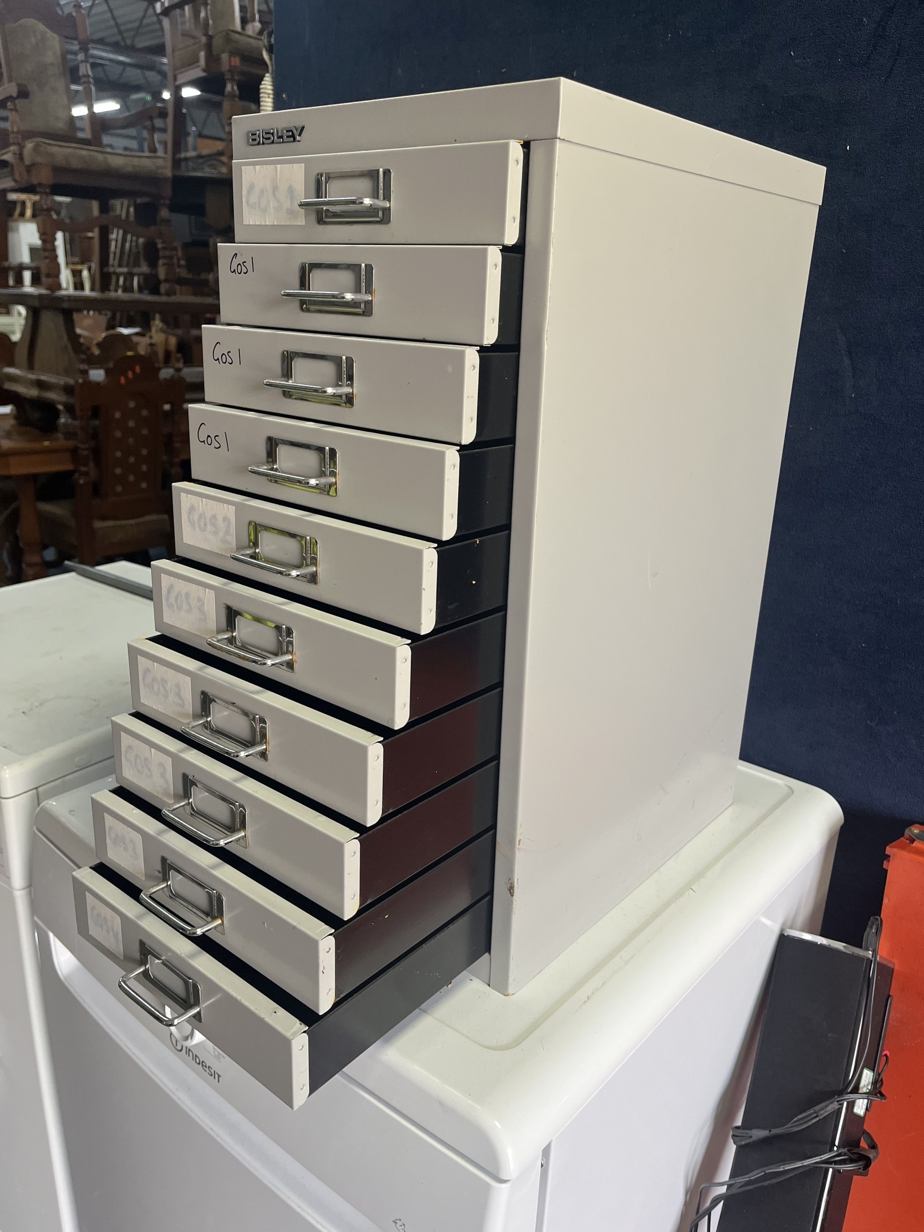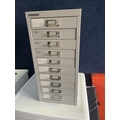 A BISLEY TEN DRAWER FILING CABINET, width 28cm, depth 40cm, height 59cm