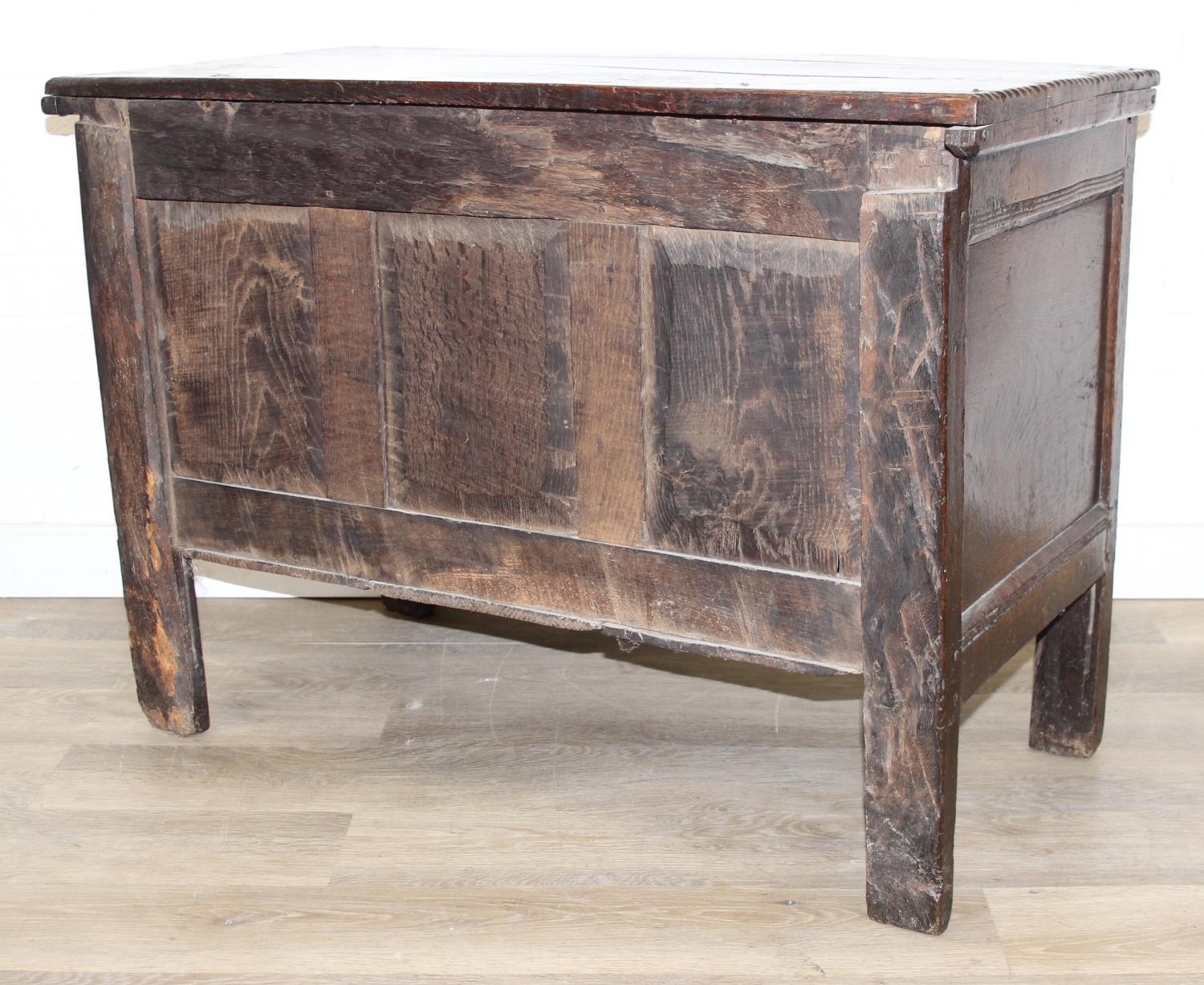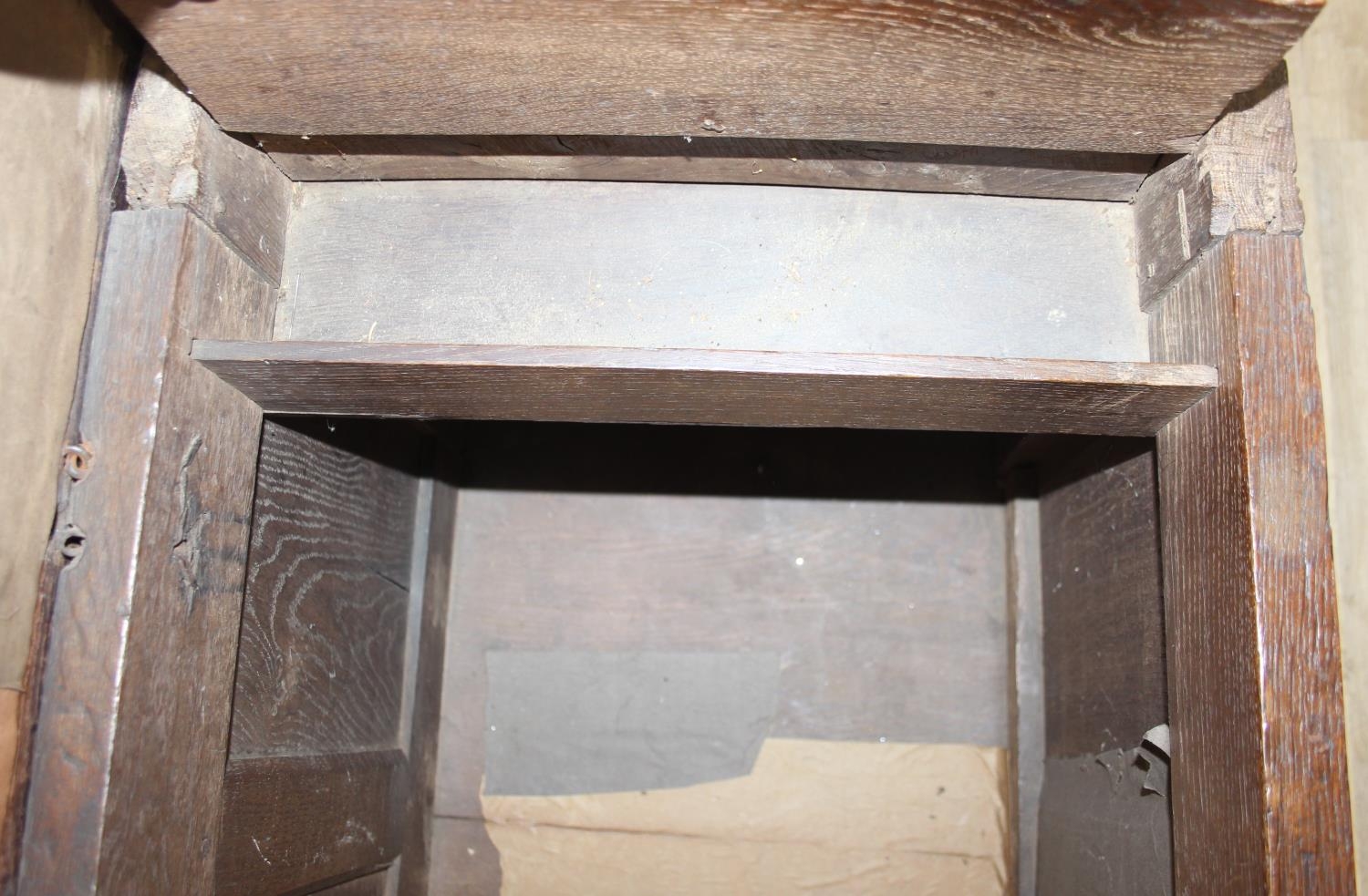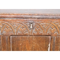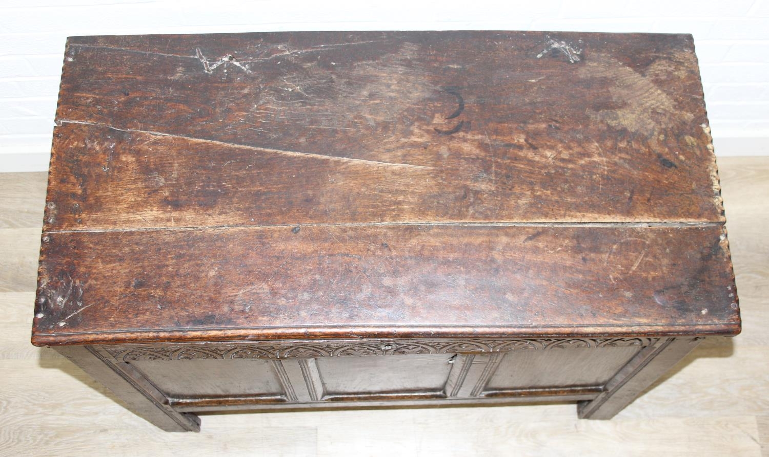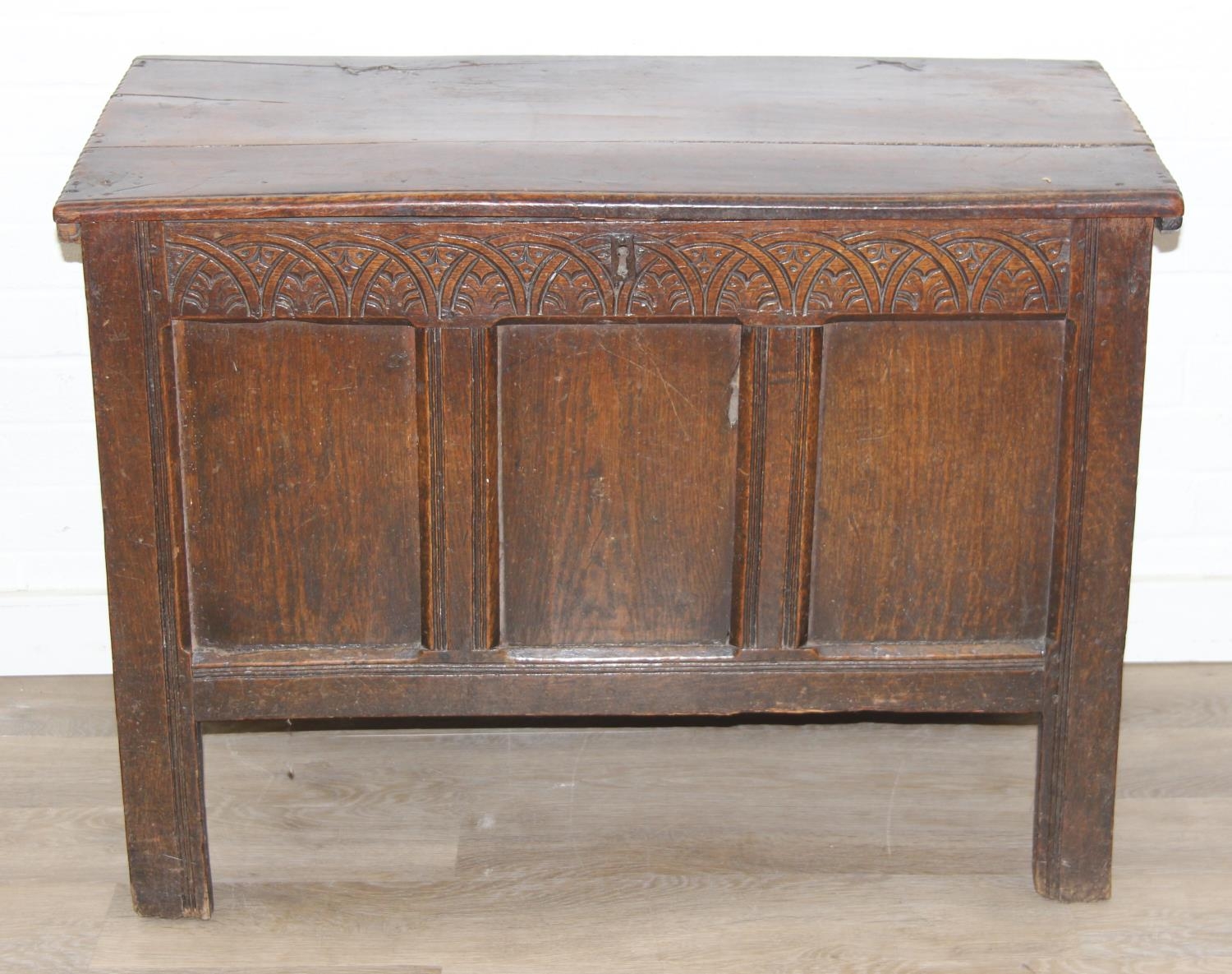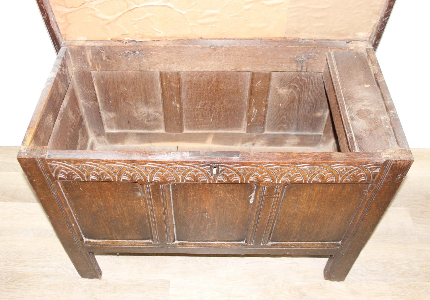 An antique oak coffer with carved details and candle box to interior, likely 18th century, unusual small proportions, 98cm x 49cm x 70cm