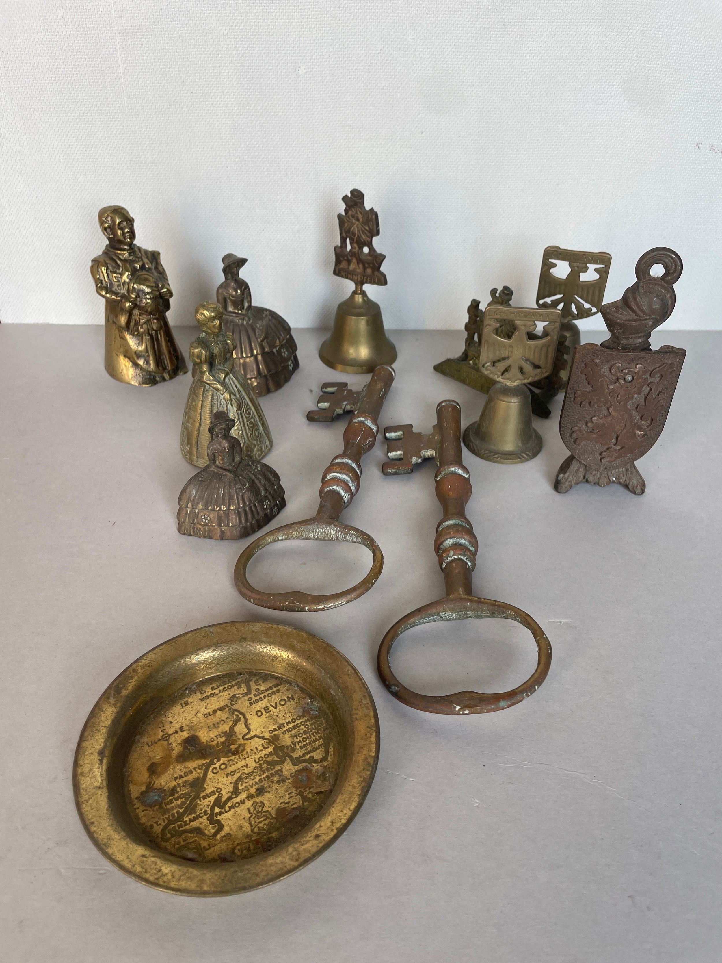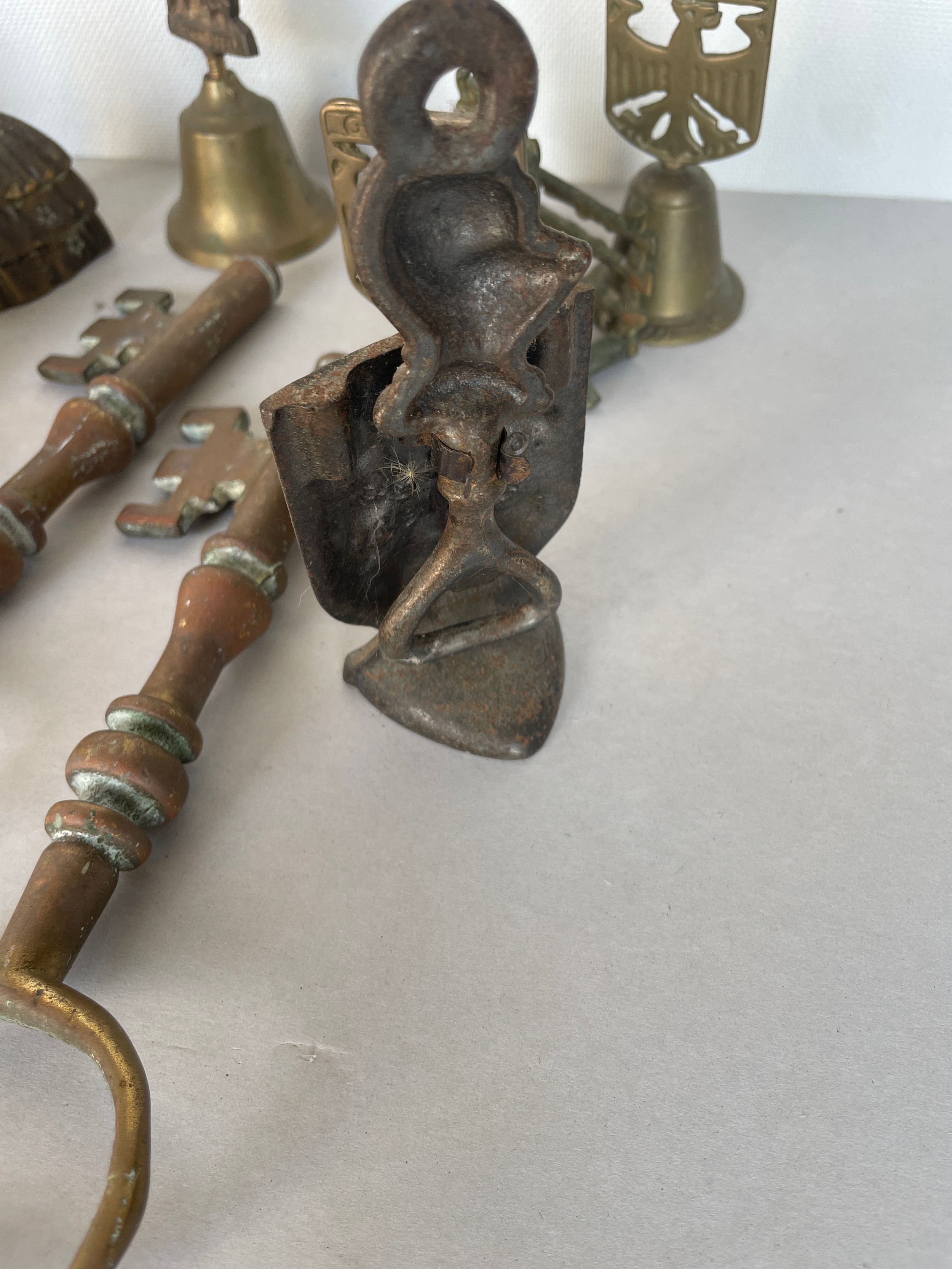 A quantity of brass items including keys and bells
