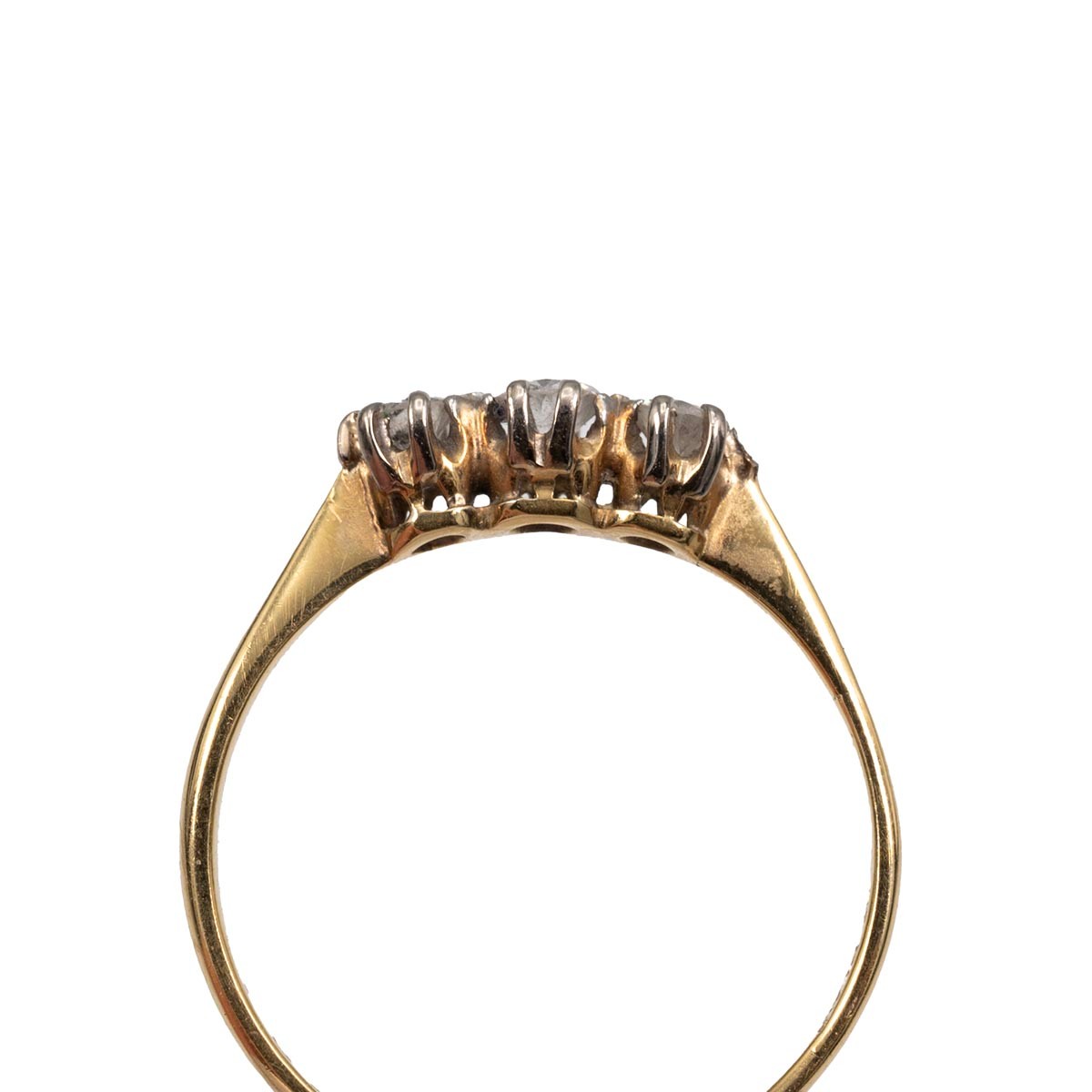 18ct three stone brilliant cut diamond ring, centre stone approx 0.10ct, flanked by two diamonds approx 0.07ct, size R, weight 1.8 grams.