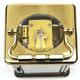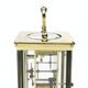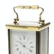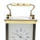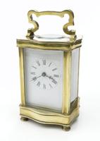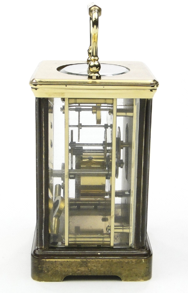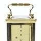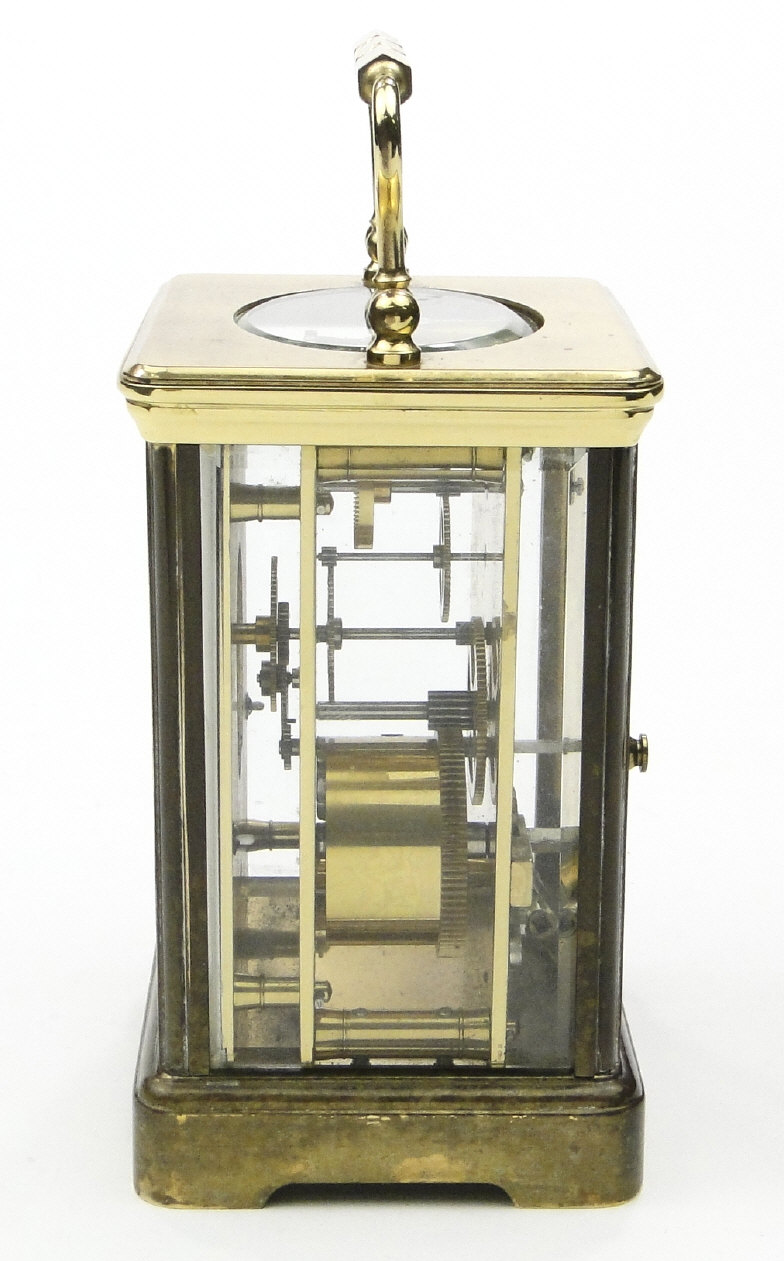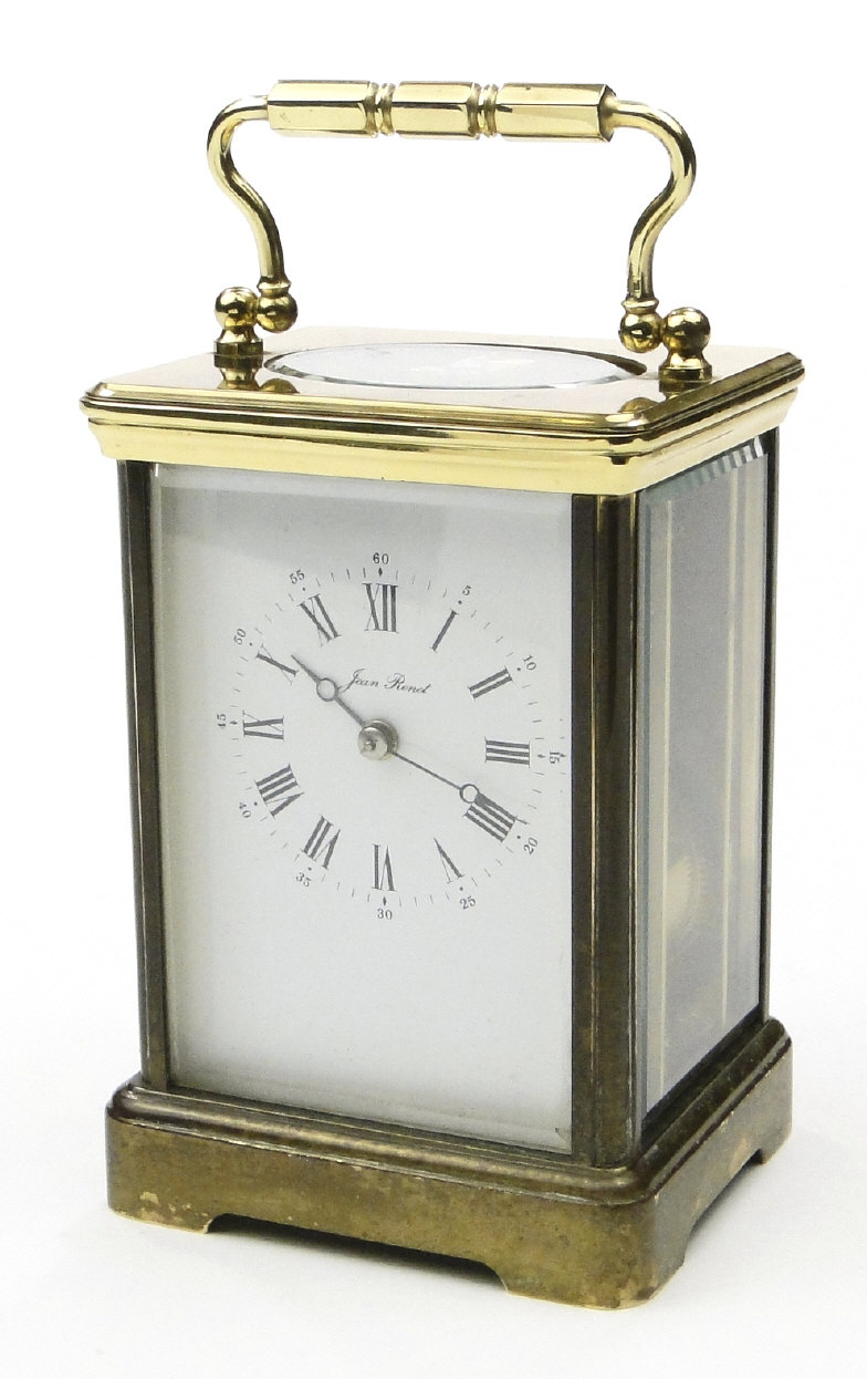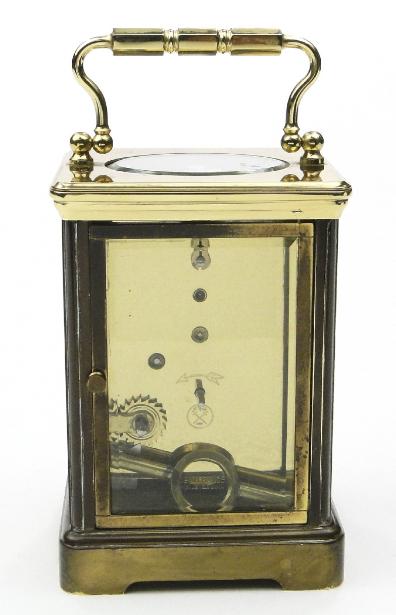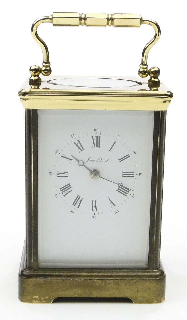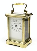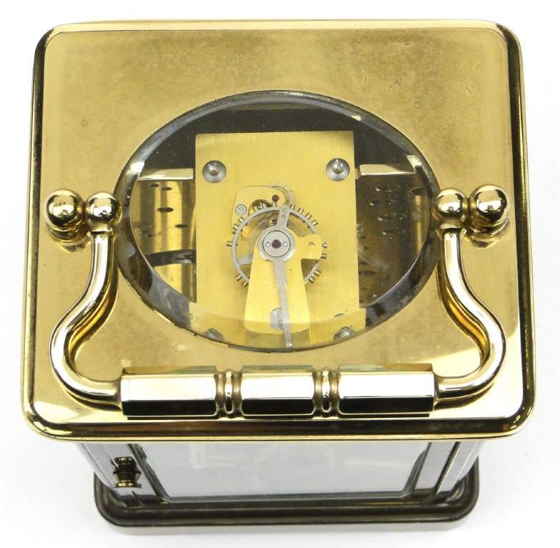 Brass cased carriage clock with swing handle and bevelled glass panels, the enamel dial with black Roman numerals, 14cm high