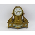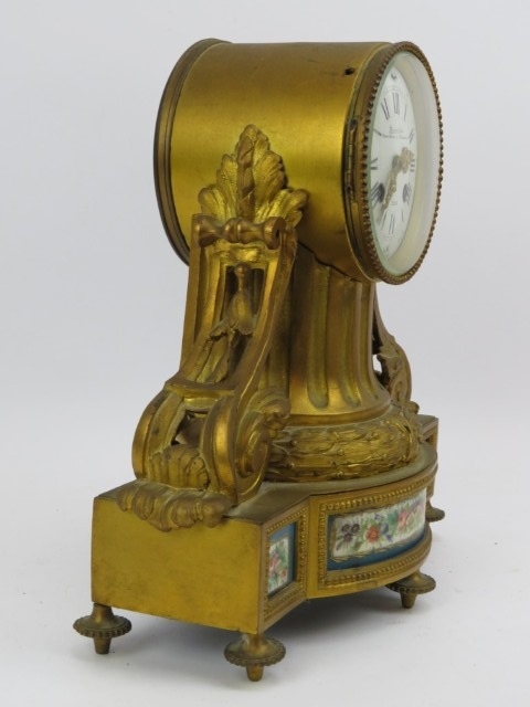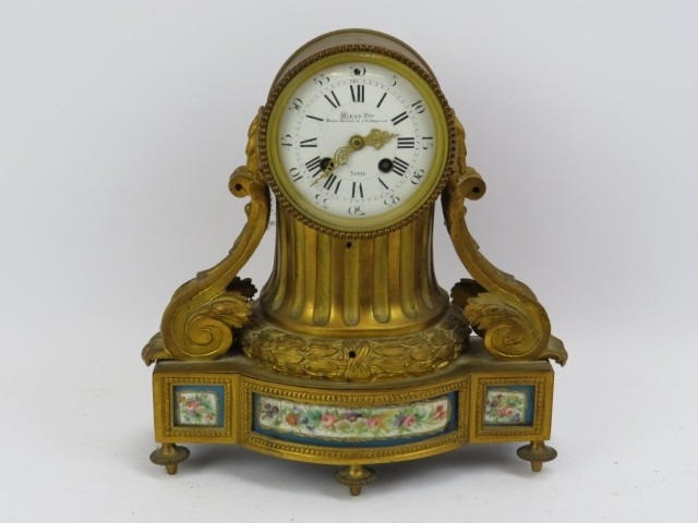 A French ormolu and Sèvres style porcelain panelled mantel clock by Miroy of Paris. 29.3 cm height, 29 cm width.
