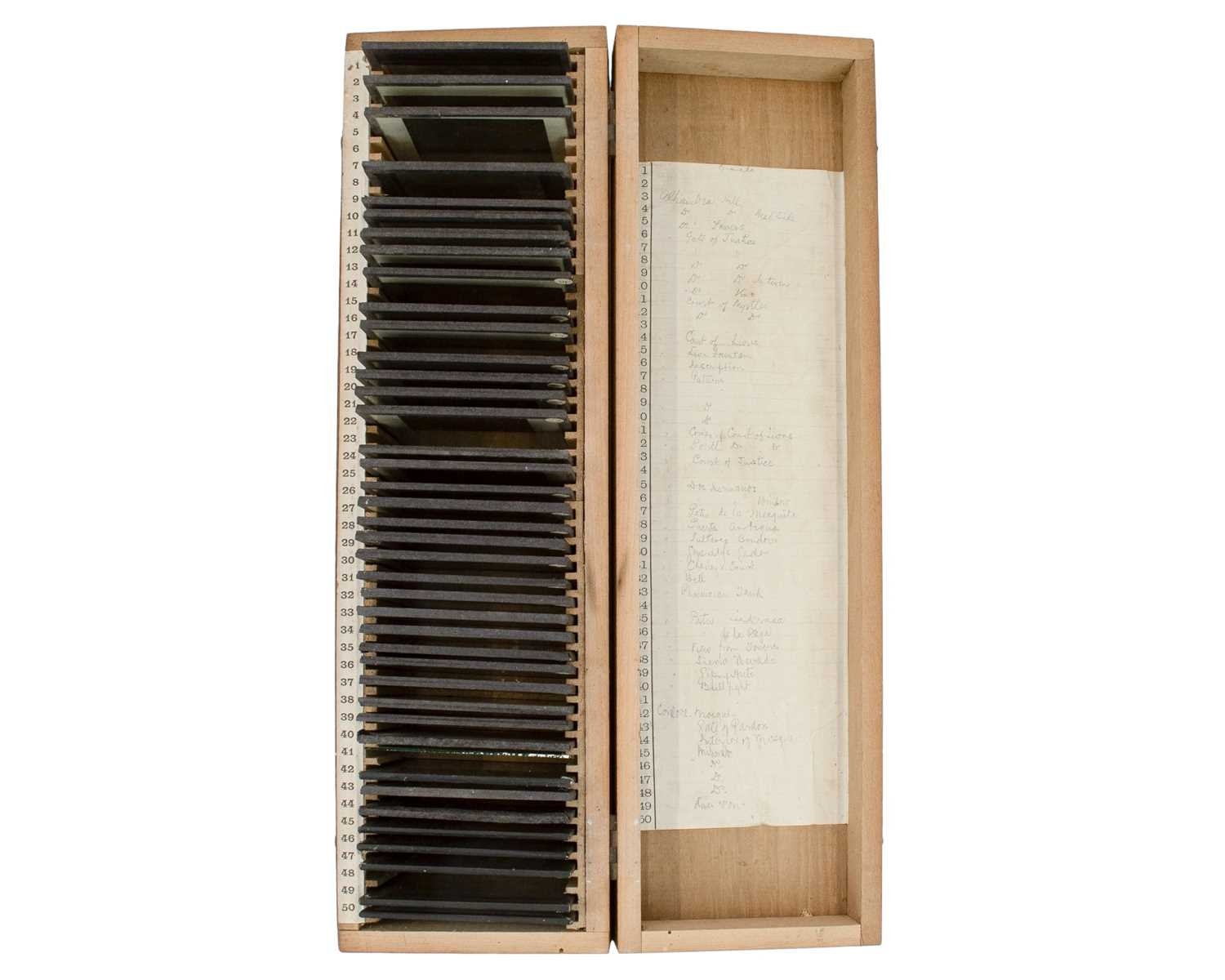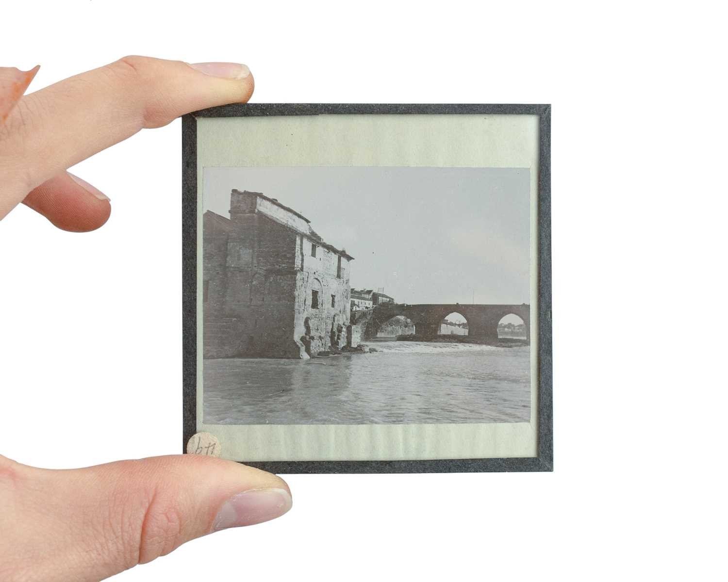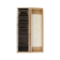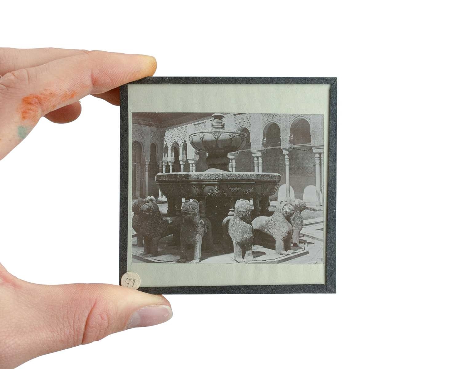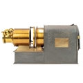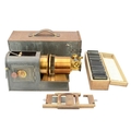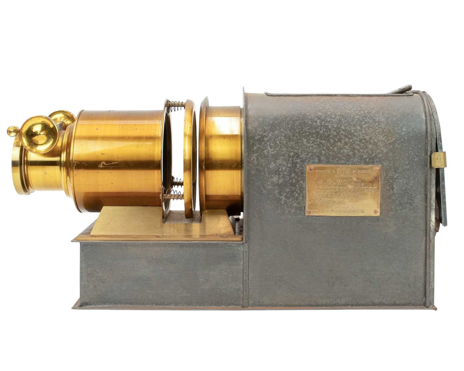 A Tinplate and Lacquered Brass `Euphaneron` Magic Lantern by E.G.Wood. Cheapside, London, converted to electricity, cased together with cased glass slides depicting the Alhambra, Granada.