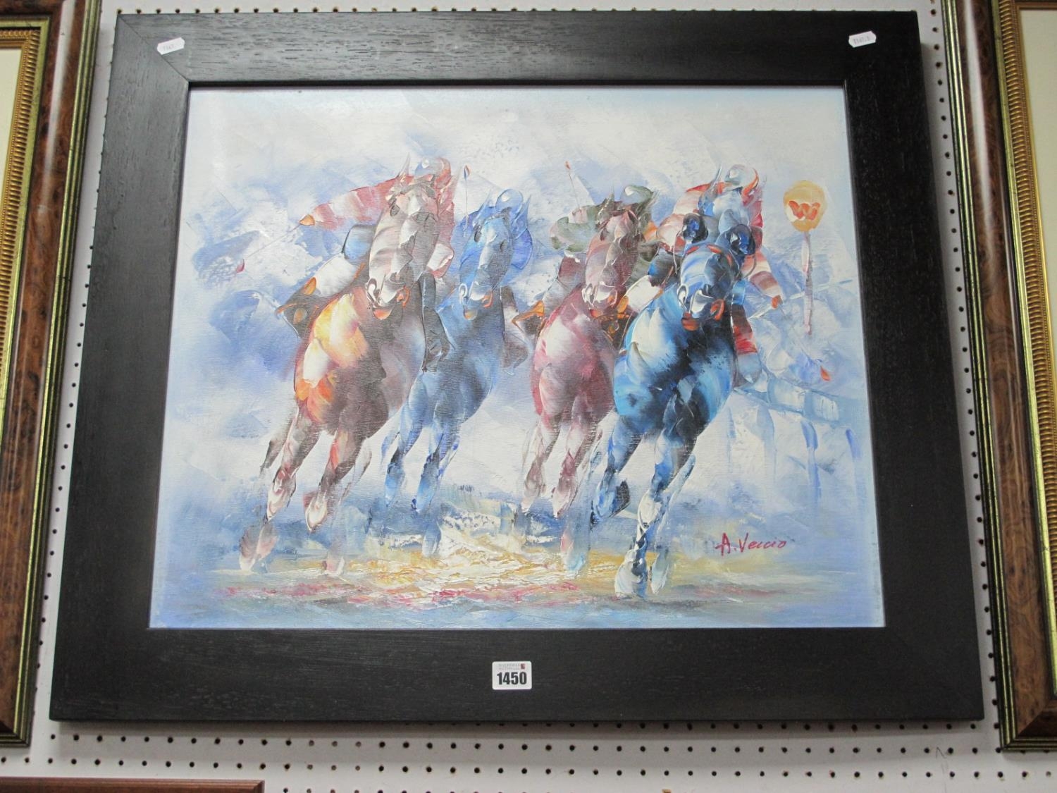 A. Veccio, Horse Racing, oil on canvas, signed lower right, 50 x 59cm.