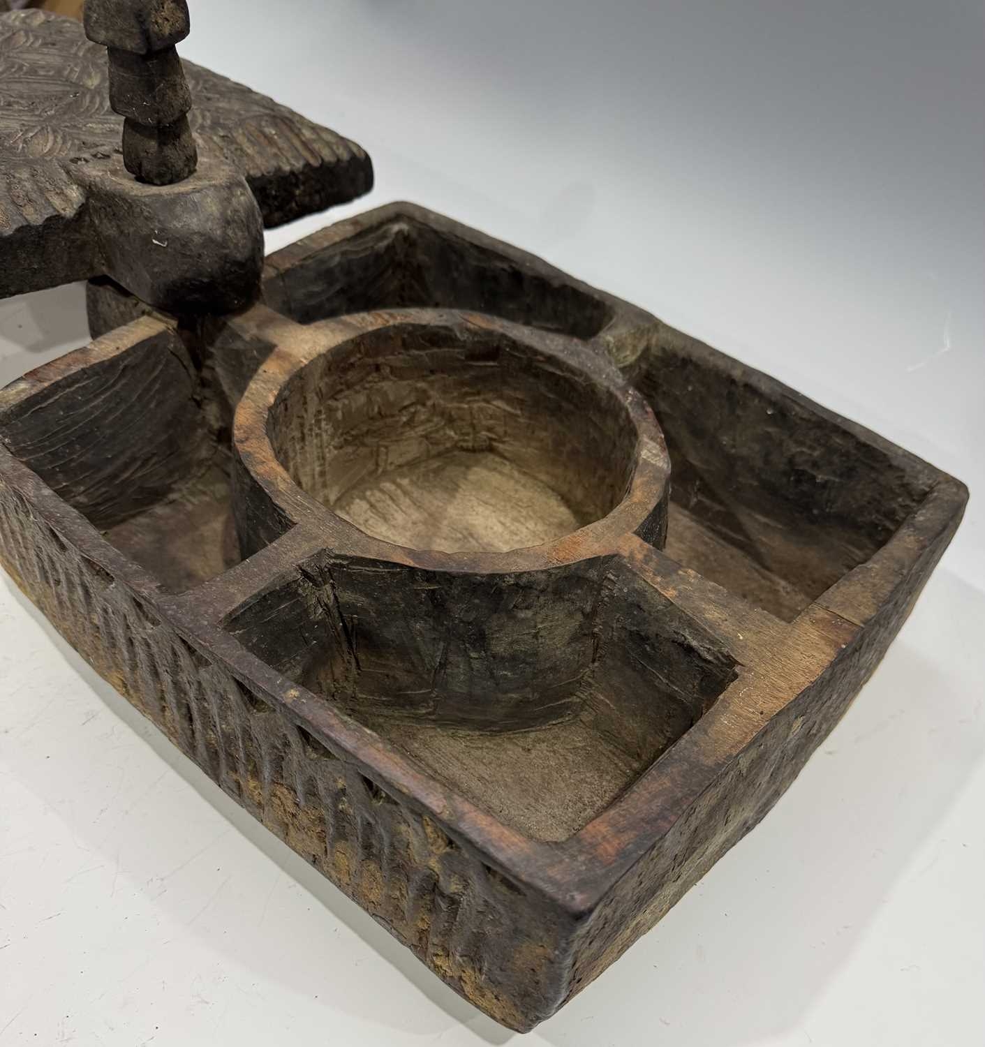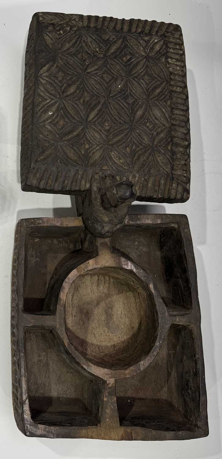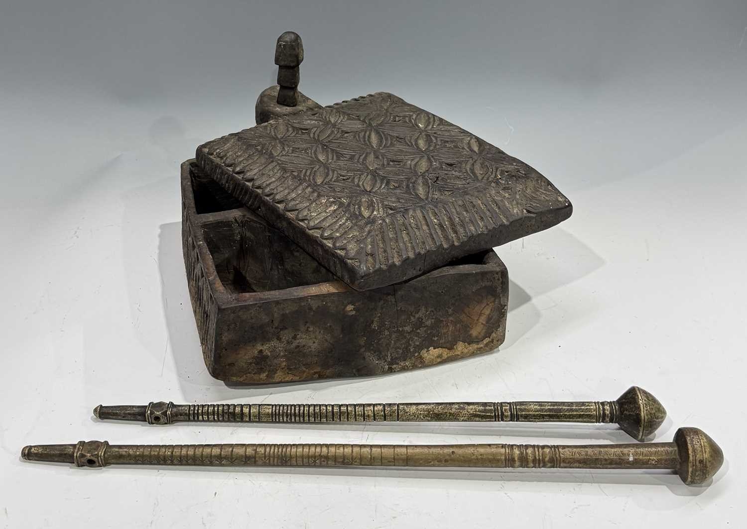 A carved wood spice box, Dolpo region, Nepal, 19th century or earlier, repeat carved geometric floral patterned lid with chamfered edges, swivel opening on a peg to reveal five compartments within, l:37cm, w:25, h:12cm, together with two Nepalese scale supports, cast brass with incised grooves to indicate weight, Kathmandu valley, 19th century, 52cm, 43.5cm (3) Provenance: The Alain Rouveure Collection