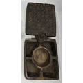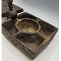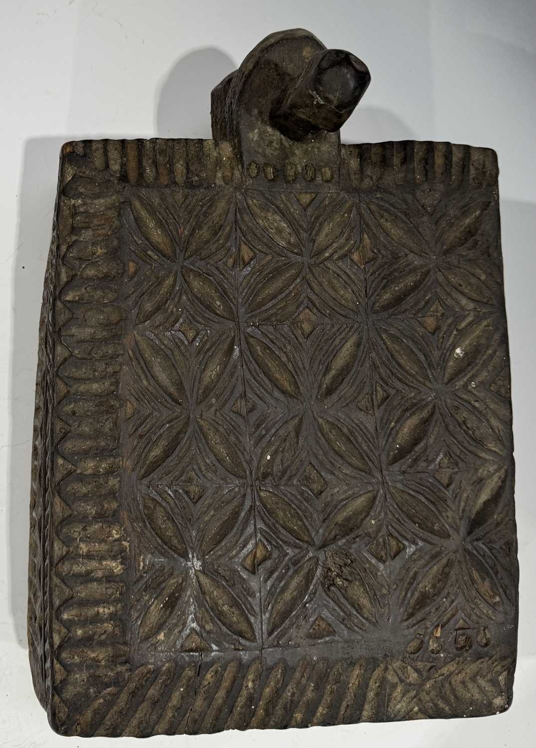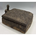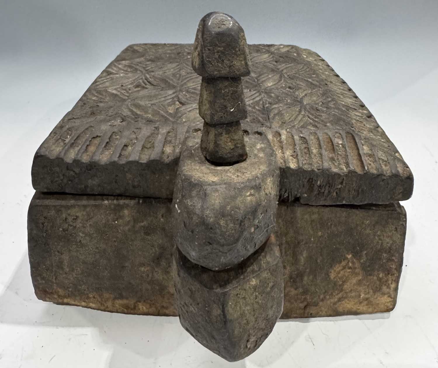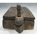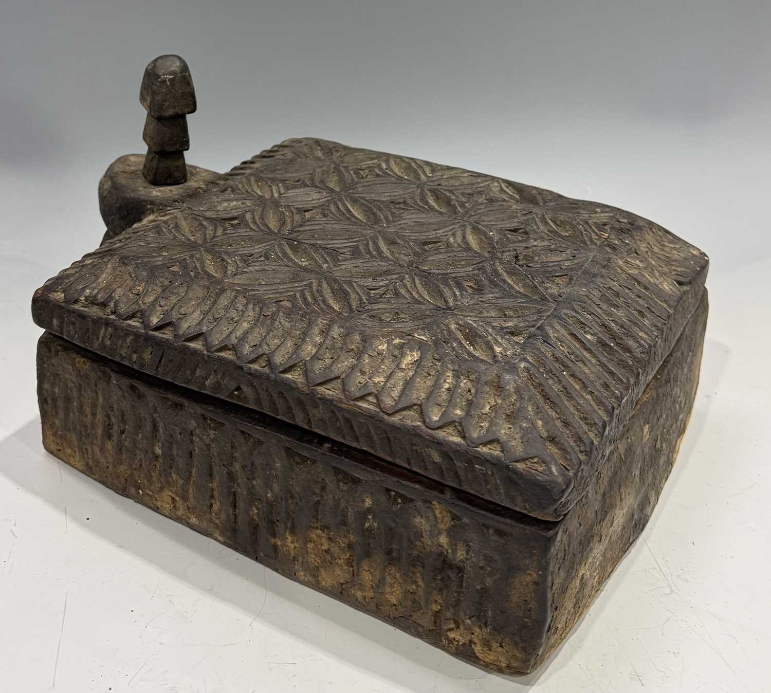 A carved wood spice box, Dolpo region, Nepal, 19th century or earlier, repeat carved geometric floral patterned lid with chamfered edges, swivel opening on a peg to reveal five compartments within, l:37cm, w:25, h:12cm, together with two Nepalese scale supports, cast brass with incised grooves to indicate weight, Kathmandu valley, 19th century, 52cm, 43.5cm (3) Provenance: The Alain Rouveure Collection