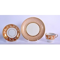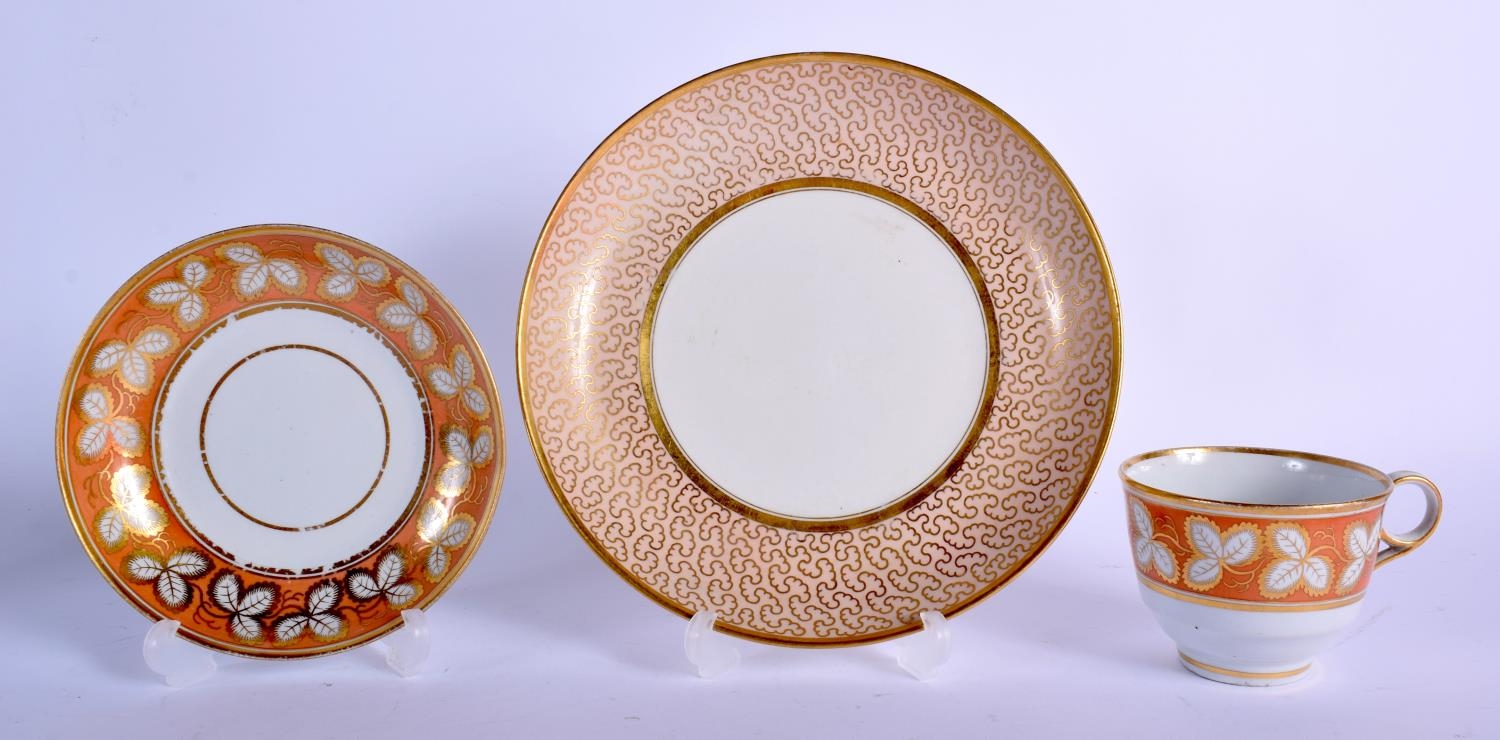 Worcester Flight Barr and Barr teacup and saucer gilded with leaves on a burnt orange ground and a FBB saucer dish with elaborate gilding on a salmon ground. Plate 20 cm wide. (qty