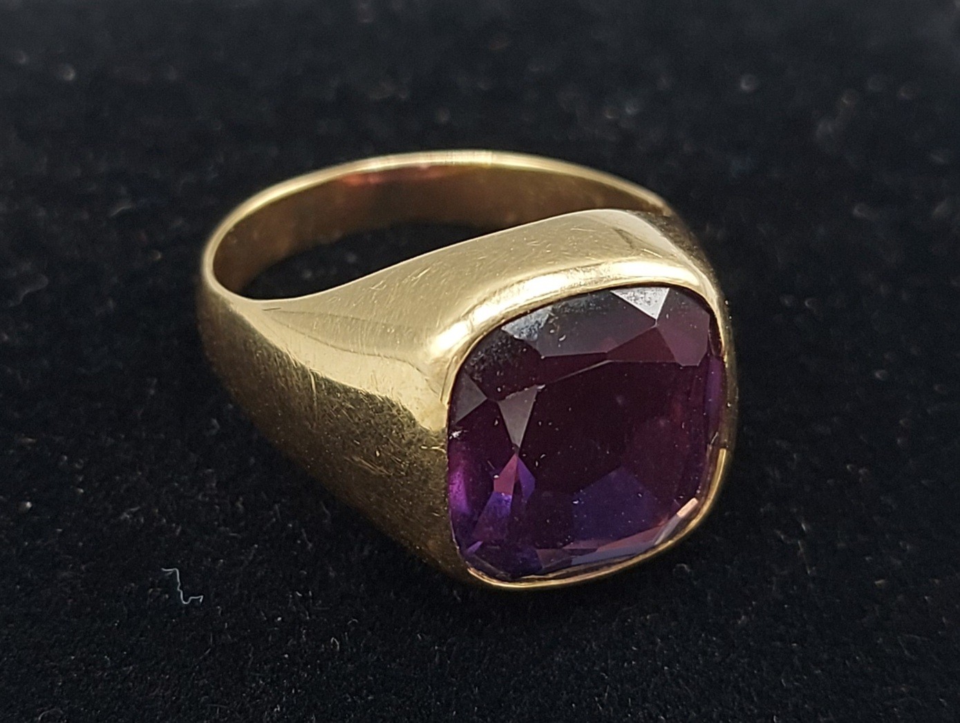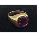 A tested gold ring set with large rectangular Amethyst, ring size U, 10.5g