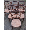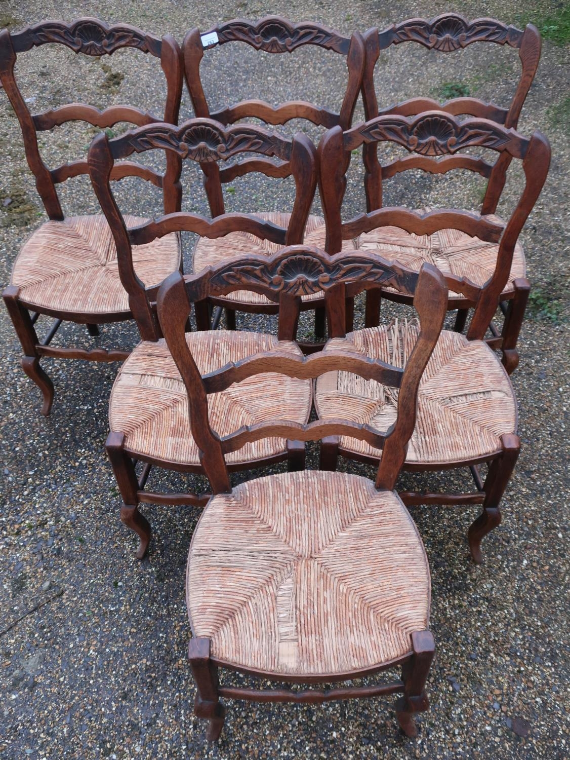 Set of six French oak ladderback rush seated dining chairs, the top rail with carved shell detail