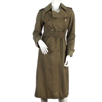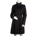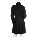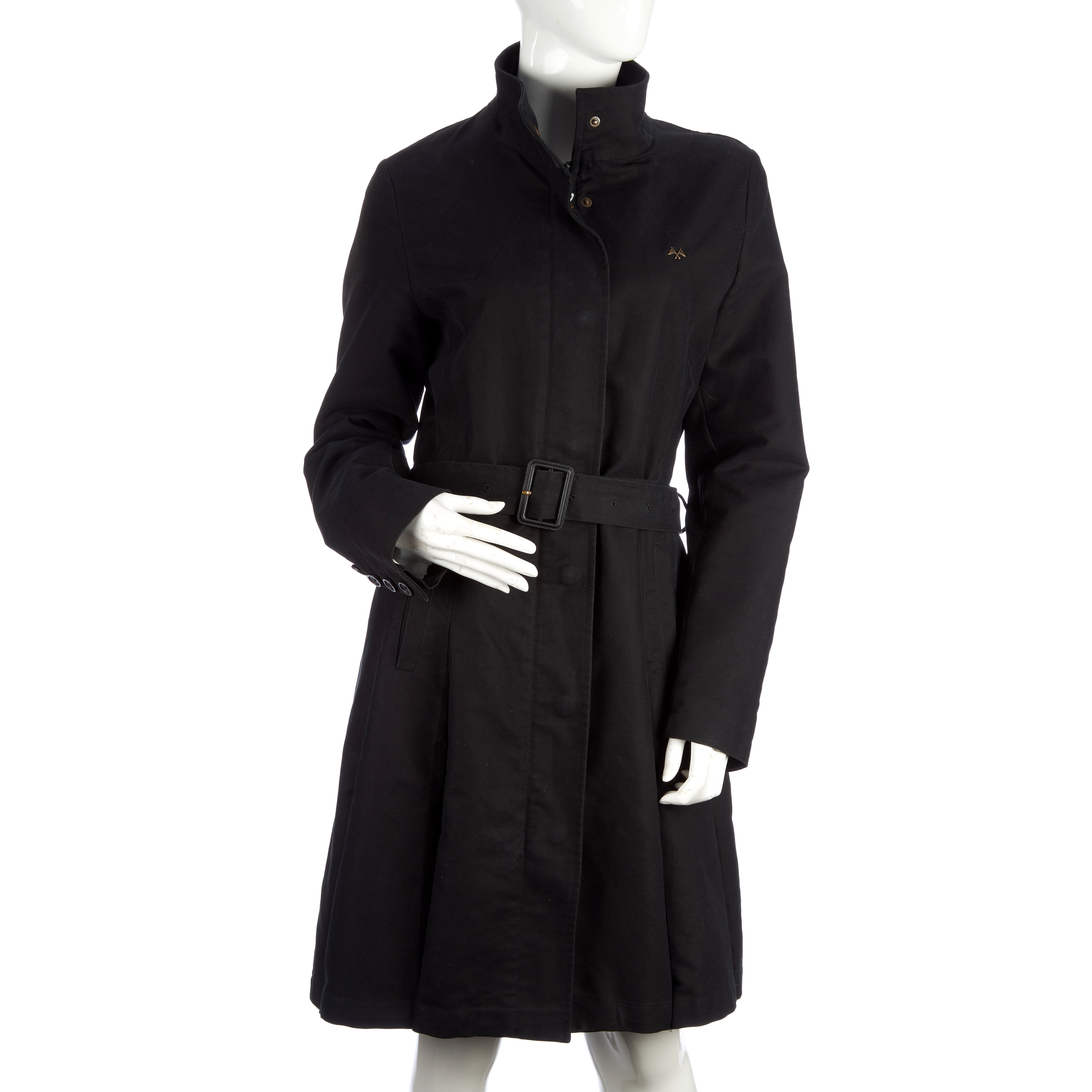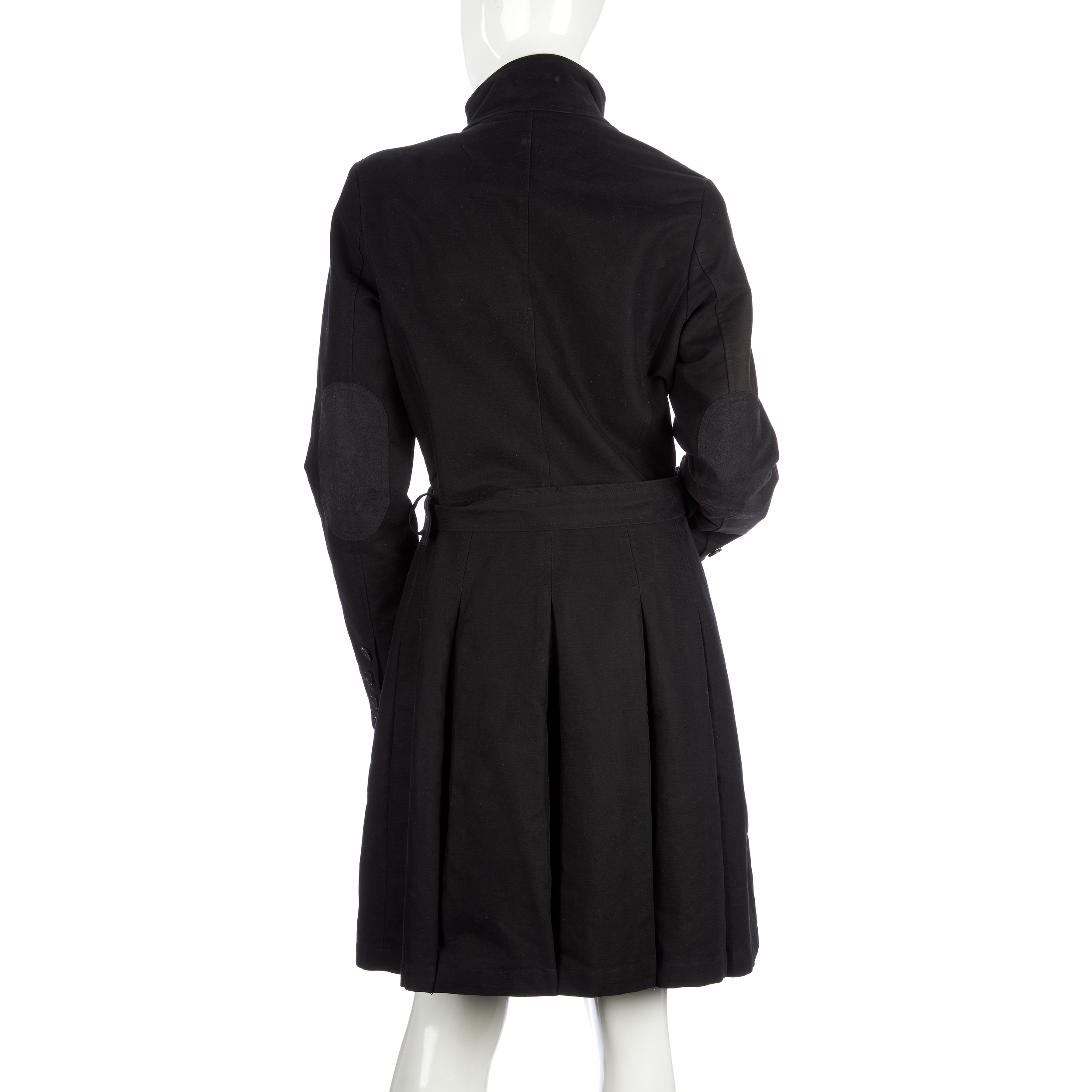 Thomas Burberry, a ladies navy blue, knee-length coat, featuring a Mandarin collar, front zip and button fastening, a belted waist and pleated detailing, labelled Thomas Burberry, size M, chest measures approximately 37 inches