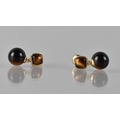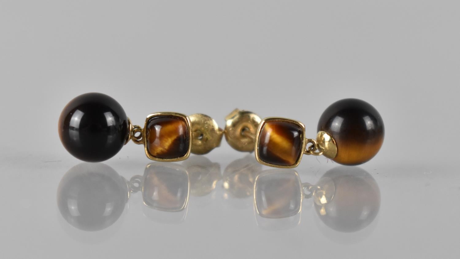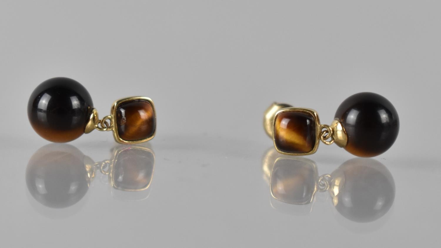 A Pair of 9ct Gold and Tigers Eye Drop Earrings Square Shaped Cabochon, Collet Set and Measuring 4.5mm Square, to Sphere Dropper Measuring 8mm Diameter, Total Drop 16mm, Stamped to Back 375, 9ct, EA, 2.7gmd