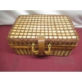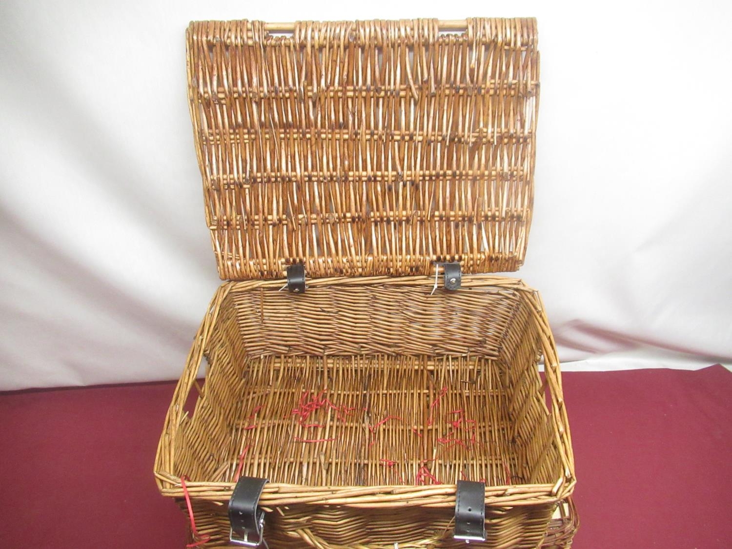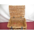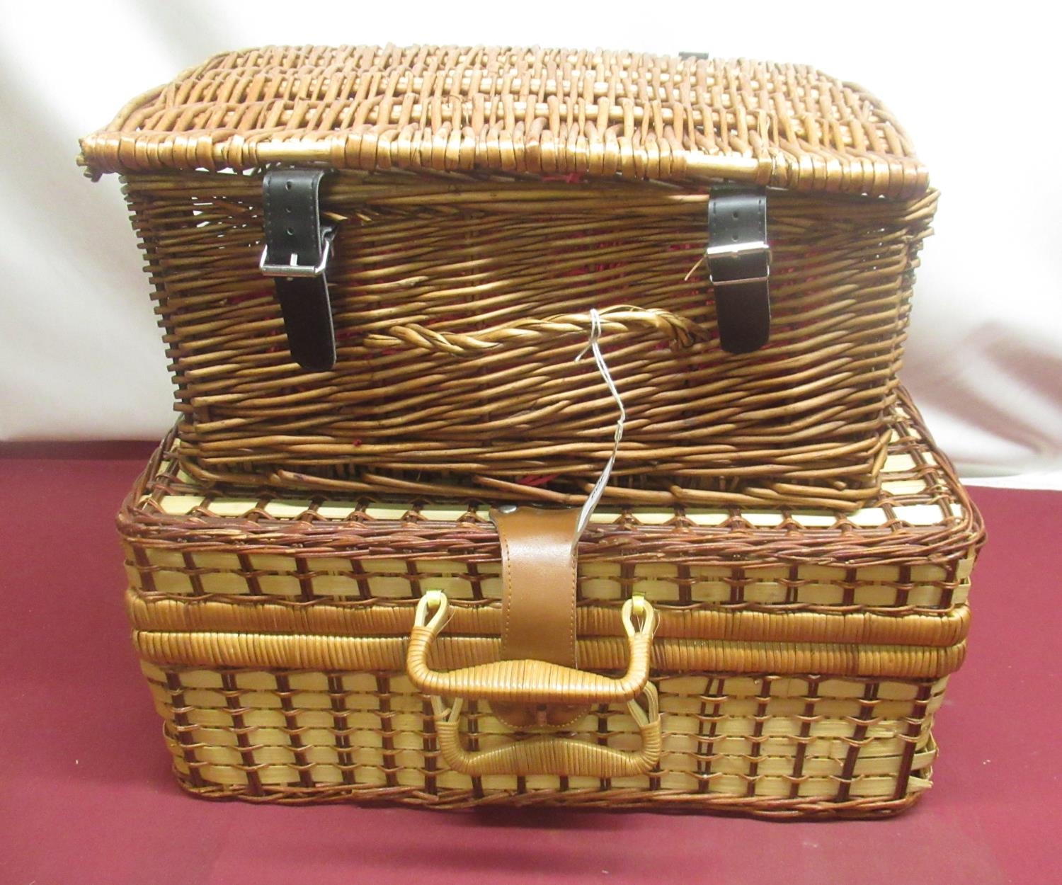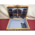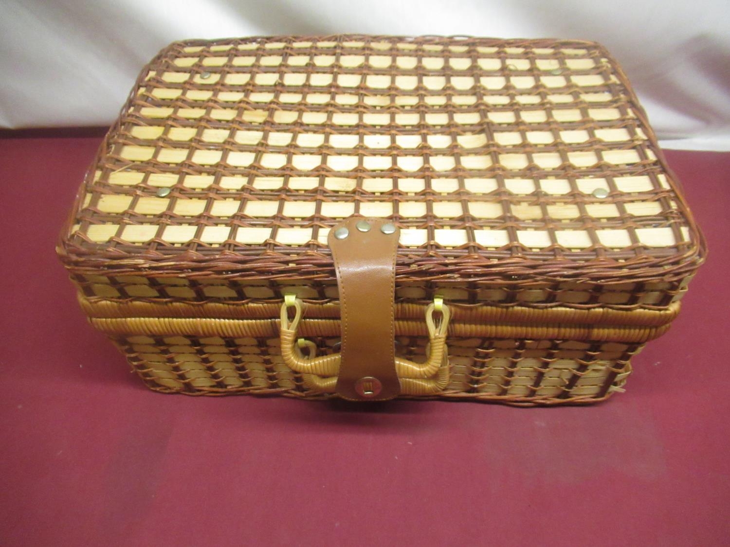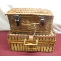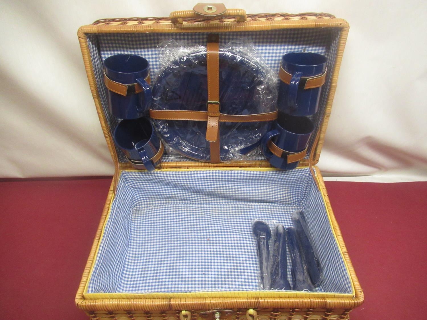 Wicker picnic basket with checked interior, a set of four plastic plates, mugs and cutlery and another smaller picnic basket lacking interior (2)