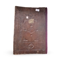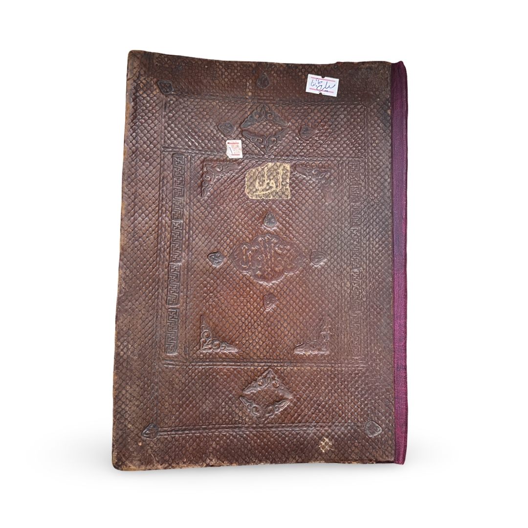 This illuminated manuscript is a section (juz) of a Chinese Quran, dating to the 18th century. The volume is executed on hand-burnished paper using black and red ink, gold leaf, and polychrome pigments. The calligraphy is written in a large, bold Arabic script in the Sini style, which is characteristic of Islamic manuscripts produced in China. Black ink is used for the primary text, while red ink is utilized for vocalization marks (tashkil). The opening bifolium features elaborate headpieces and footpieces with gold-ground medallions containing geometric star patterns and interlaced floral motifs. The side margins of these pages are decorated with stylized floral shamsa finials in gold, green, and blue pigments. The main text pages are enclosed within simple red ruled borders. The manuscript is housed in a dark brown leather binding featuring blind-tooled and stamped decoration, including a central mandorla with pendants and a border composed of geometric and scrolling patterns.