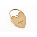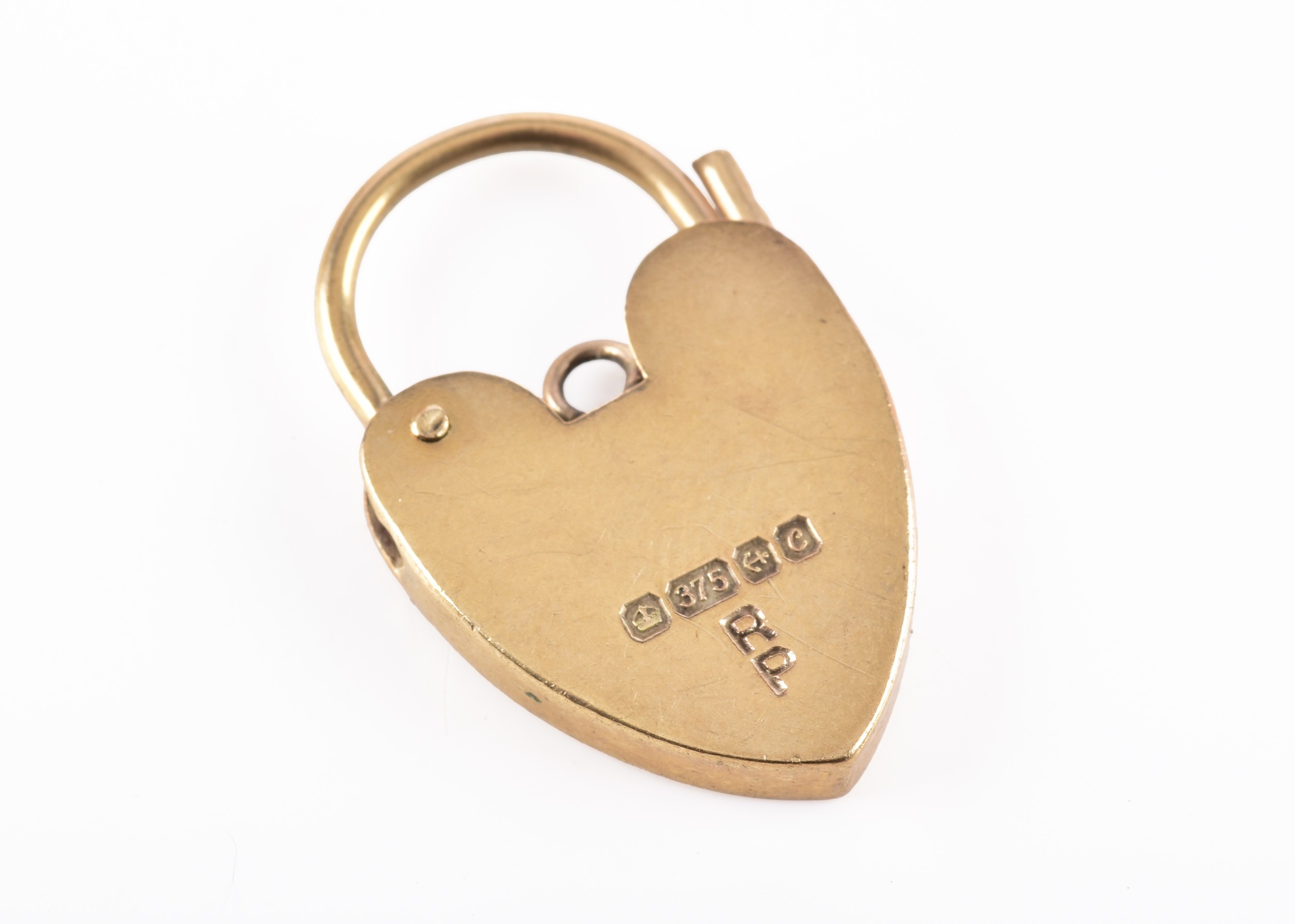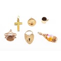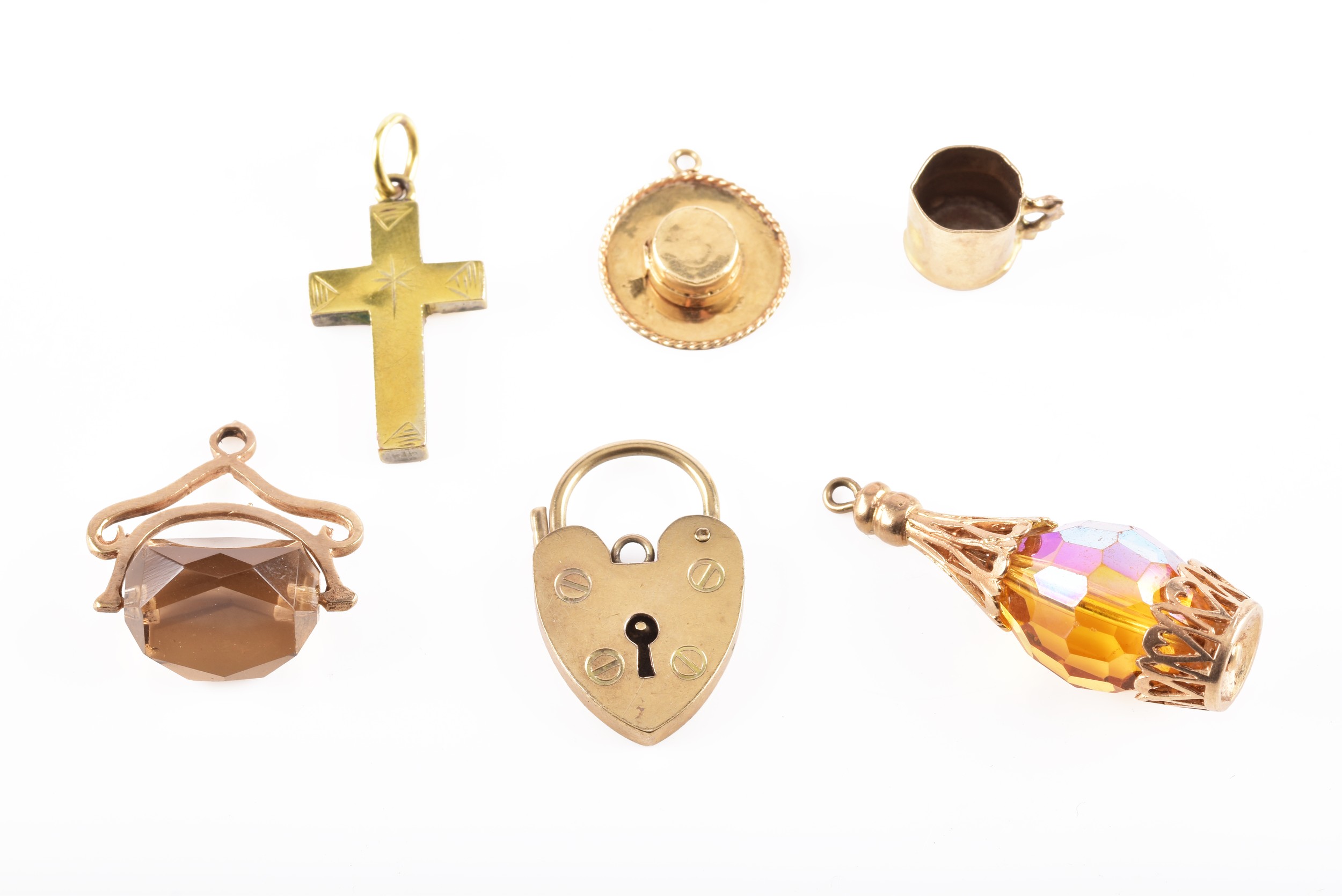A collection of gold charms, including a 9ct glass set decorative fob charm, a 9ct yellow gold smoky quartz fob, a 9ct yellow gold heart padlock hallmarked for Birmingham 1977, a yellow metal cup, hat, and cross pendant. (6)
