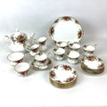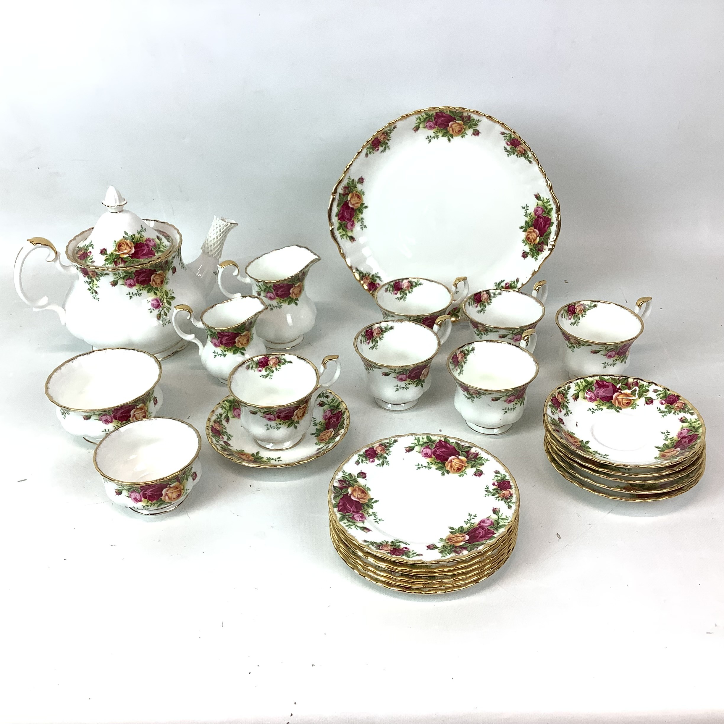 Royal Albert Old Country Roses tea set, six-setting. Includes: 6 cups and saucers, 6 side plates, teapot, 2 jugs, 2 bowls, one cake plate.
