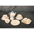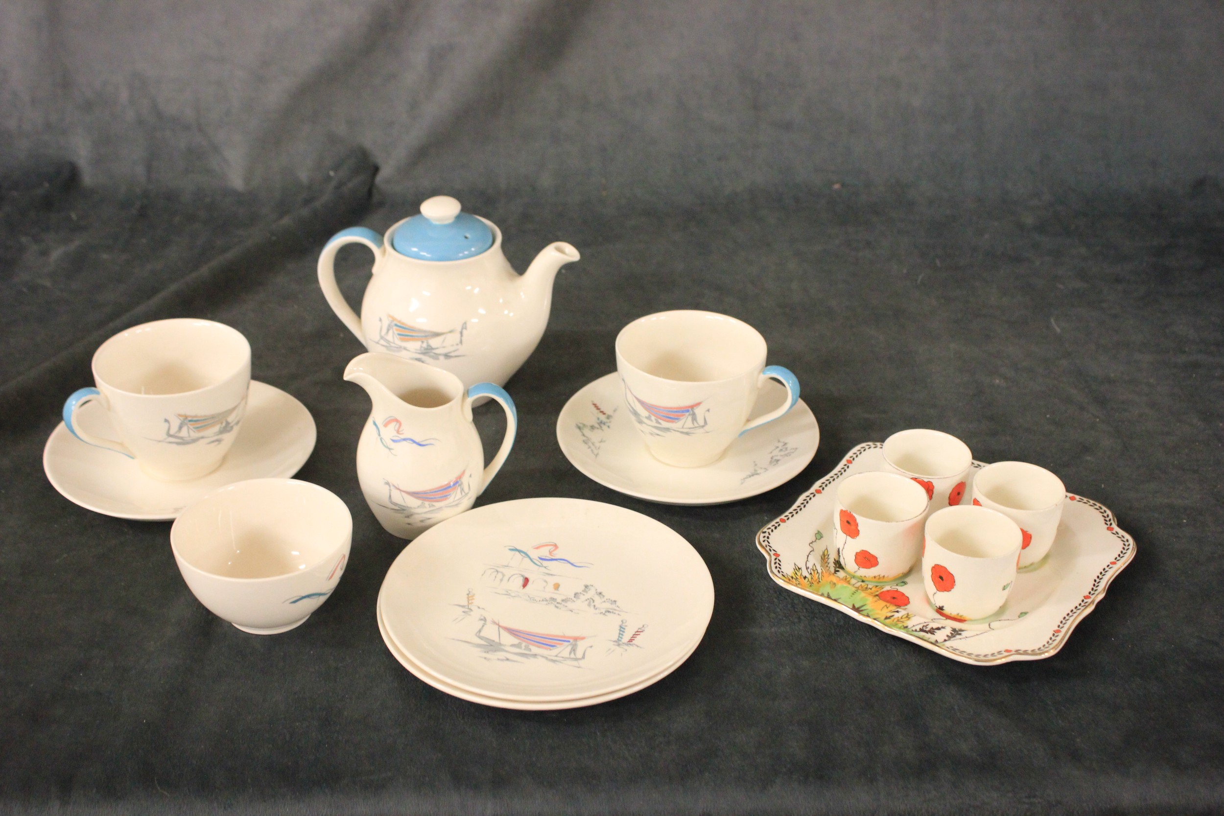 A Royal Doulton "Venetian Scenes" tea set for two people, nine pieces, and a Crown Ducal ware poppy pattern egg cup plate and four egg cups, 14 pieces altogether.