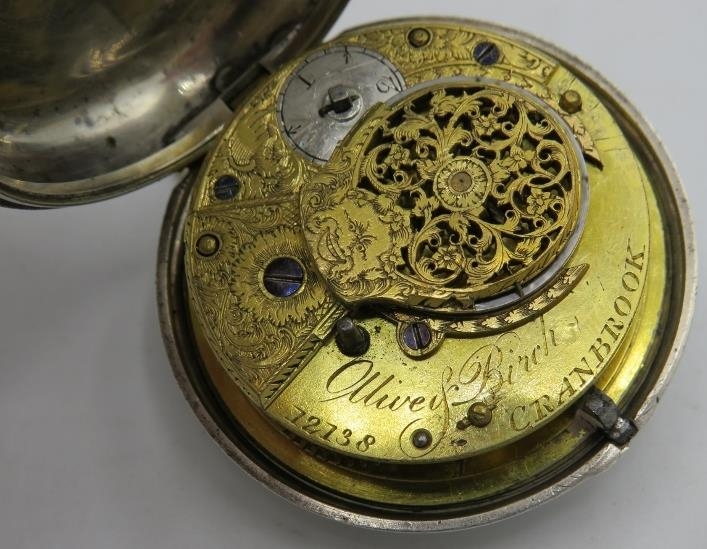 A Georgian silver pair cased fusee pocket watch by Cranbrook makers Ollive & Birch, case hallmarked 1817, outer case 1806. Dial 48mm. Two keys included.