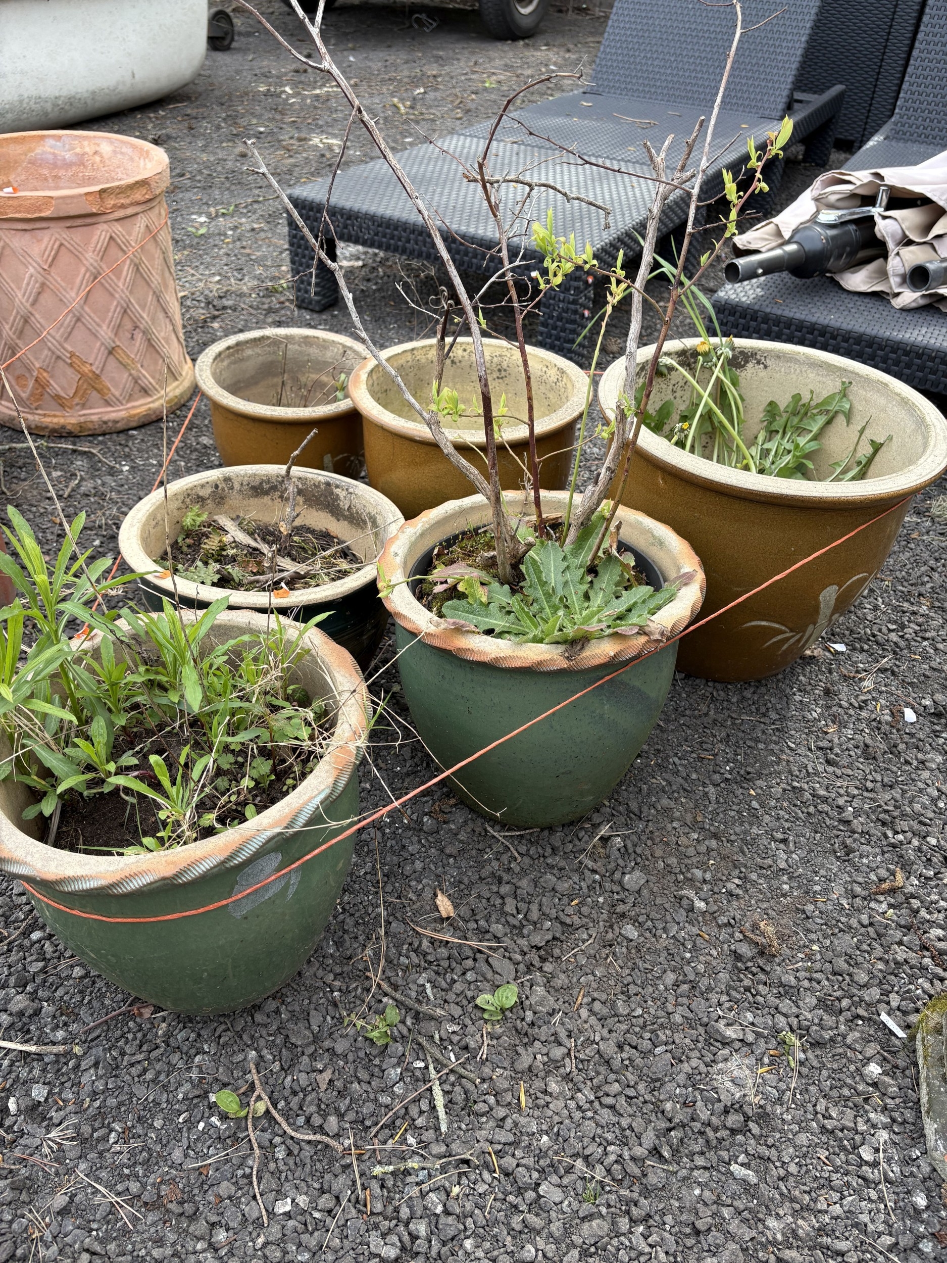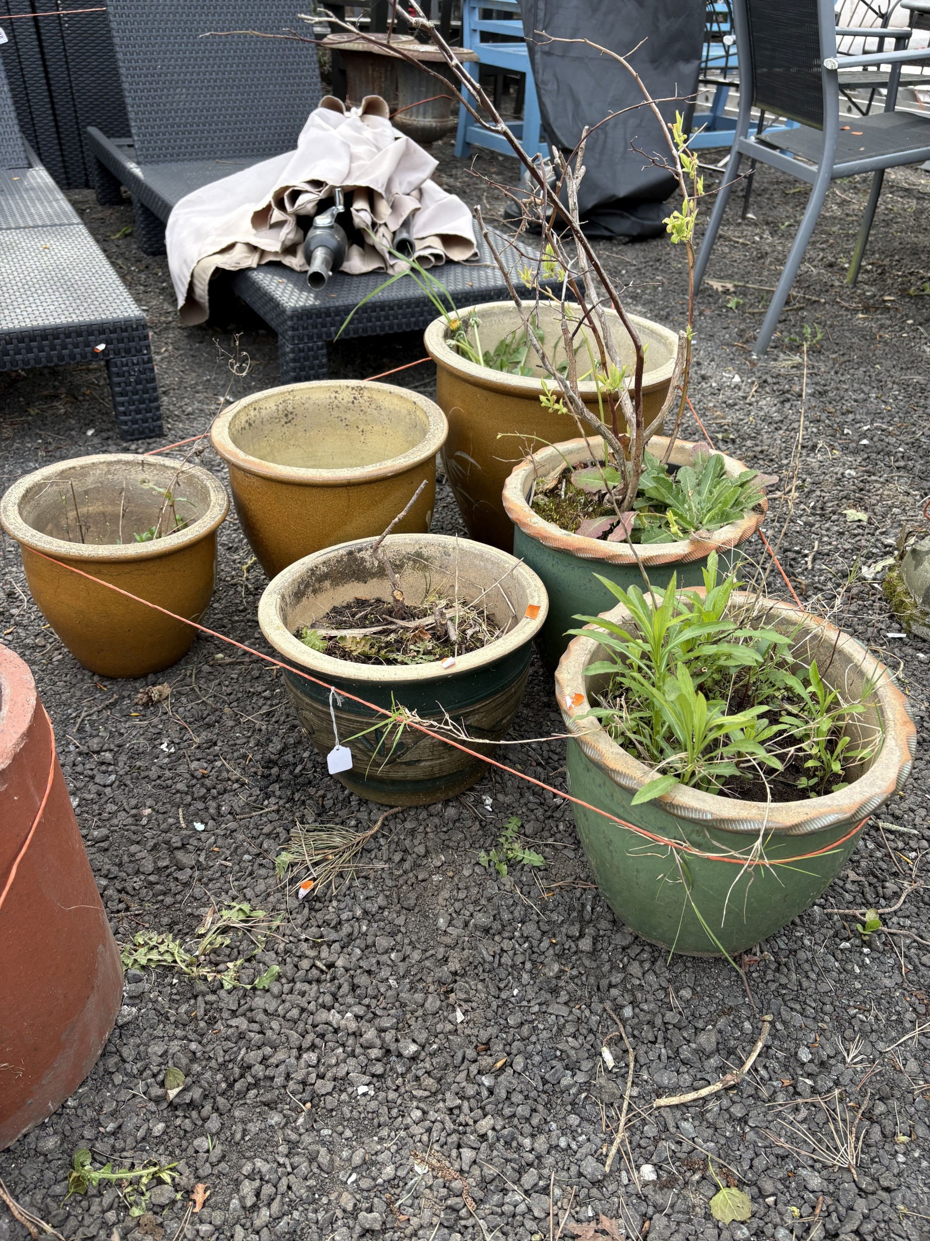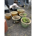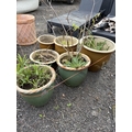 SIX GREEN AND BROWN GLAZED PLANT POTS, of different sizes, one containing a plant, largest diameter 38cm x height 32cm (6)
