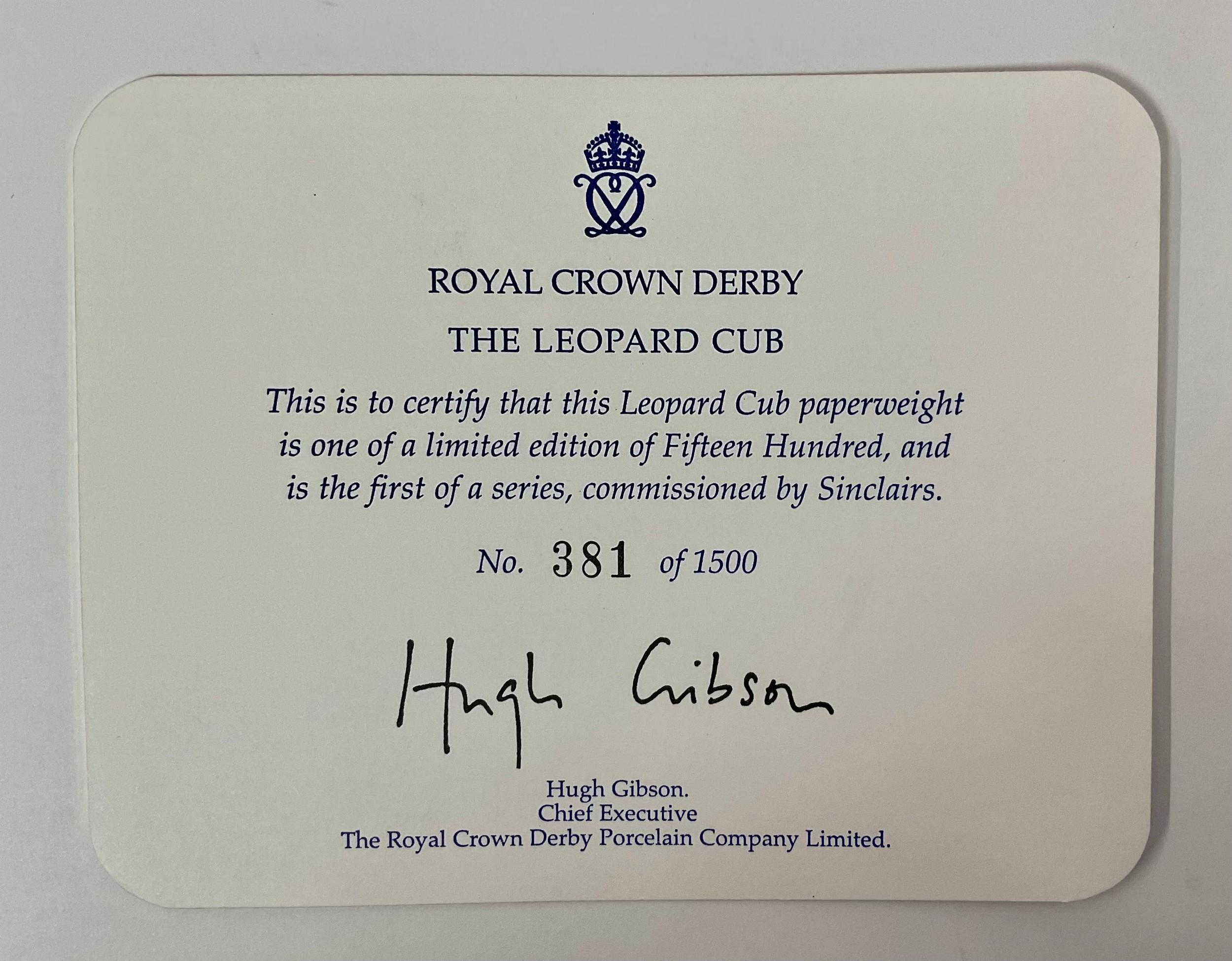 A Royal Crown Derby paperweight, Leopard Cub, commissioned by Sinclairs, limited edition 381/1,500, gold stopper, 11cm wide, printed mark in red, certificate, boxed