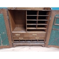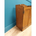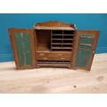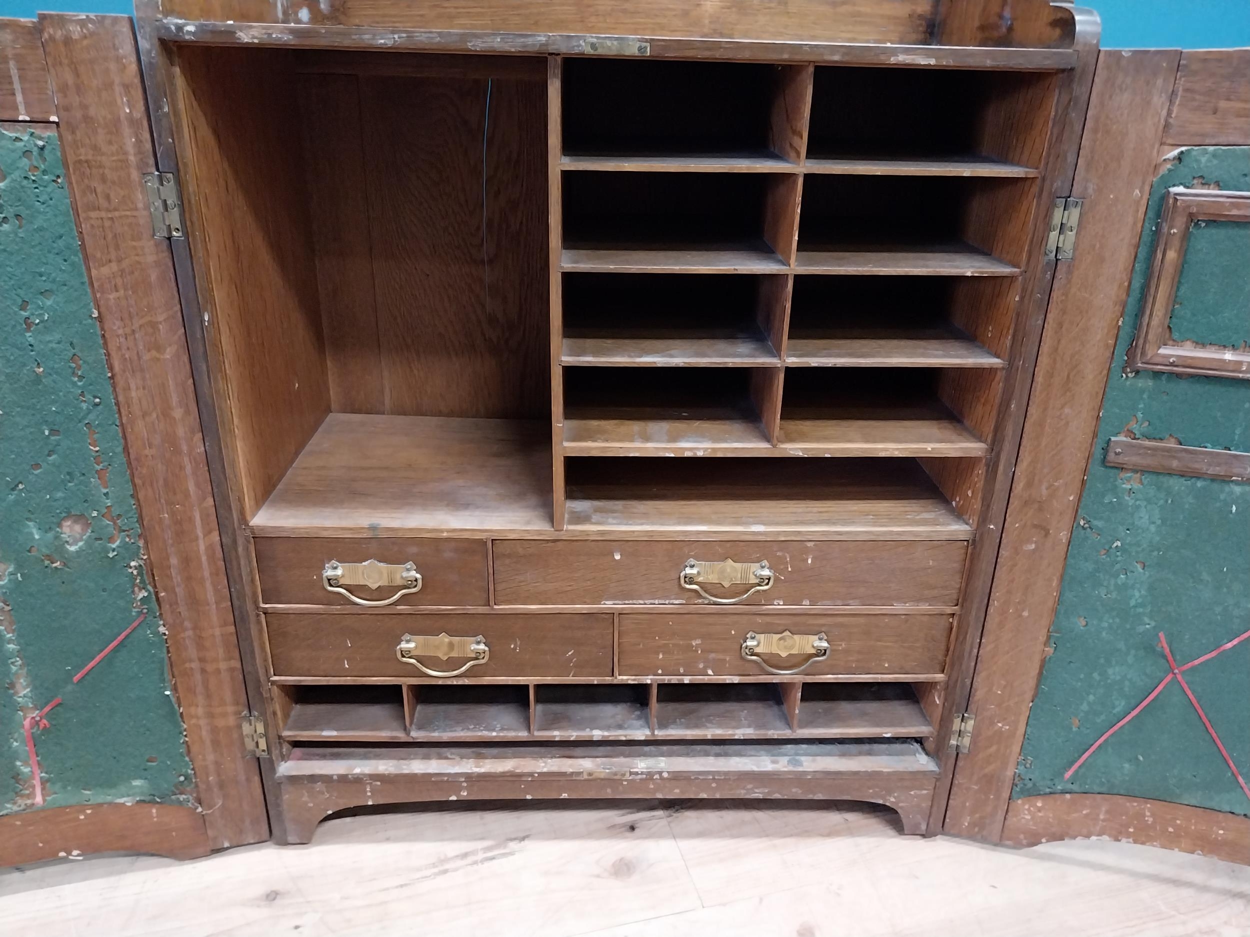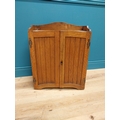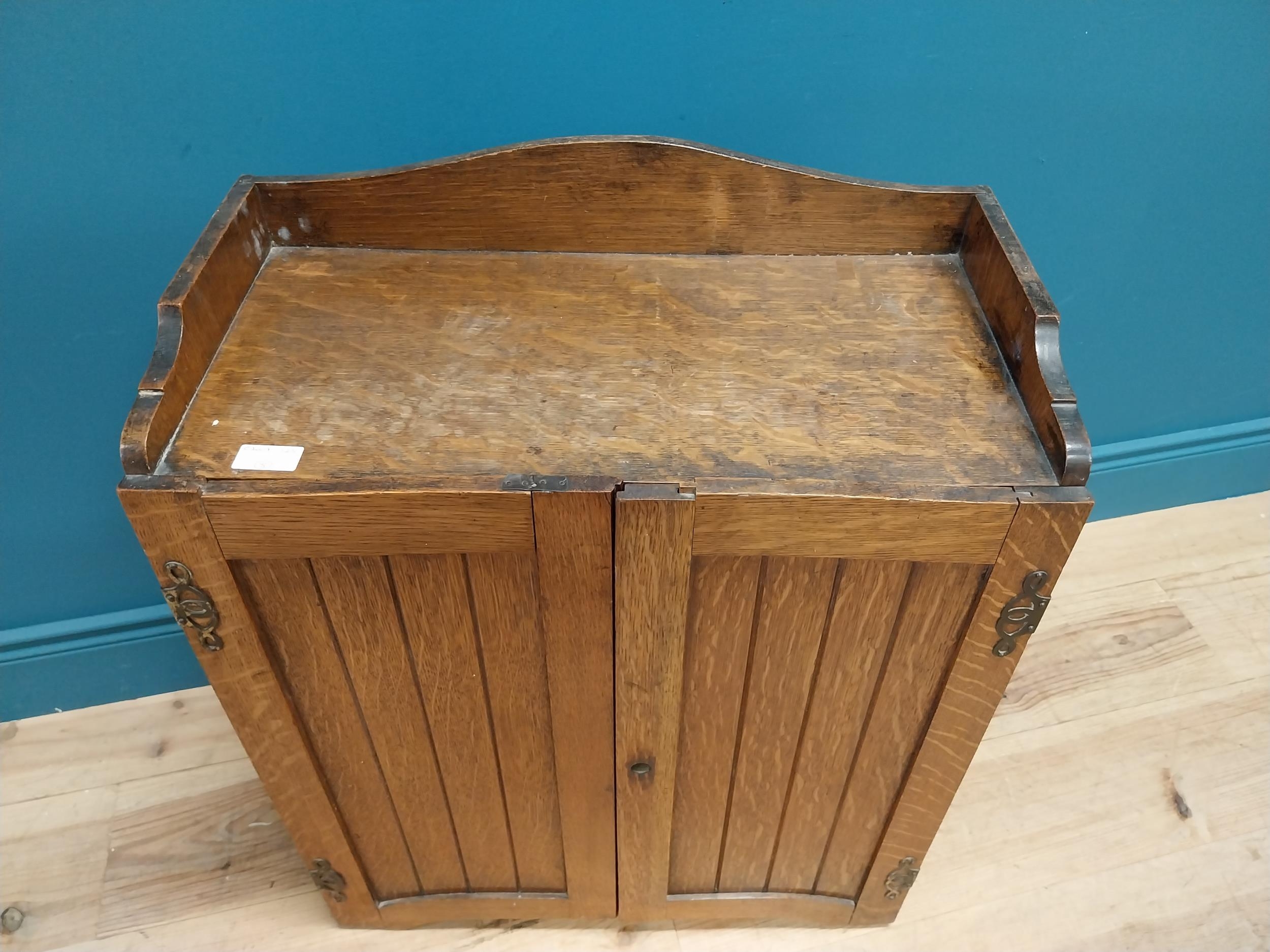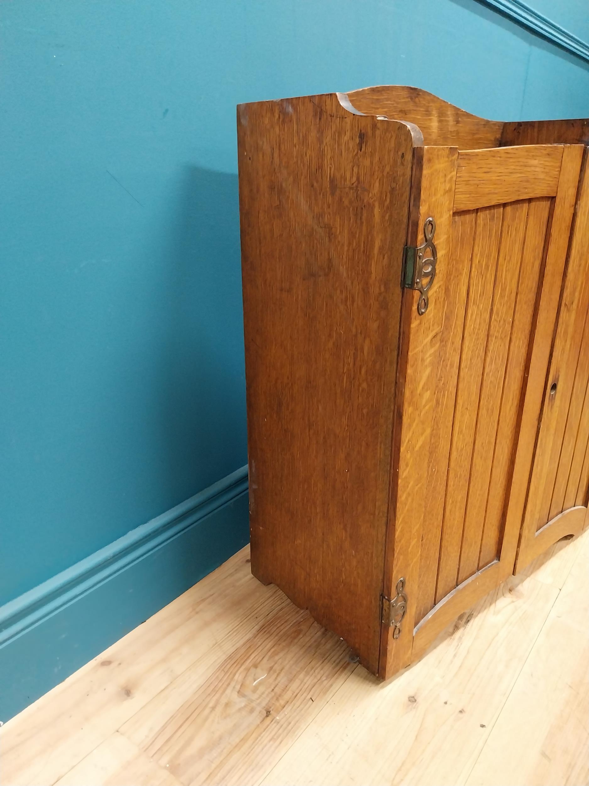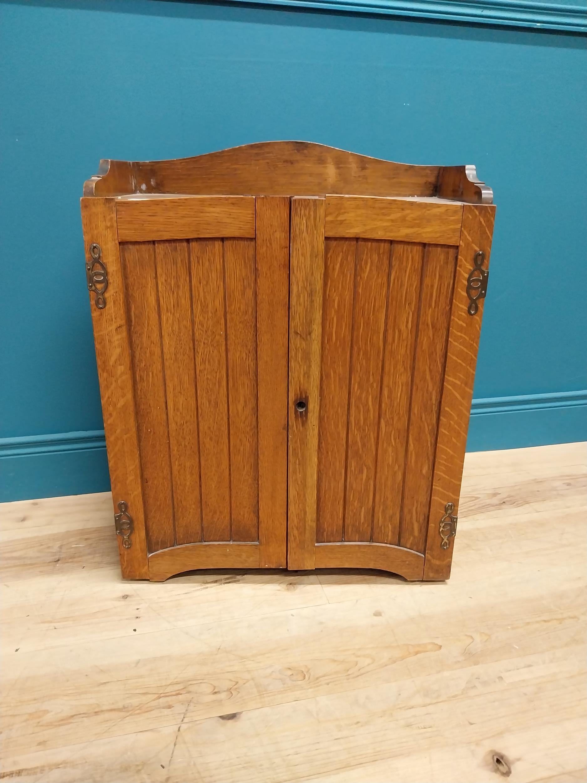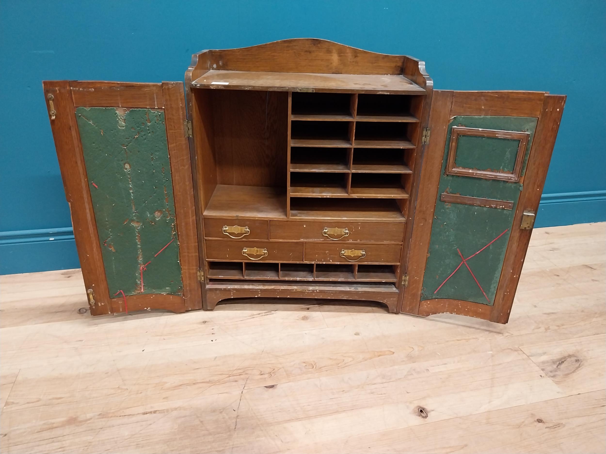 Edwardian oak wall hanging office cabinet with fitted interior. {73 cm H x 58 cm W x 29 cm D}