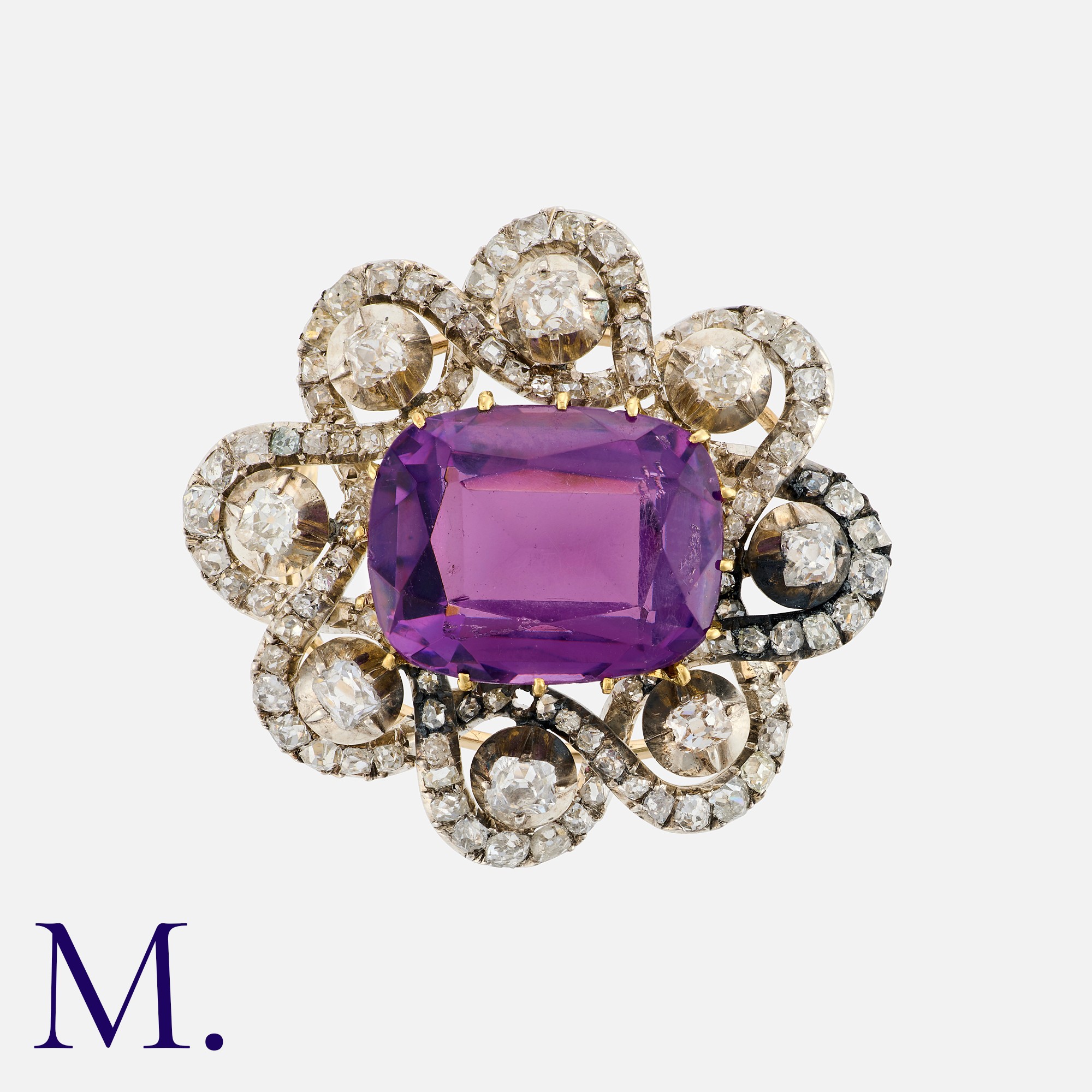 An Antique Amethyst And Diamond Brooch in yellow gold and silver, set with a central cushion shaped amethyst of approximately 10.0ct, within an undulating border of old cut diamonds totalling approximately 2.0ct. Unmarked, tests indicate 15 carat gold.