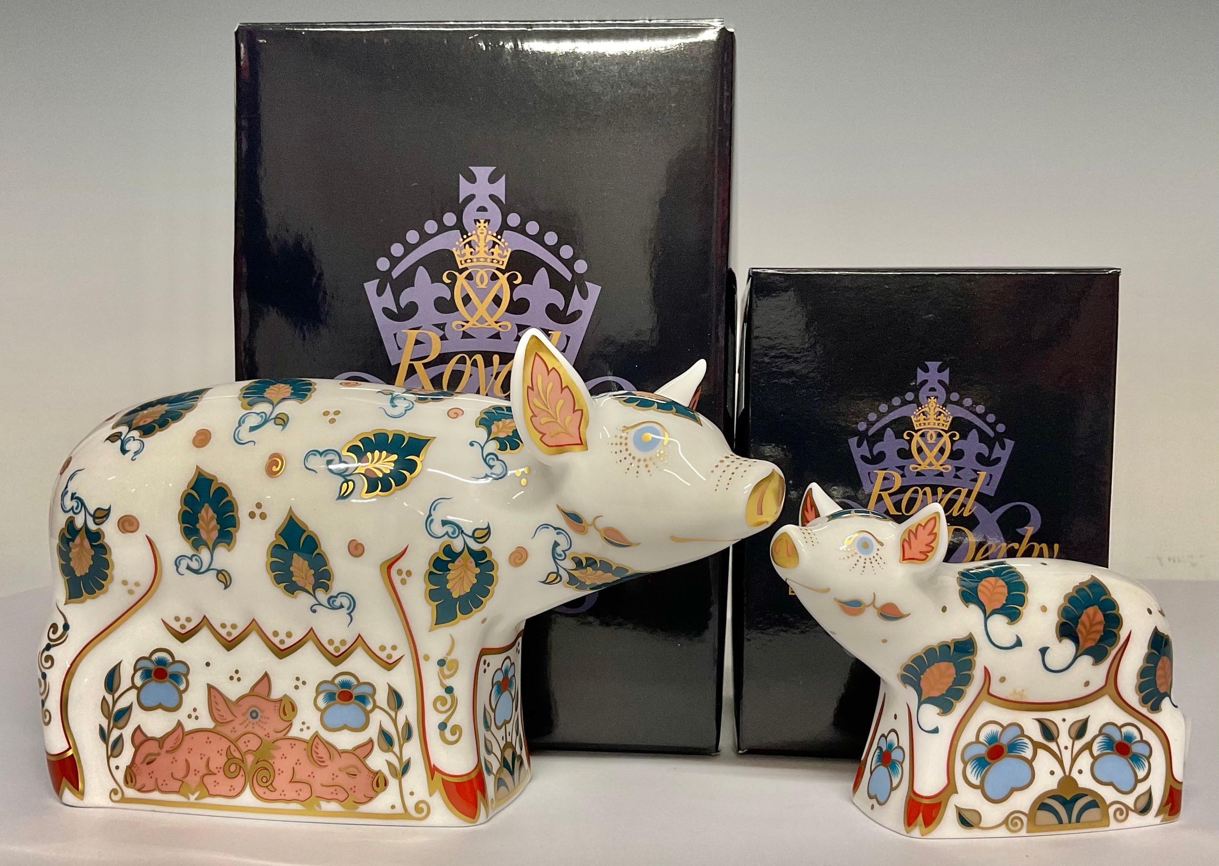 A Royal Crown Derby paperweight, Priscilla Pig, Collectors Guild exclusive 2013, gold stopper, 17cm long, printed mark in red, boxed; another, Percy Piglet, gold stopper, printed mark, boxed (2)