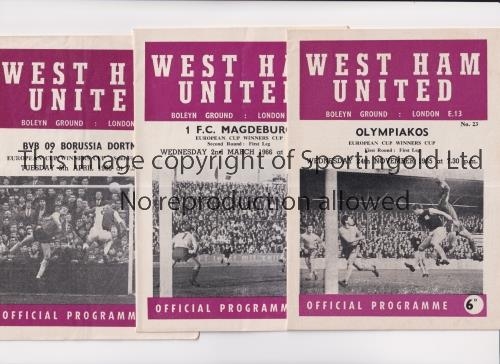 WEST HAM UNITED Three home programme for 1965/6 ECWC ties v Olympiakos 24/12/65, Magdeburg 2/3/66, Borussia 5/4/66, player numbers entered. Generally good