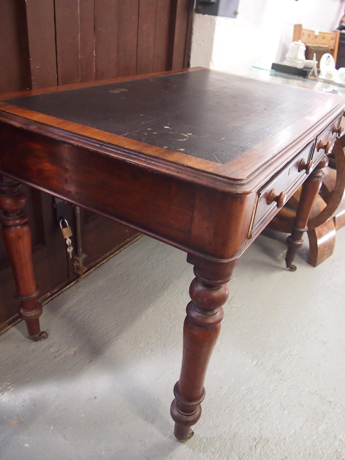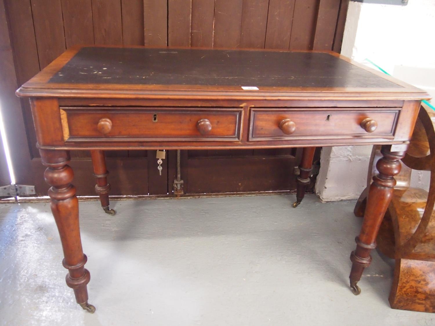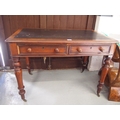 A Victorian two drawer writing table on brass castors