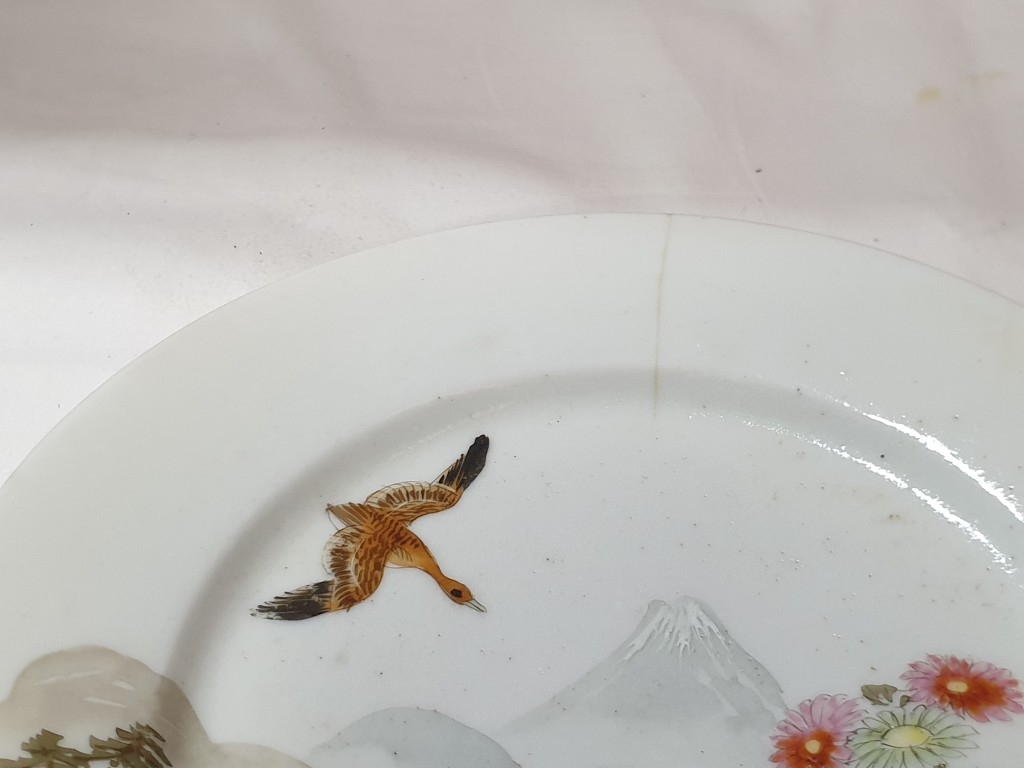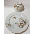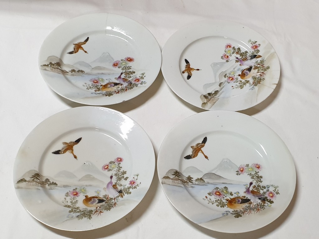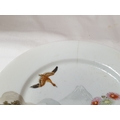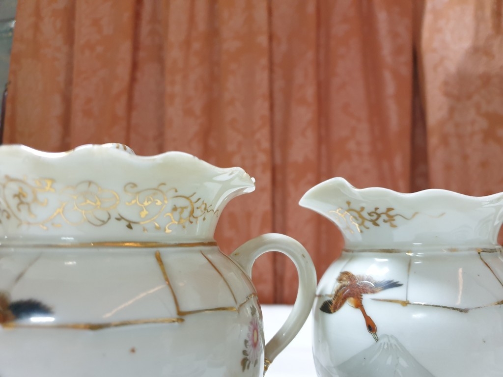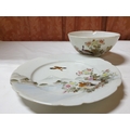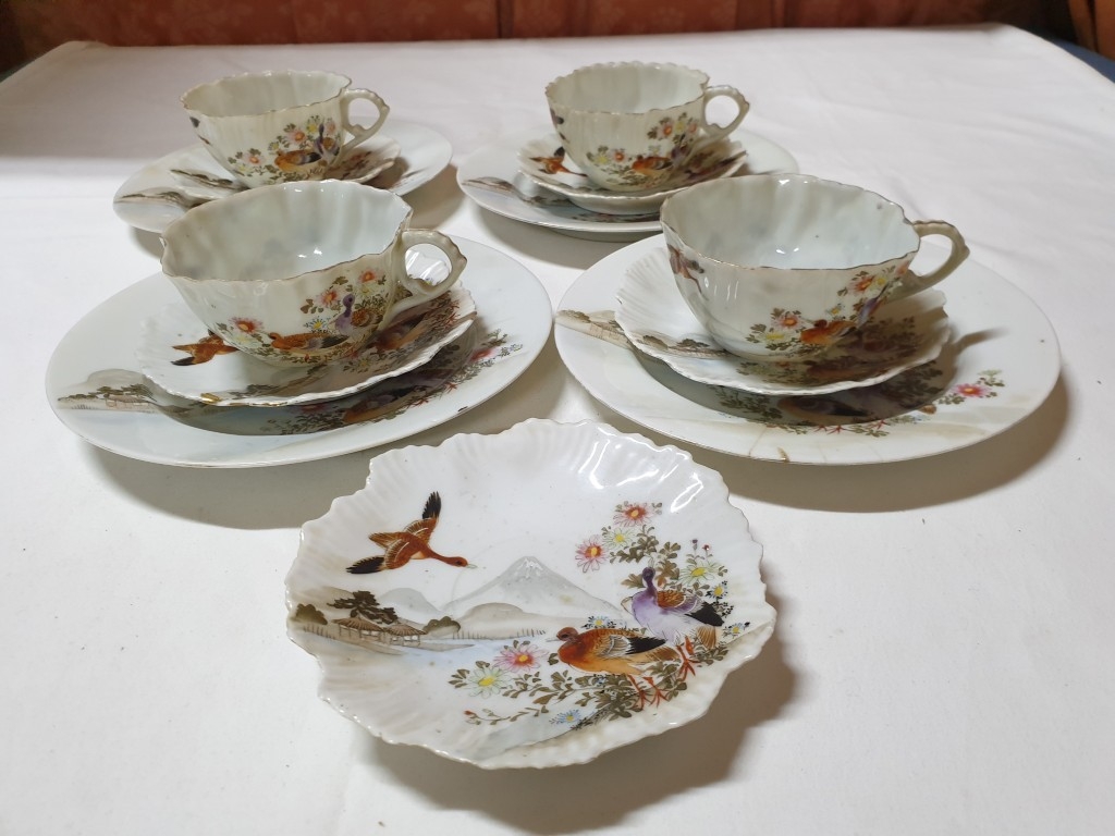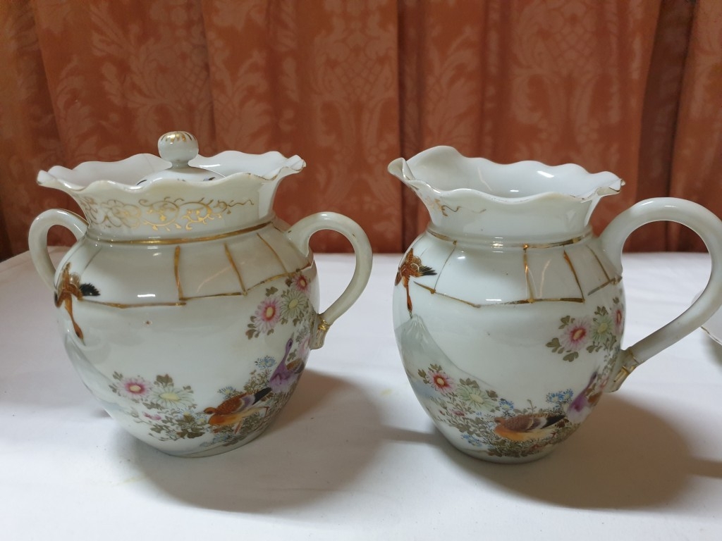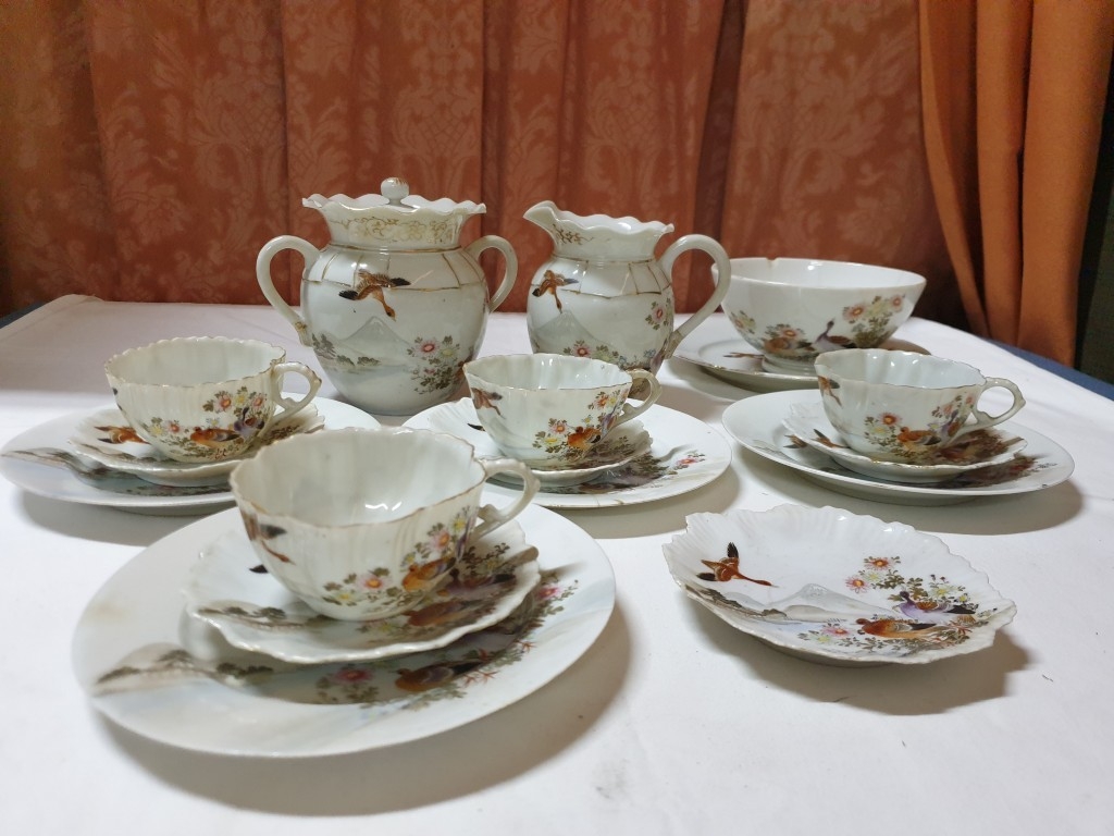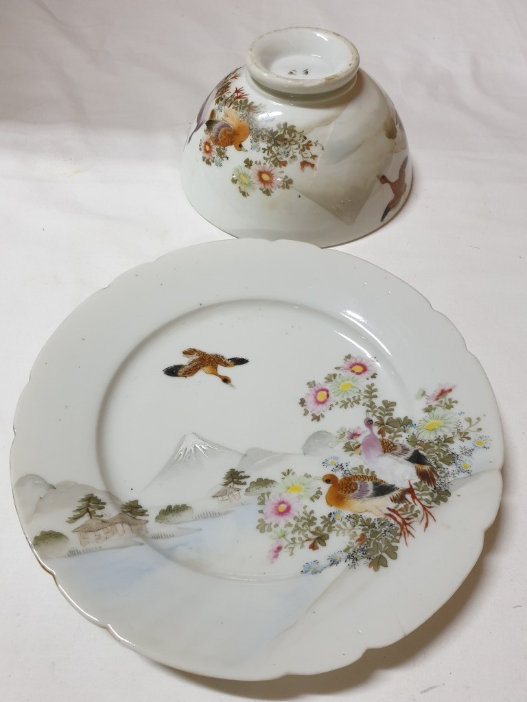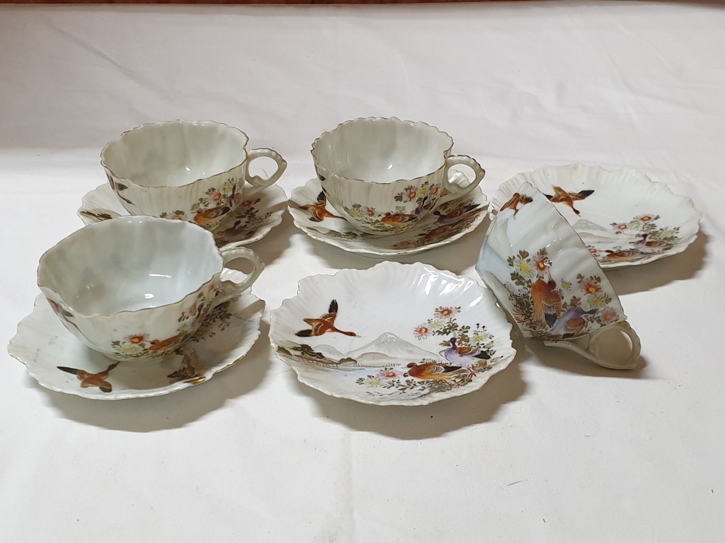Japanese hand painted egg shell porcelain Kutani Ware featuring scenes with birds, lake and Mount Fuji, 5 cups & saucers, 4 tea plates (18cm diameter), 1 larger plate – 21cm, bowl – 16cm x 9, lidded double handled pot – 13cm x 18 overall and jug – 12cm x 15 overall (18pcs)