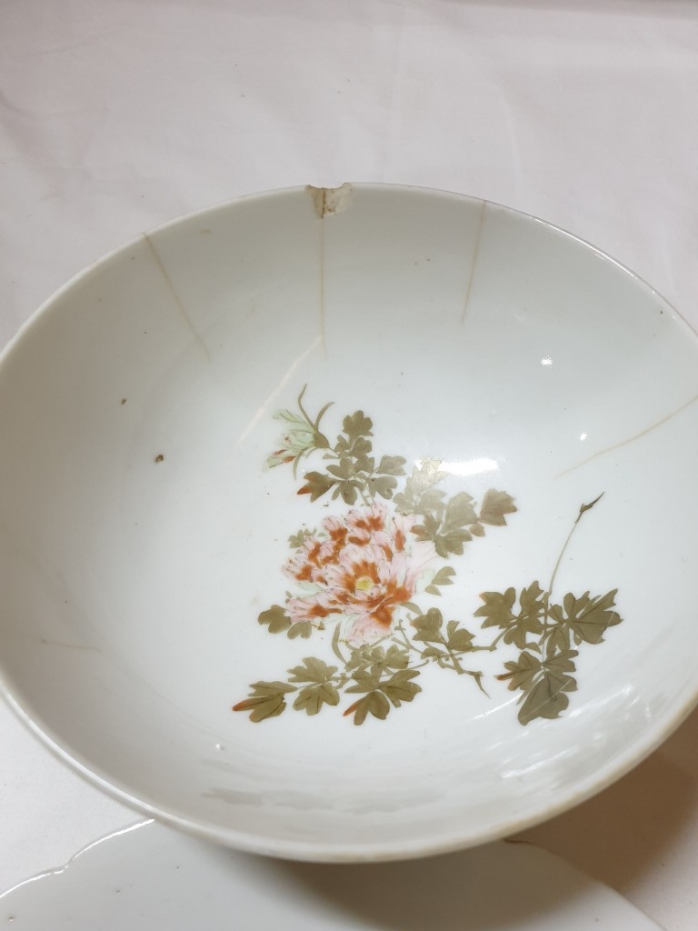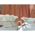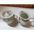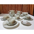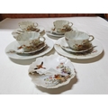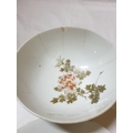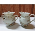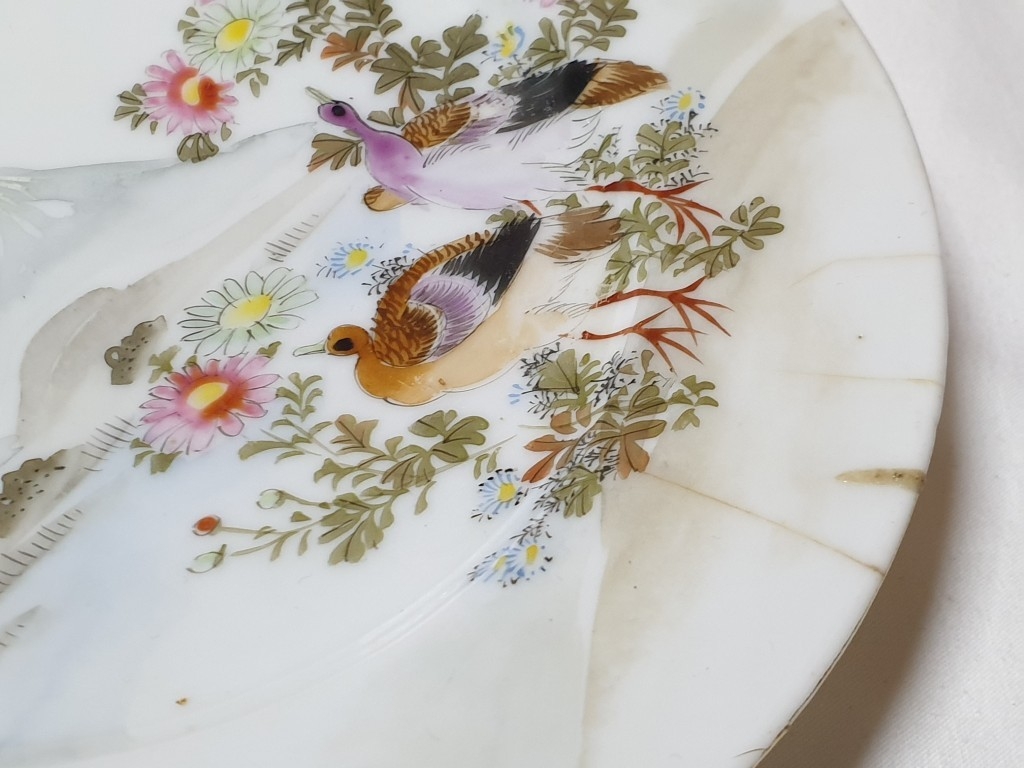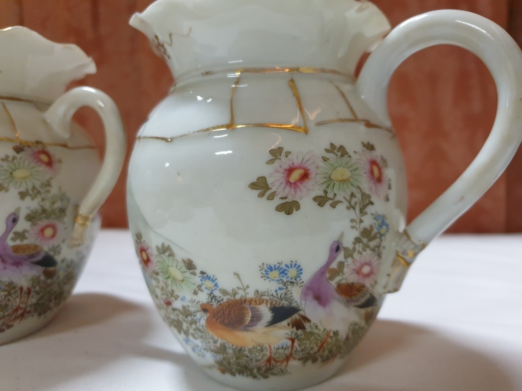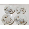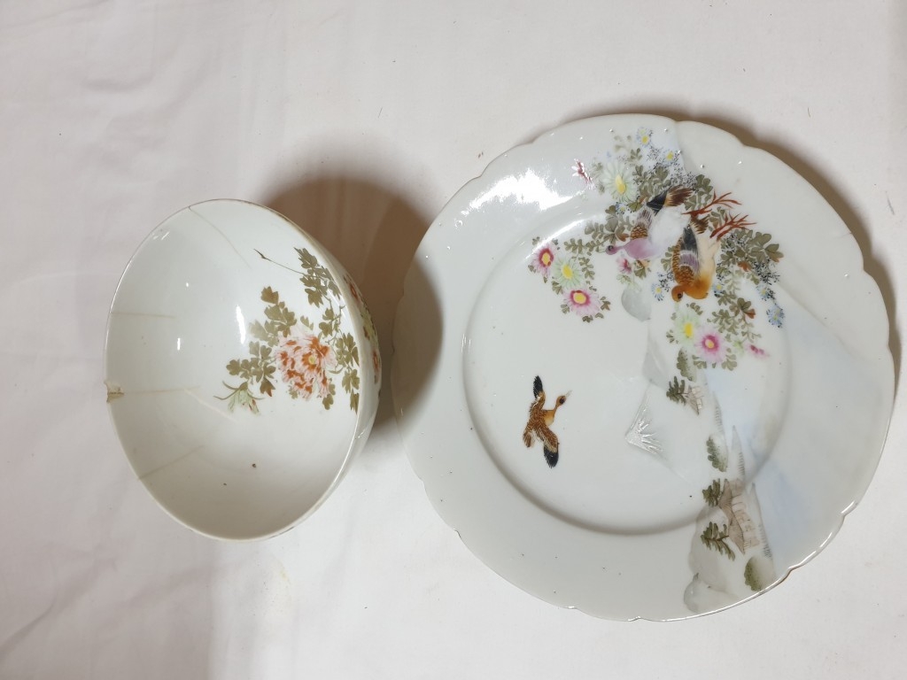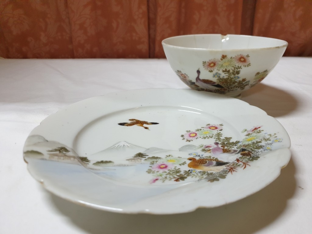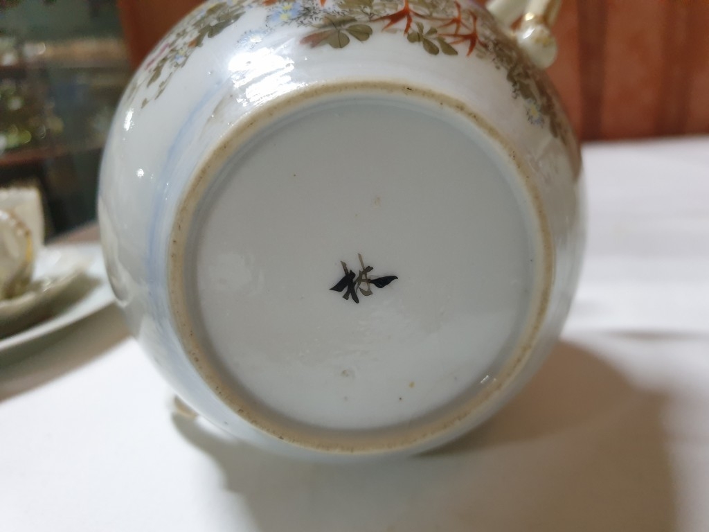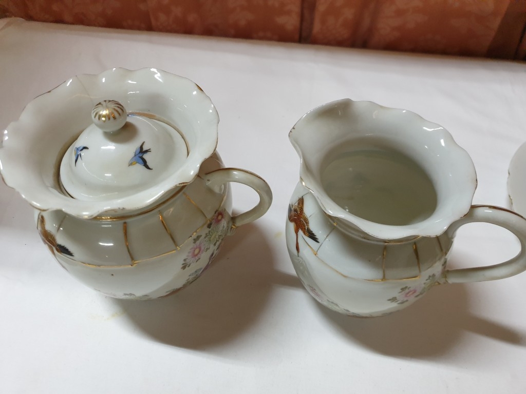 Japanese hand painted egg shell porcelain Kutani Ware featuring scenes with birds, lake and Mount Fuji, 5 cups & saucers, 4 tea plates (18cm diameter), 1 larger plate – 21cm, bowl – 16cm x 9, lidded double handled pot – 13cm x 18 overall and jug – 12cm x 15 overall (18pcs)