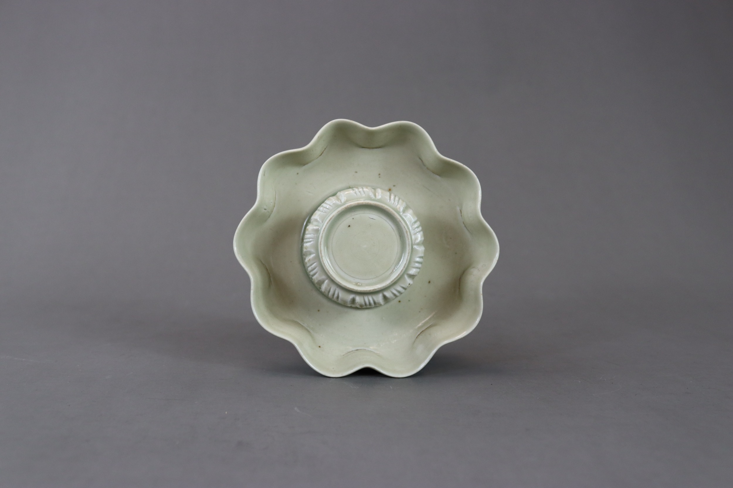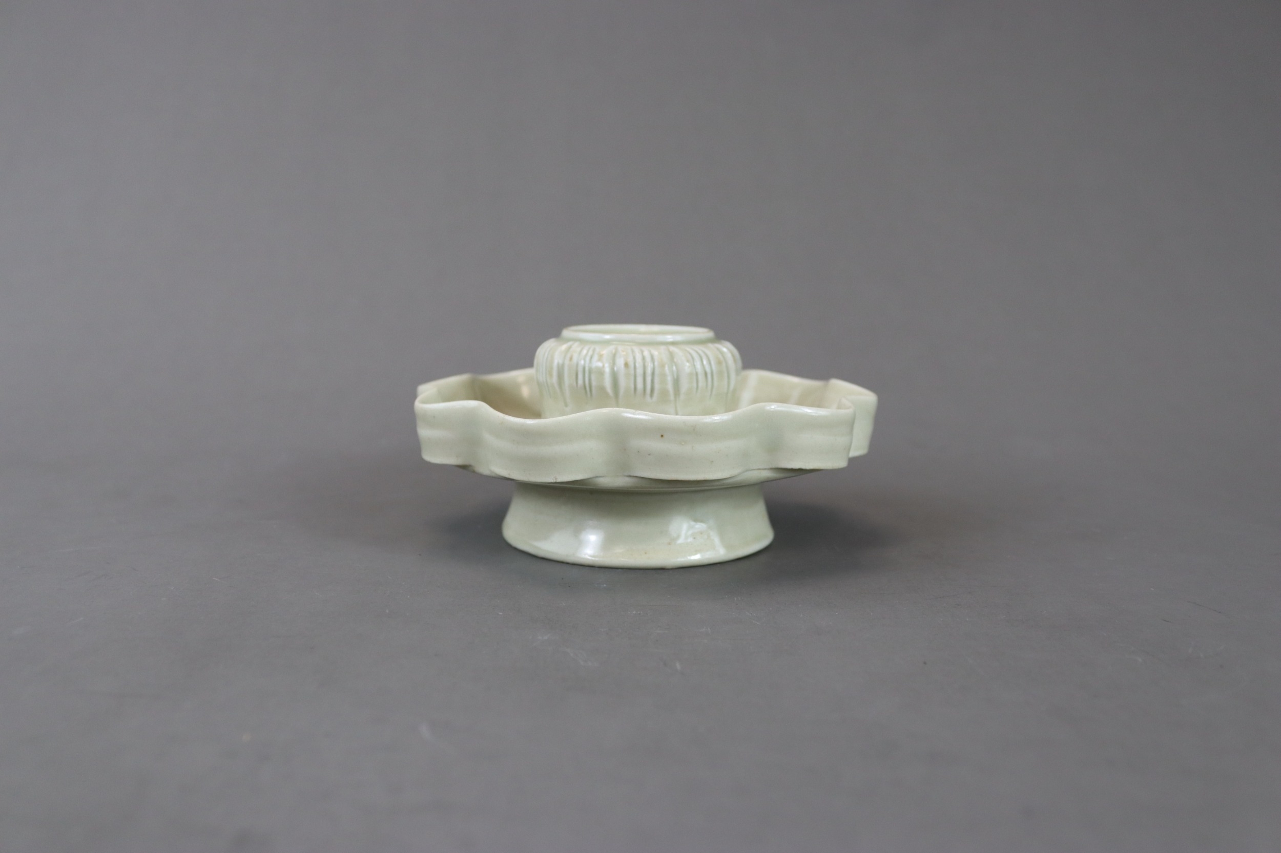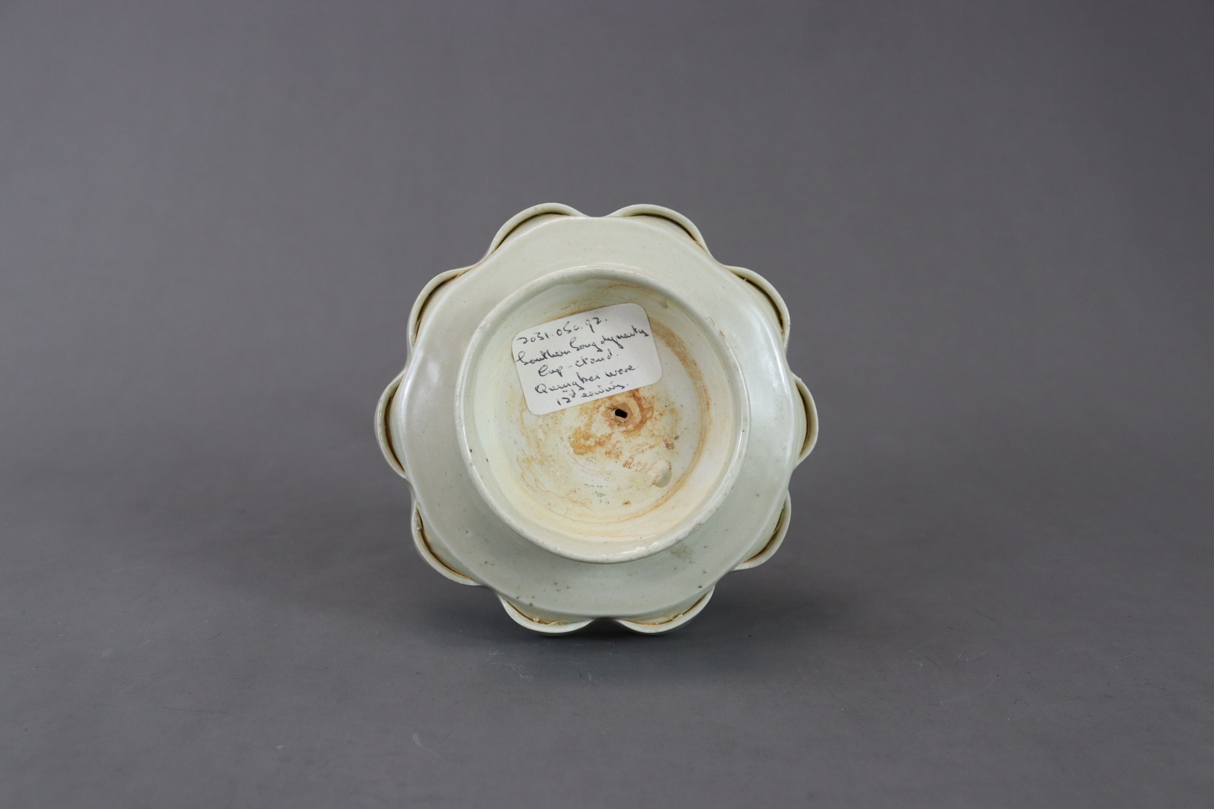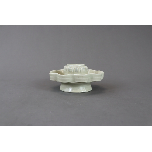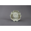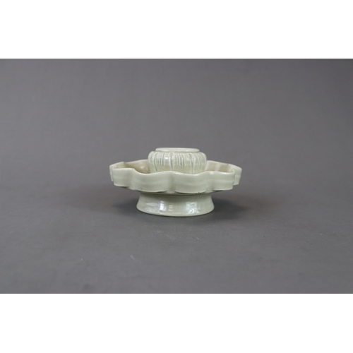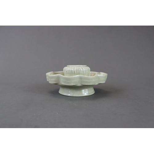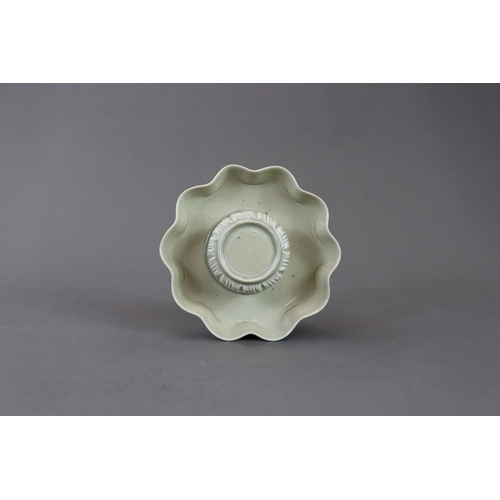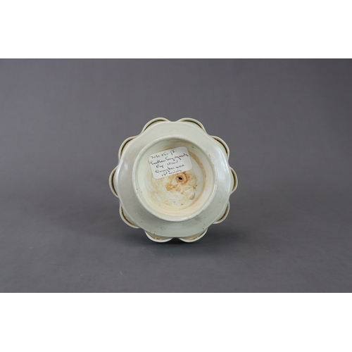 A Qingbai Cupstand, Song dynasty flaring from a high, flared foot to an upturned petal lobed rim, supporting the high lobed cup stand, and covered overall by a light yellowish-green glaze with patches of green where it has pooled or been more thickly applied, the base unglazed H:6cm, W:13cm