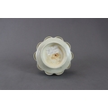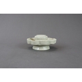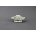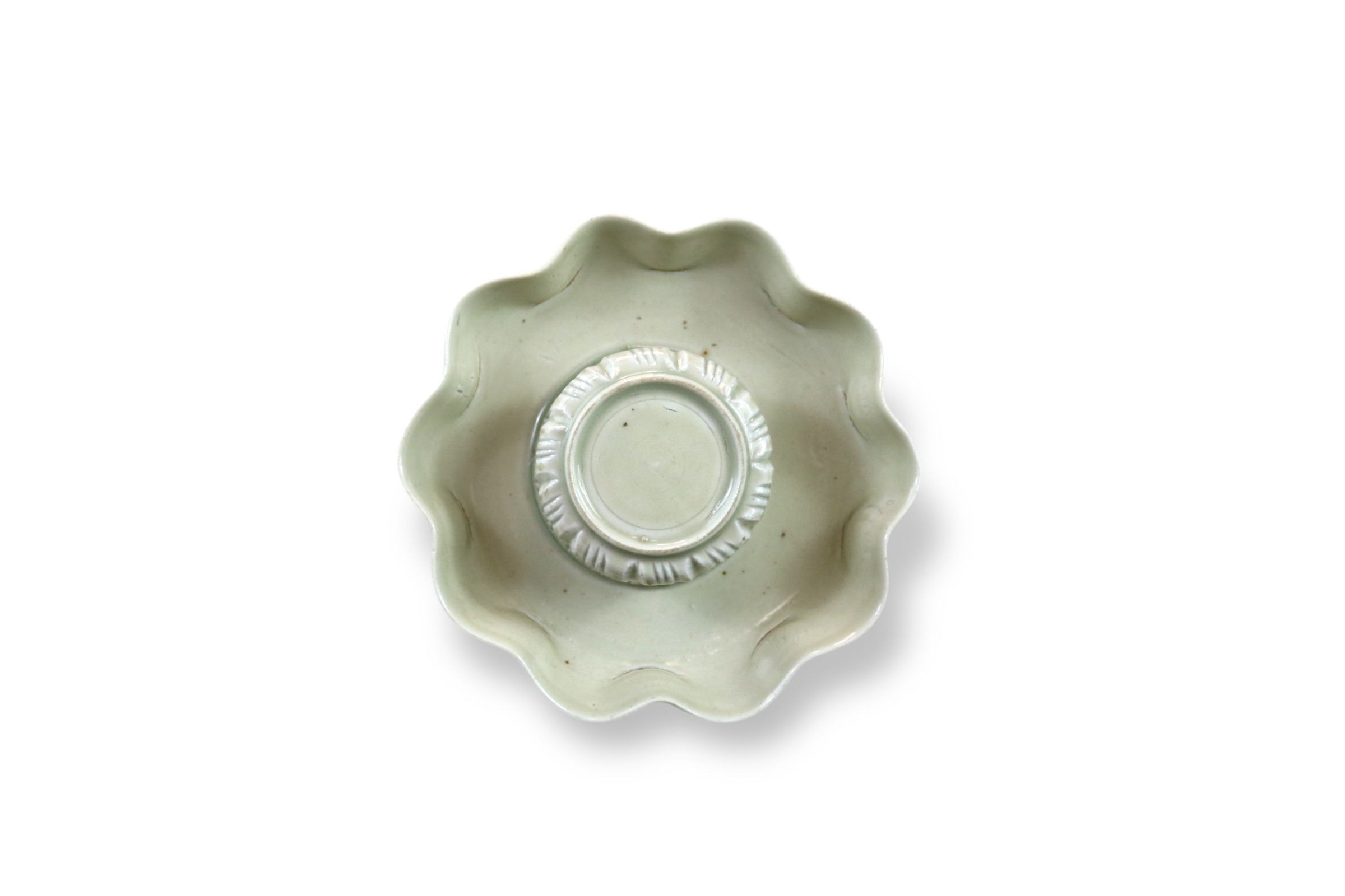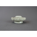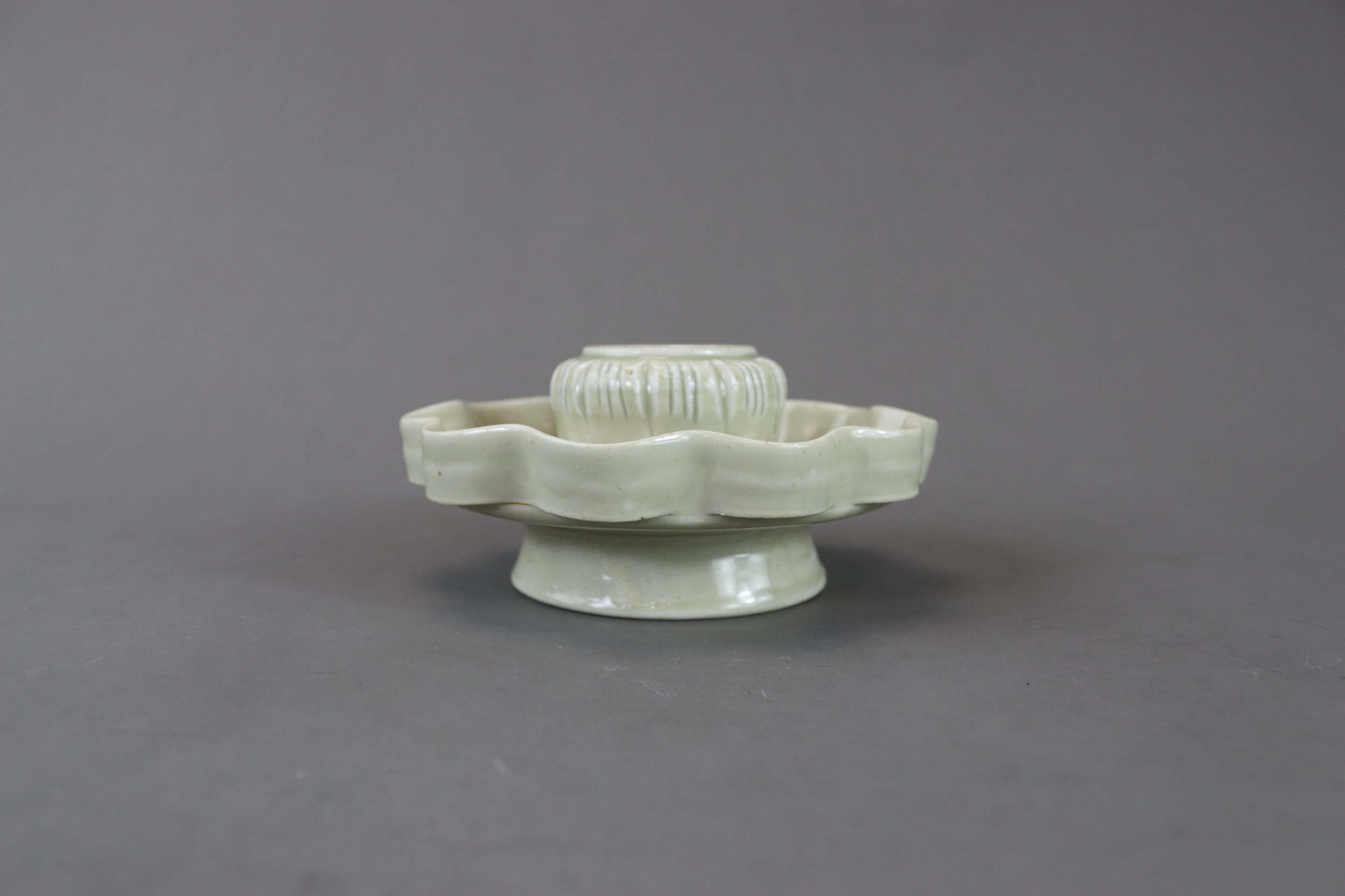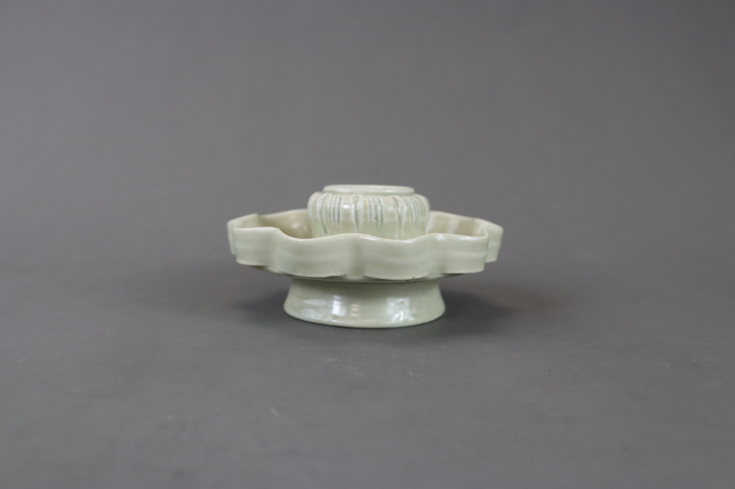 A Qingbai Cupstand, Song dynasty flaring from a high, flared foot to an upturned petal lobed rim, supporting the high lobed cup stand, and covered overall by a light yellowish-green glaze with patches of green where it has pooled or been more thickly applied, the base unglazed H:6cm, W:13cm