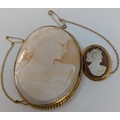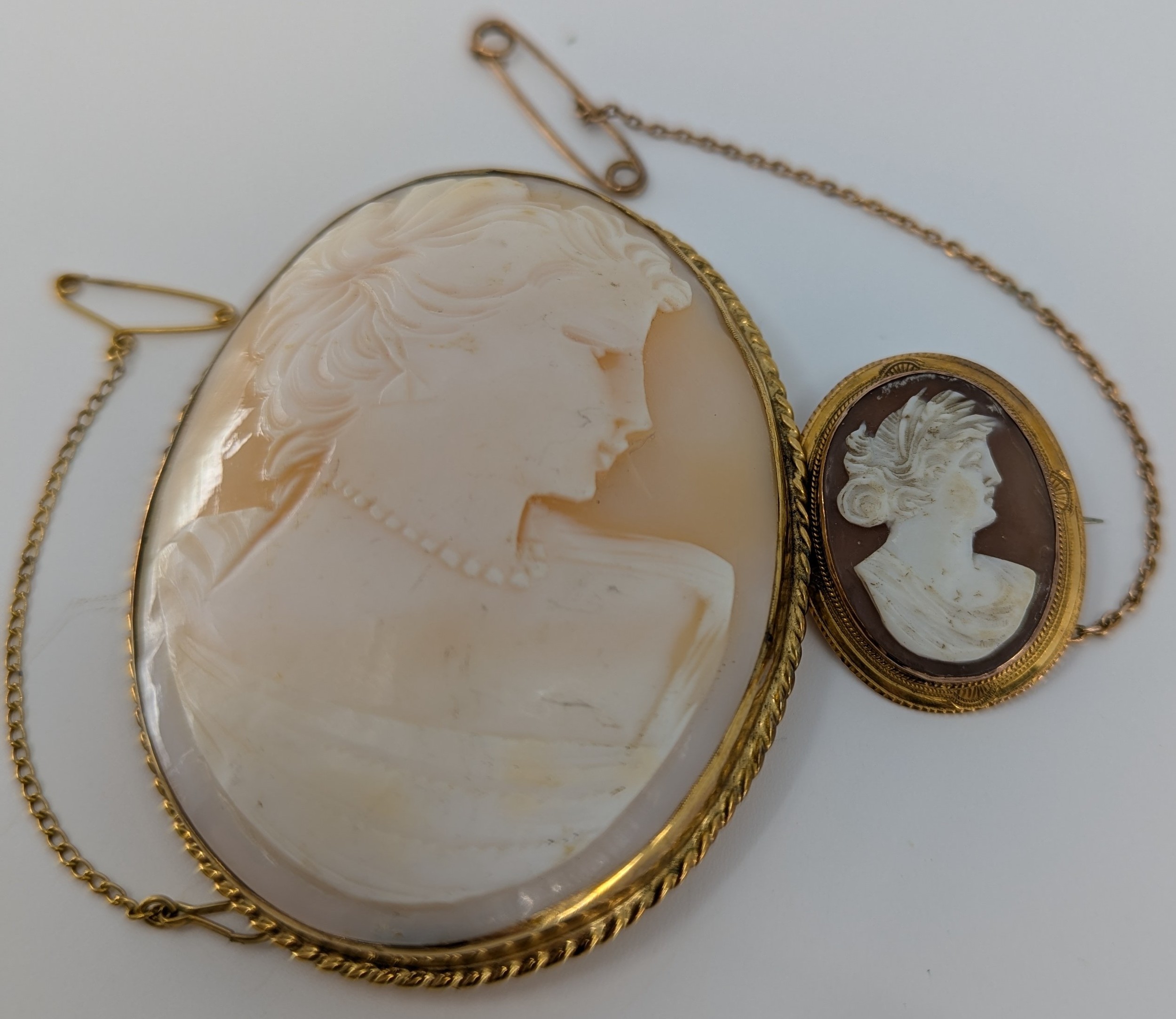 to include a large "9CT" stamped gold mounted oval shell cameo brooch of a right facing lady in high relief, measuring approx. 6.9cm's max height x 5.4cm's max width, safety chain, approx. 29g gross, also a small "9CT" stamped gold mounted oval shell cameo brooch of a right racing lady in high relief, measuring approx. 3cm's max height x 2.3cm's max width, safety chain, approx. 5.8g gross, a/f