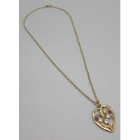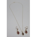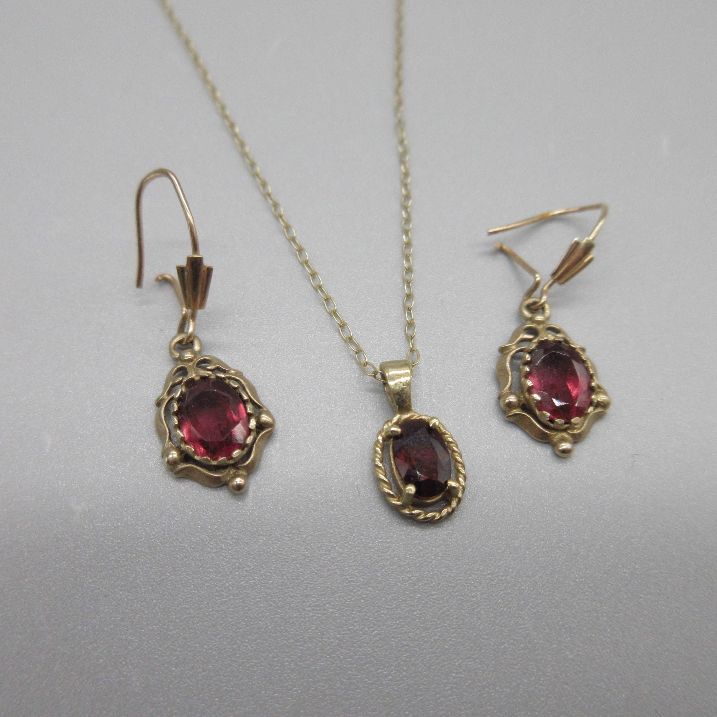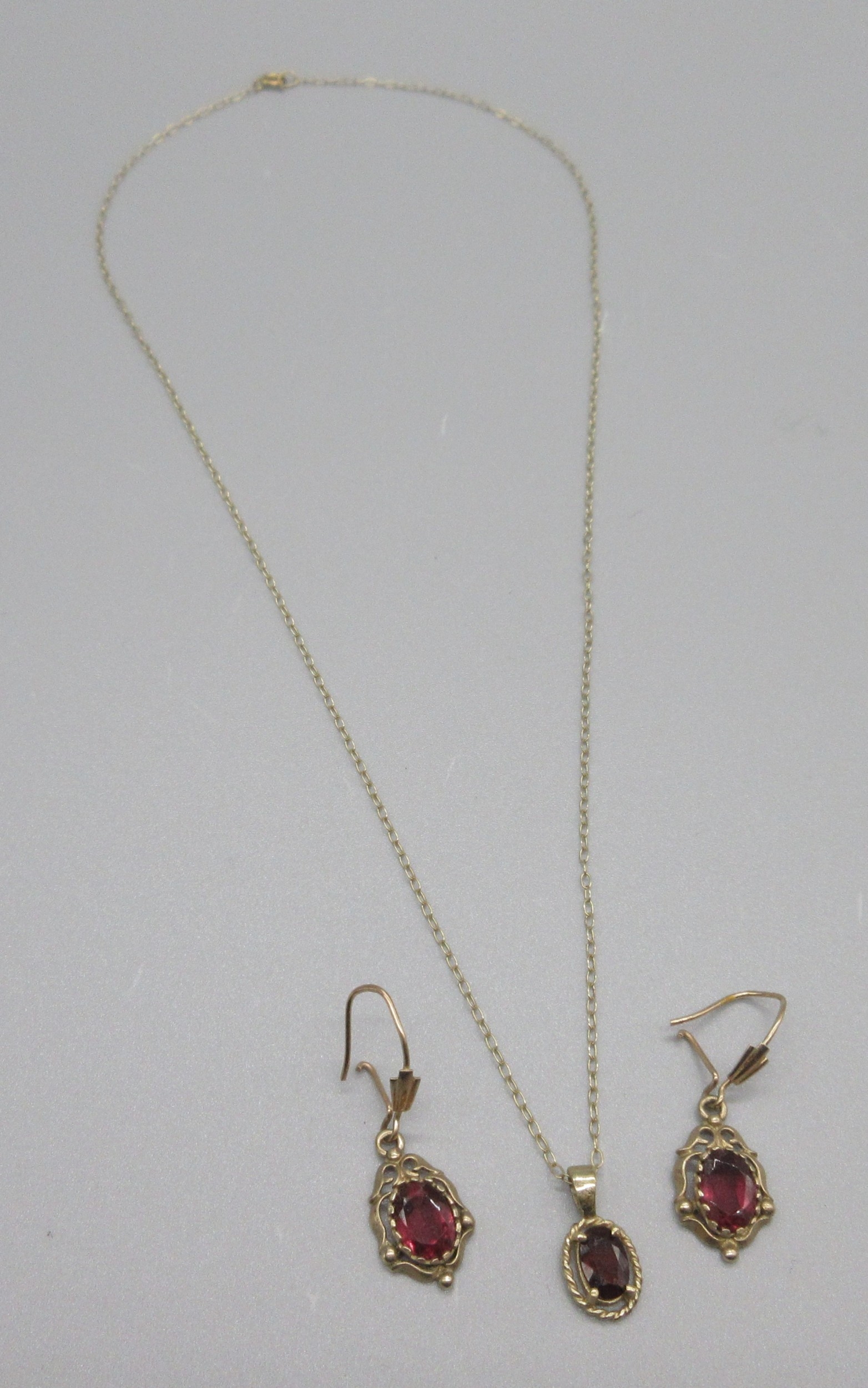 9ct yellow gold necklace and earring duo with drop pendants set with red stones, stamped 375, L40.5cm, 2.6g