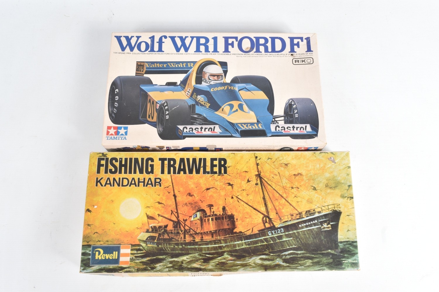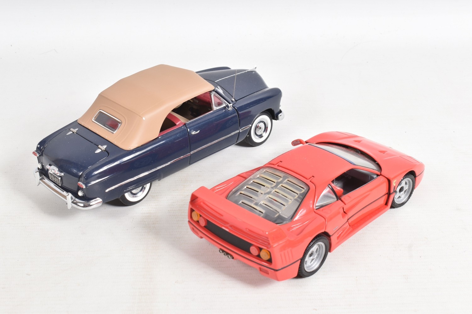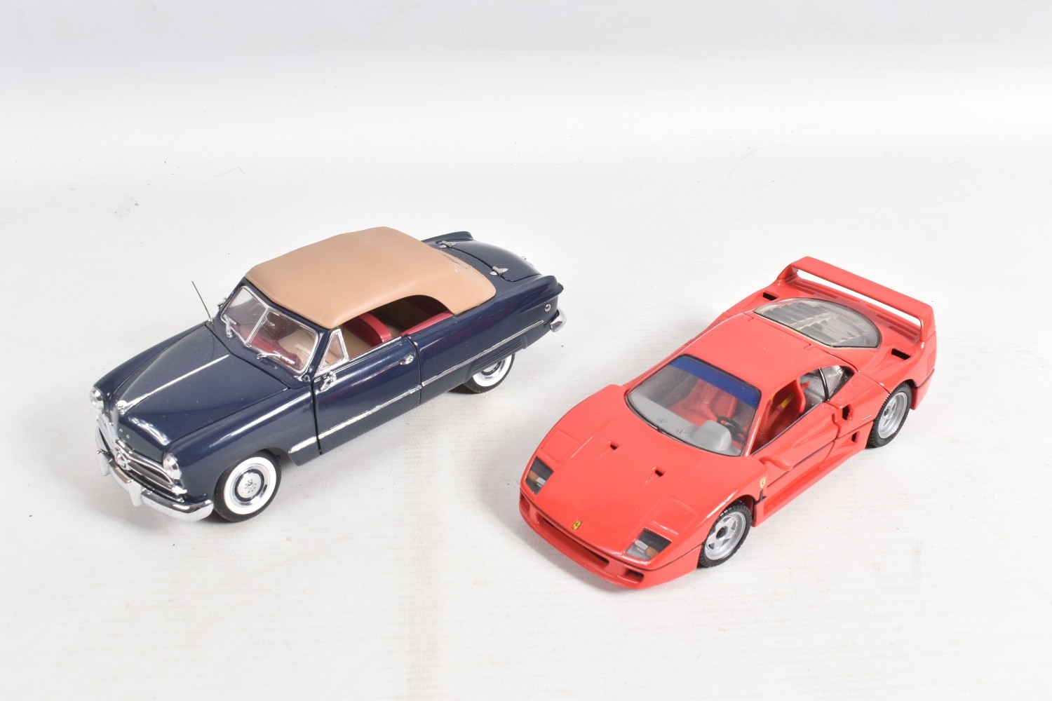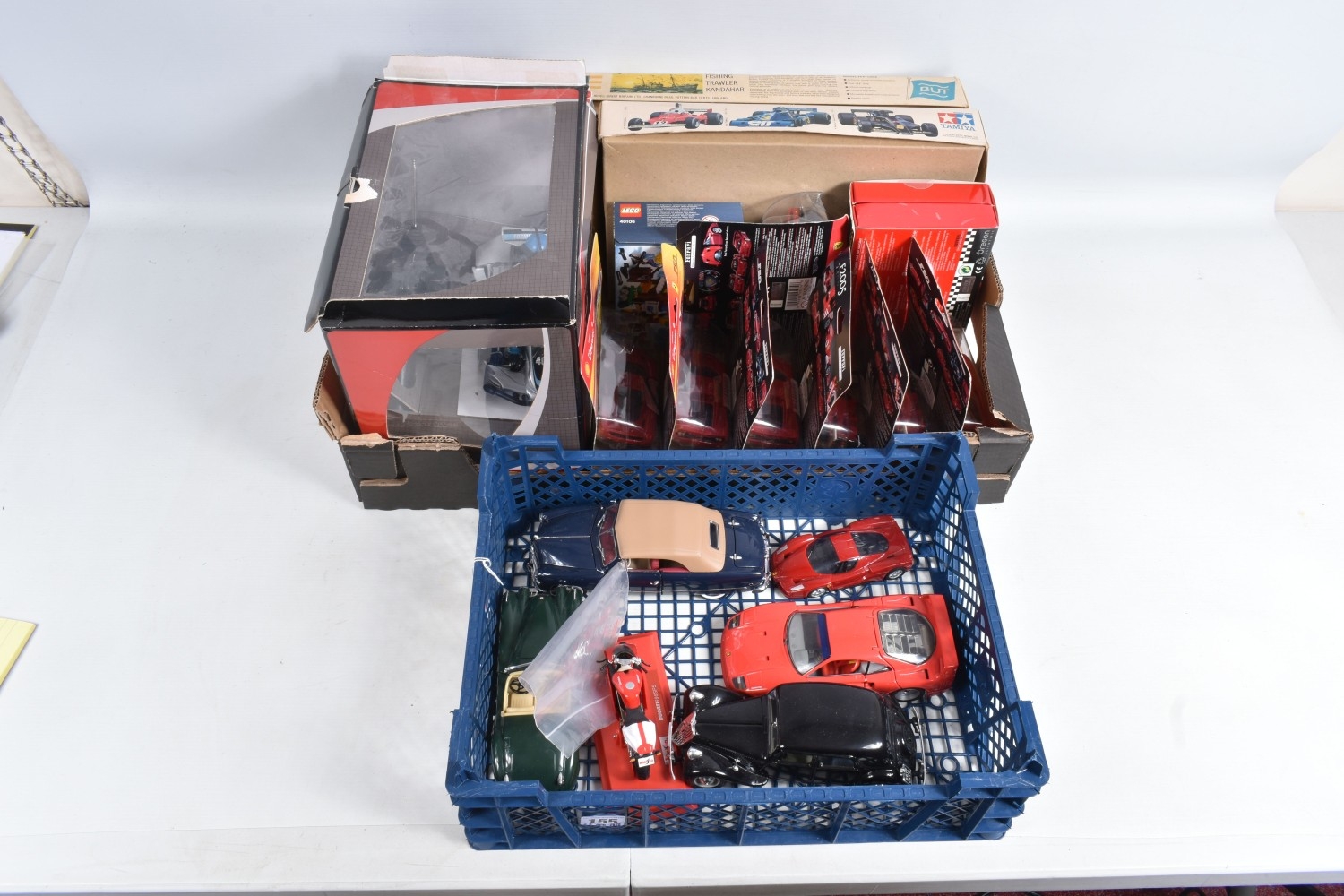 A QUANTITY OF DIECAST VEHICLES AND OTHER TOYS, to include unboxed Franklin Mint 1/24 scale 1949 Ford Convertible, appears complete and in very good condition except that the Spot Light from just in front of the driver's door has broken off, but is present in plastic bag along with the folded roof, Franklin Mint 1/24 scale Ferrari F40, appears complete and in very good condition except that passenger side door mirror is missing, neither car with paperwork or swing tag, but otherwise in very good other unboxed diecast by Bburago, quantity of mainly boxed Shell V Power Ferrai sports car models, two boxed unbuilt plastic construction kits Tamiya 1/20 scale Wolf WR-1 Ford Formula 1 Car, No.GC2006, contents not checked but pieces still sealed in original plastic bay and Revell Fishing Trawler 'Kandahar', No.H-382, scale not given but finished model is over 14¾ long, contents not checked, plastic bag has been opened but majority of pieces appear present, boxes with wear and damage, boxed Oregon Scientific Ferrari branded 'Hockenheim' 500 Lap Stopwatch etc., not tested, has been used but appears in fairly good condition and with instructions, box with minor damage and wear, two boxed small modern Lego sets, Creator set No.40106 which is unopened and City set No.60053, which has been opened, contents not checked, boxed Marks and Spencer radio control 'Pro-Kart', not tested but appears complete with controller and in good condition, box with damage and wear (2 boxes)
