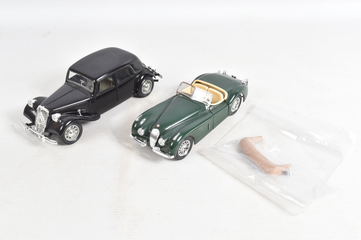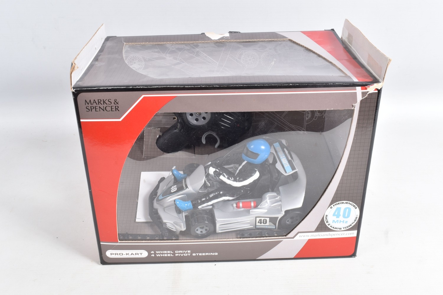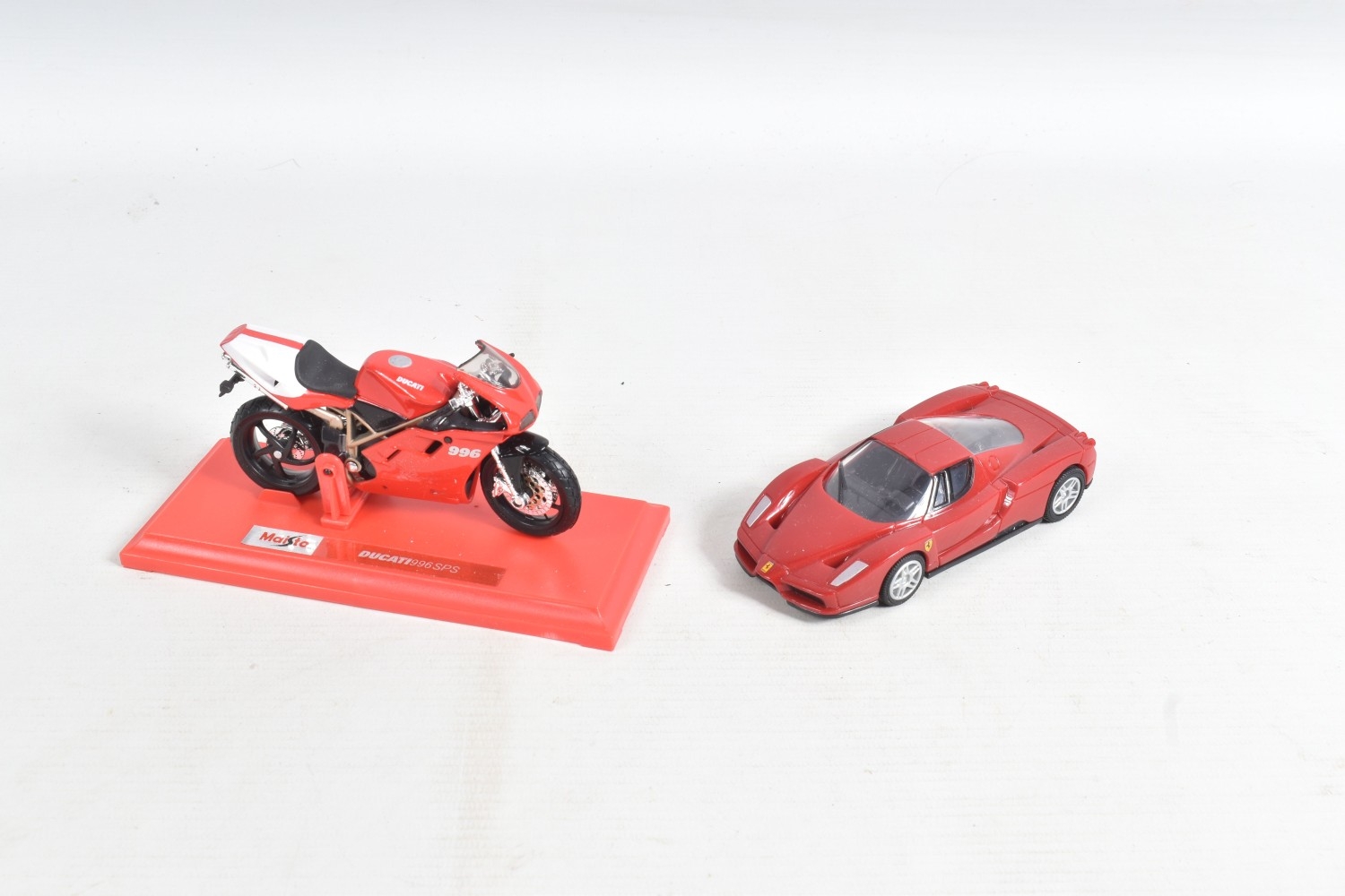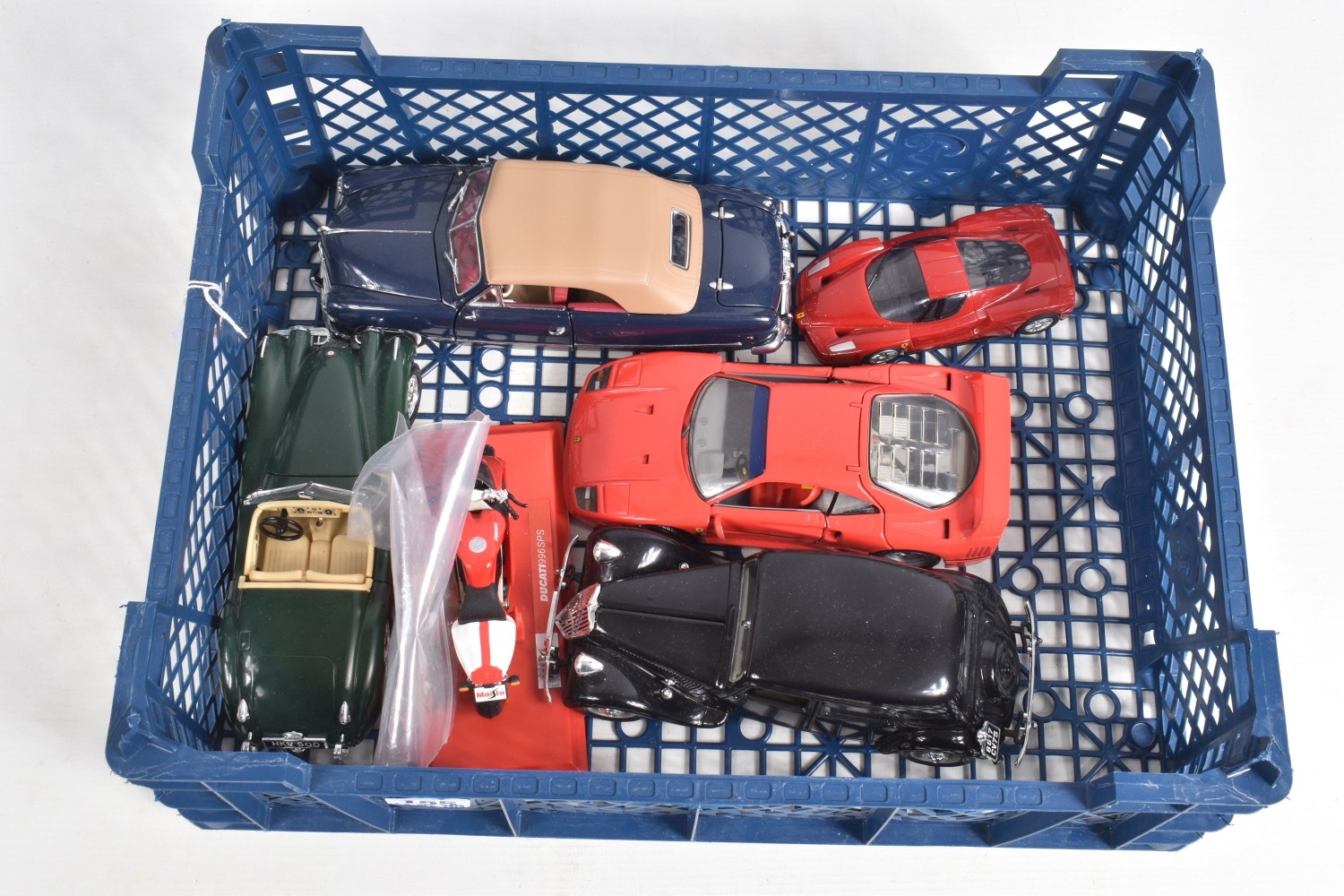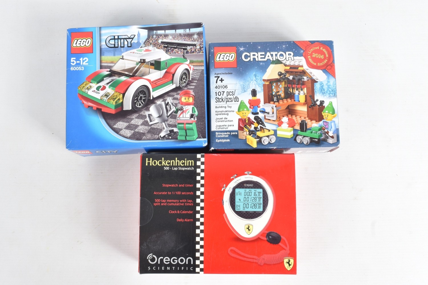 A QUANTITY OF DIECAST VEHICLES AND OTHER TOYS, to include unboxed Franklin Mint 1/24 scale 1949 Ford Convertible, appears complete and in very good condition except that the Spot Light from just in front of the driver's door has broken off, but is present in plastic bag along with the folded roof, Franklin Mint 1/24 scale Ferrari F40, appears complete and in very good condition except that passenger side door mirror is missing, neither car with paperwork or swing tag, but otherwise in very good other unboxed diecast by Bburago, quantity of mainly boxed Shell V Power Ferrai sports car models, two boxed unbuilt plastic construction kits Tamiya 1/20 scale Wolf WR-1 Ford Formula 1 Car, No.GC2006, contents not checked but pieces still sealed in original plastic bay and Revell Fishing Trawler 'Kandahar', No.H-382, scale not given but finished model is over 14¾ long, contents not checked, plastic bag has been opened but majority of pieces appear present, boxes with wear and damage, boxed Oregon Scientific Ferrari branded 'Hockenheim' 500 Lap Stopwatch etc., not tested, has been used but appears in fairly good condition and with instructions, box with minor damage and wear, two boxed small modern Lego sets, Creator set No.40106 which is unopened and City set No.60053, which has been opened, contents not checked, boxed Marks and Spencer radio control 'Pro-Kart', not tested but appears complete with controller and in good condition, box with damage and wear (2 boxes)