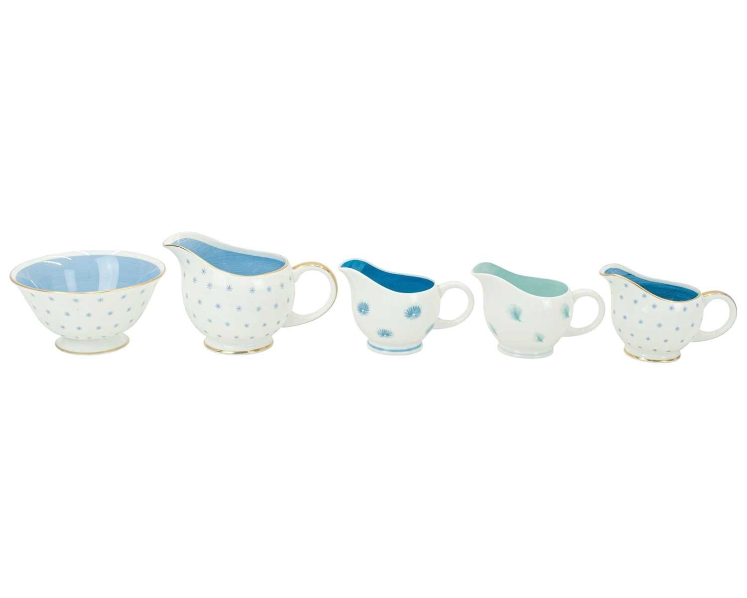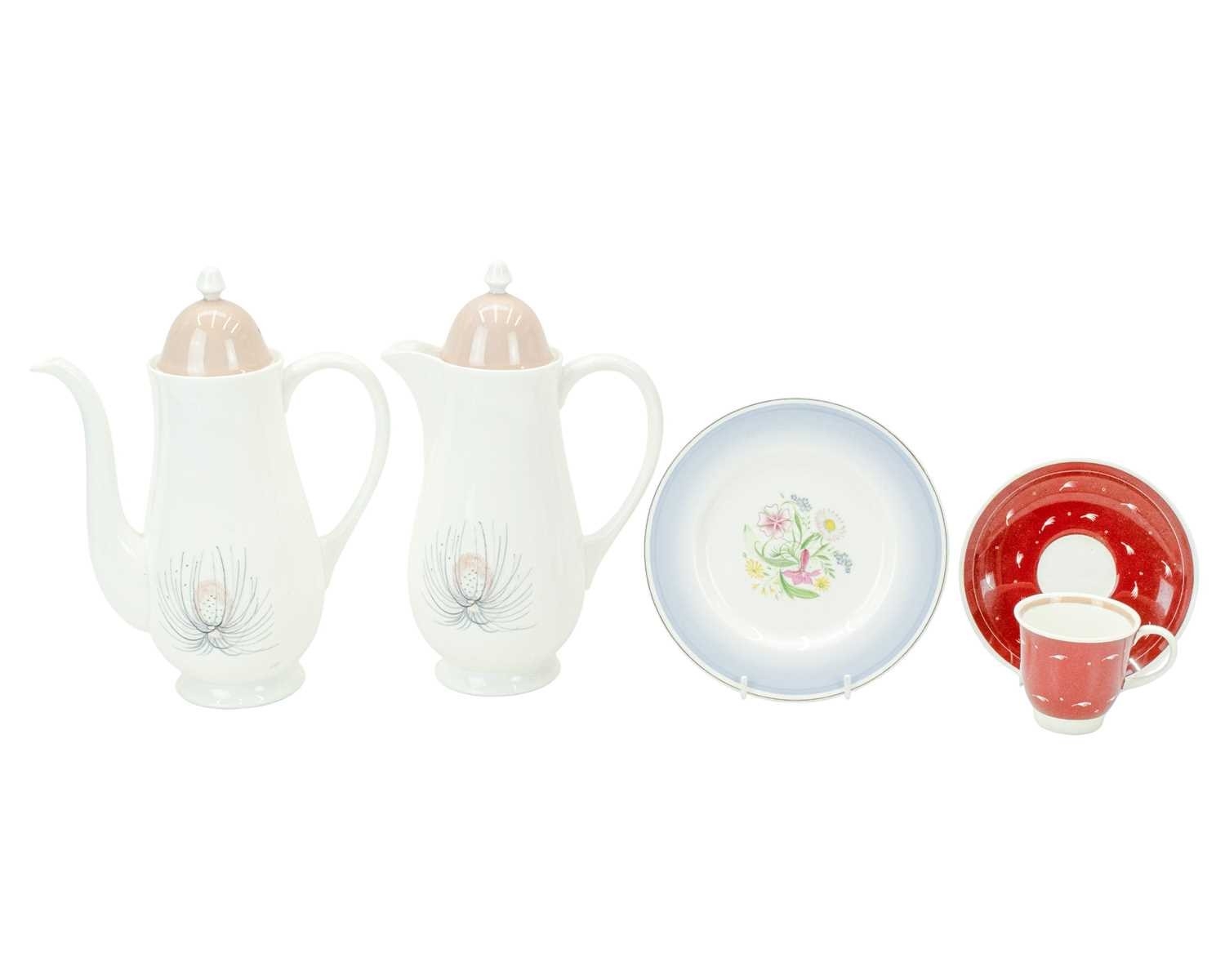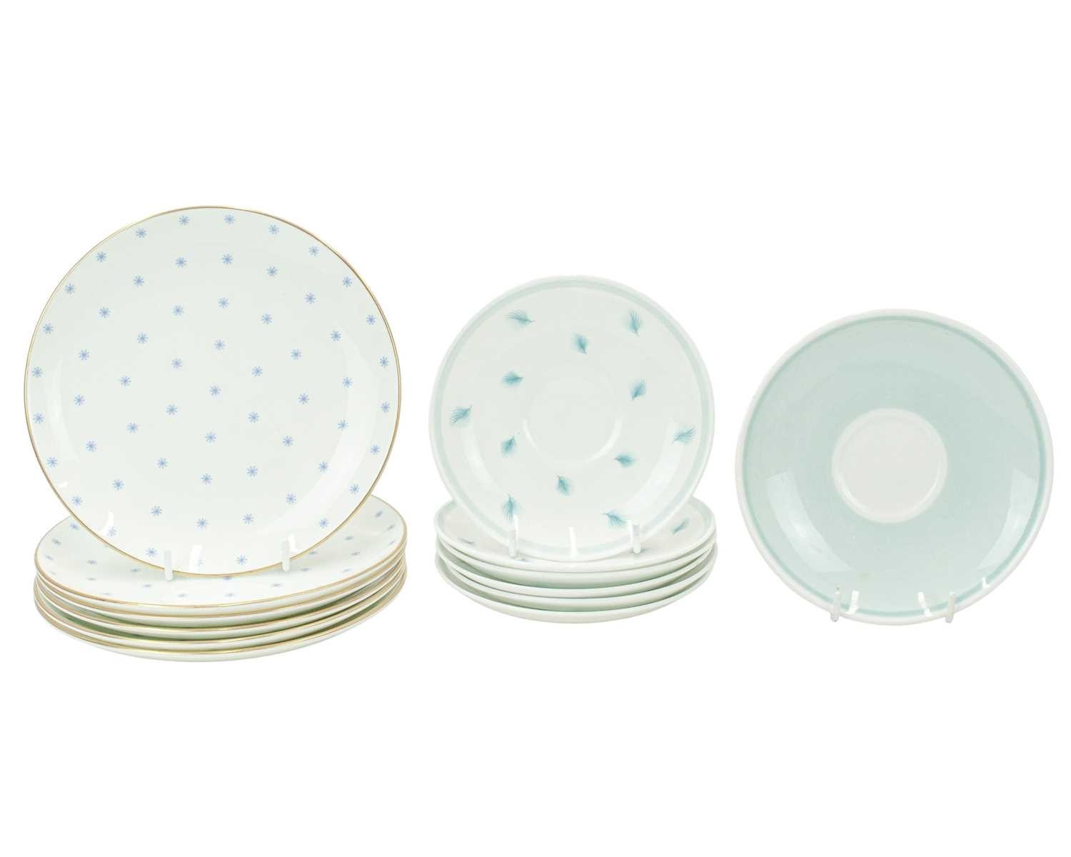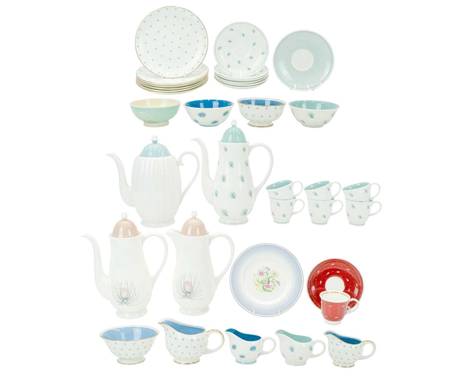 A collection of Susie Cooper ceramics. In various patterns, including 'One O'Clocks', 'Whispering Grass', 'Star Burst Blue Stars', 'Teazle', with a ribbed coffee pot and other designs.