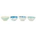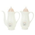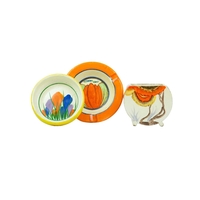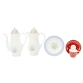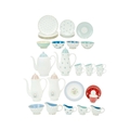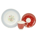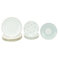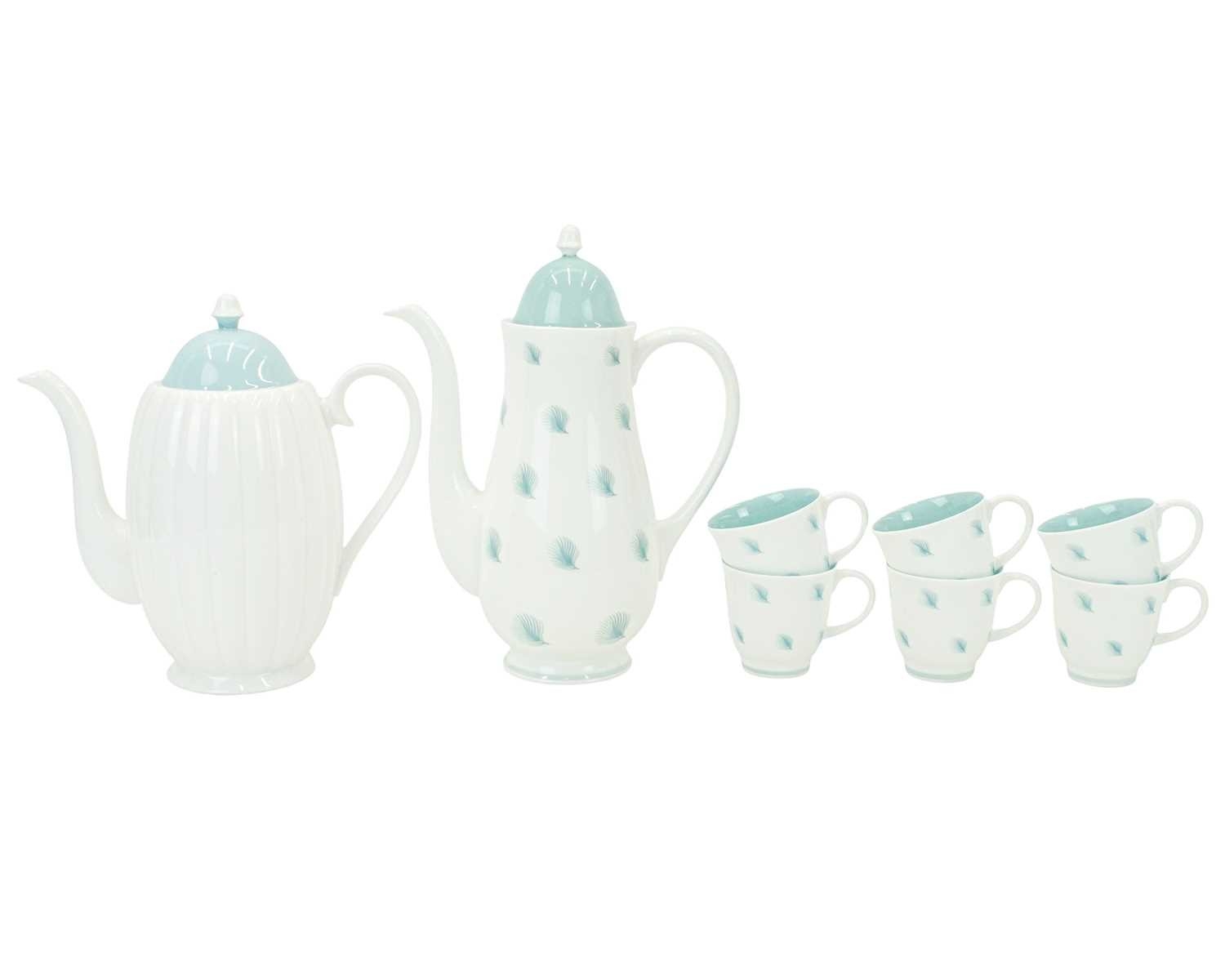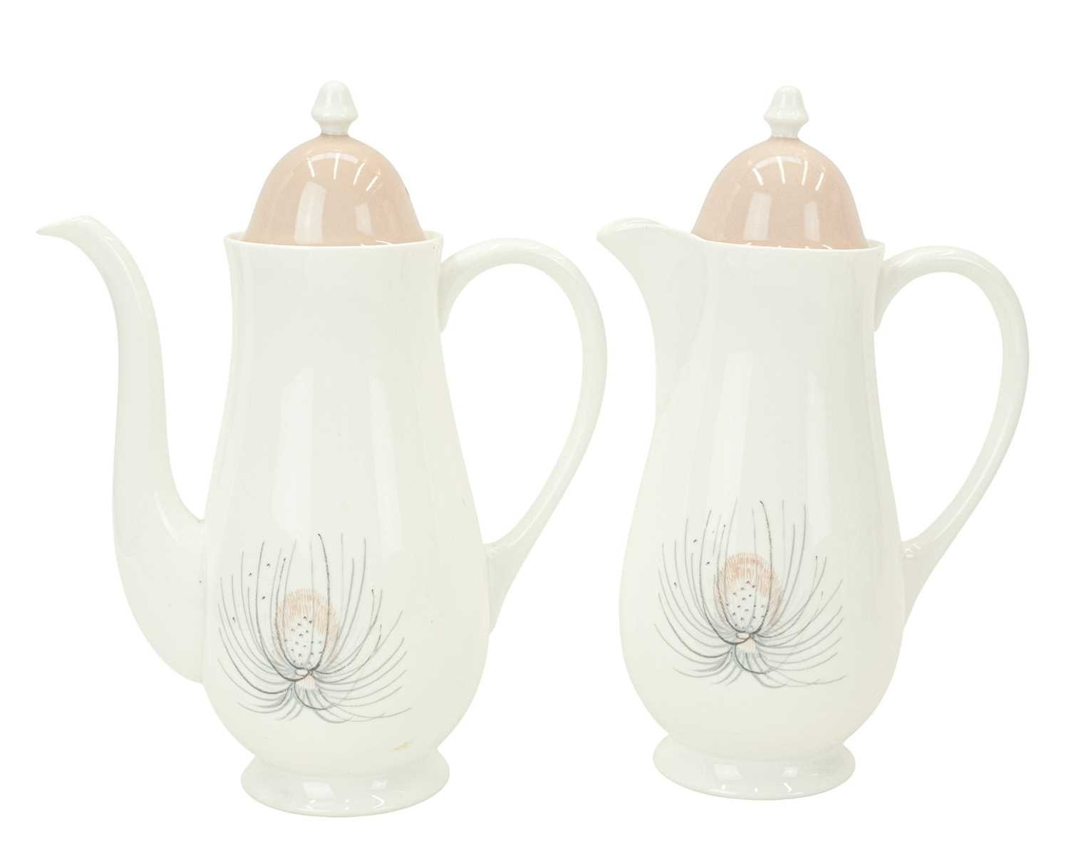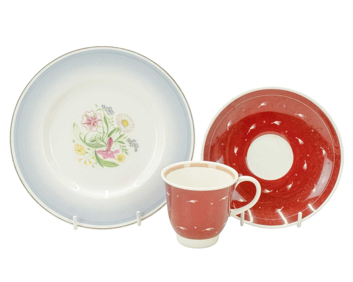 A collection of Susie Cooper ceramics. In various patterns, including 'One O'Clocks', 'Whispering Grass', 'Star Burst Blue Stars', 'Teazle', with a ribbed coffee pot and other designs.