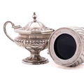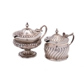 An Edward VII silver Art Nouveau mustard pot by Samuel Walton Smith, Birmingham 1902, with blue glass liner and a small Victorian part swirl embossed mustard pot with blue glass liner, 120gms., (3.8ozs.), gross, (2)